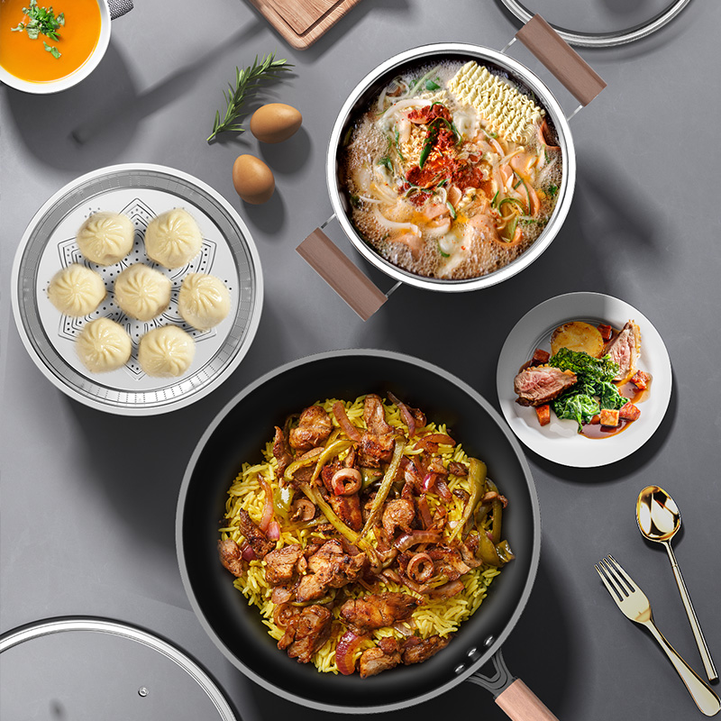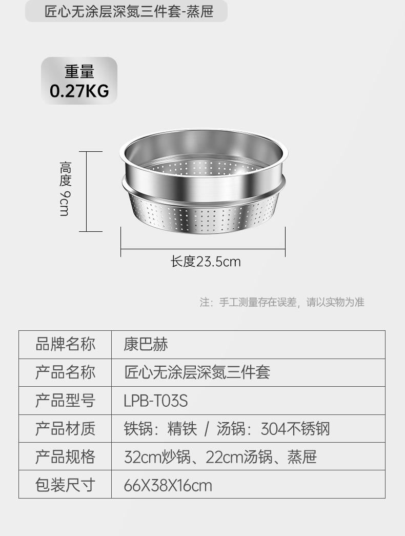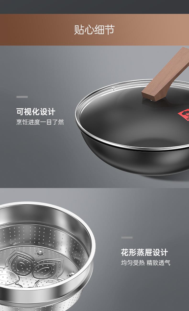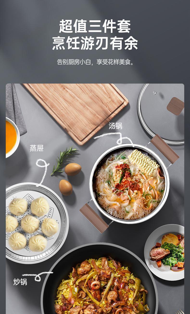 规格:32cm+22cm汤锅+蒸屉 重量:2.2kg+1.24kg+0.27kg 包装尺寸:66cm*38cm*16cm ◎轻优质精铁旋压而成,加强锅身弧度,适合中国人炒菜,猛火爆炒酣畅淋漓; ,防滴耐高温易清洁优质高纯铸铁,受热均匀,各种灶具通用; ◎轻油少烟,健康厨房,轻颠勺无压力; ◎炒锅随心所欲,大小刚刚好,能煎又能炒; ◎锅口反边加宽设计,与锅盖紧密结合,不仅能防止热量流失,更能避免锅壁污垢存积,方便清洗打理; ◎汤锅采用食品级304不锈钢材质,耐腐蚀性好不添加任何涂层,给家人0距离的健康守护,底部立体环形聚热既可蒸又可煮;