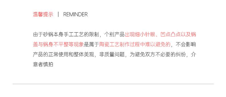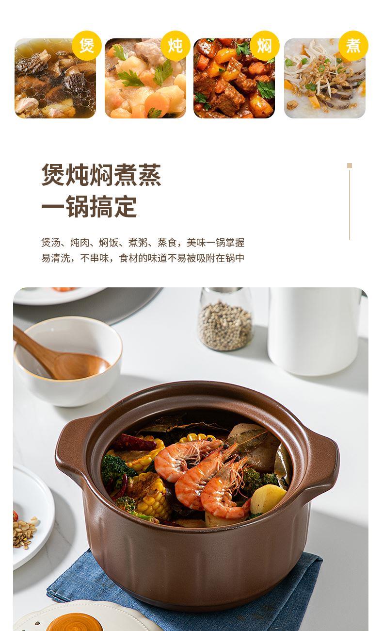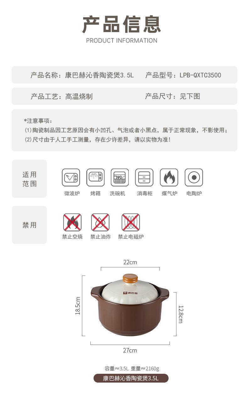 【型号】LPB-QXTC3500 【材质】陶瓷 【规格】3.5L 【包装方式】彩盒 【外箱尺寸】290*220*290mm 【重量】3.5kg 【条码】6957929941232 【配置】3.5L陶瓷煲*1 每一口都是自然的馈赠,养生砂锅,炖出食材的原汁原味。采用天然陶土,经过匠心工艺,耐高温,保温强,锁住营养不流失。。 不论是炖汤、煮粥还是焖菜,都能轻松驾驭,美味又健康。给你和家人贴心的关怀,让每一餐都充满爱的味道。 可放心放入烤箱、微波炉和洗碗机,注,电磁炉不可用。