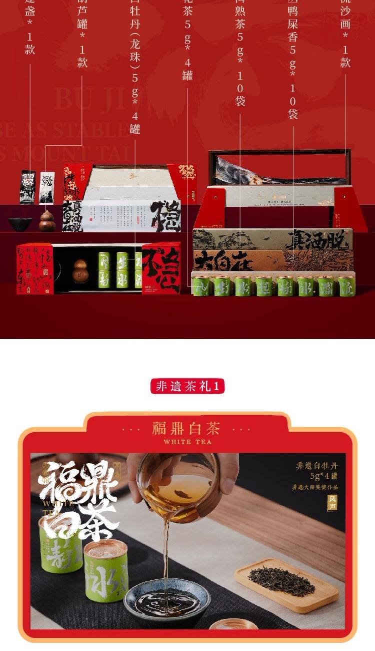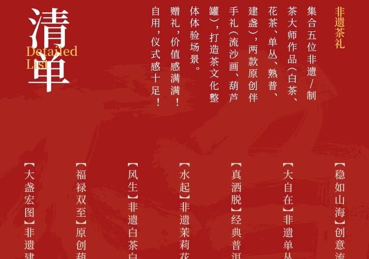 【大盏宏图】非遗建盏*1款 【福禄双生至】原创葫芦罐*1款 【风生】非遗白茶白牡丹(龙珠)5g*4罐 【水起】非遗茉莉花5g*4罐 【真洒脱】经典普洱熟茶5g*10袋 【大自在】非遗单丛鸭屎香5g*10袋 【稳如山海】创意流沙画*1款