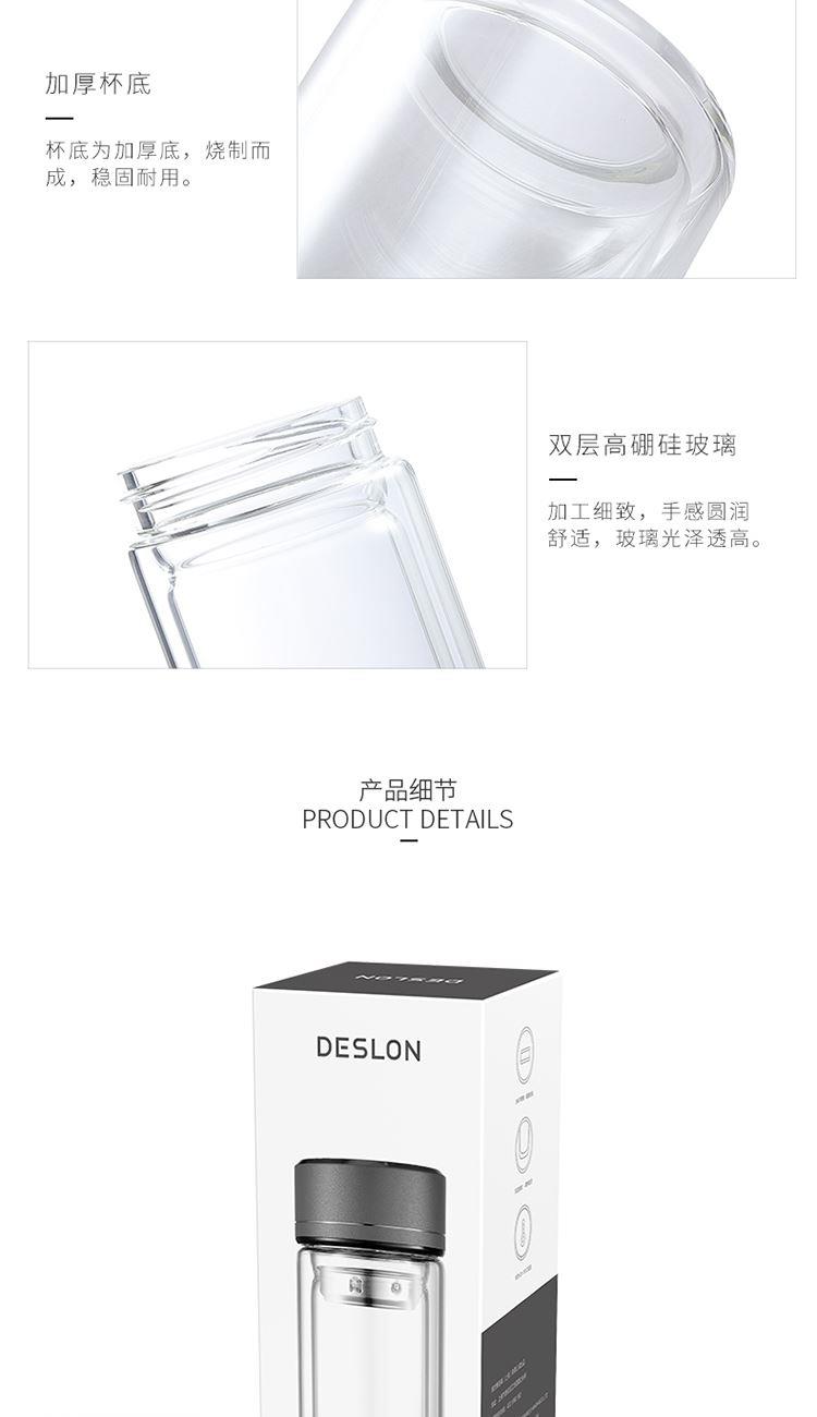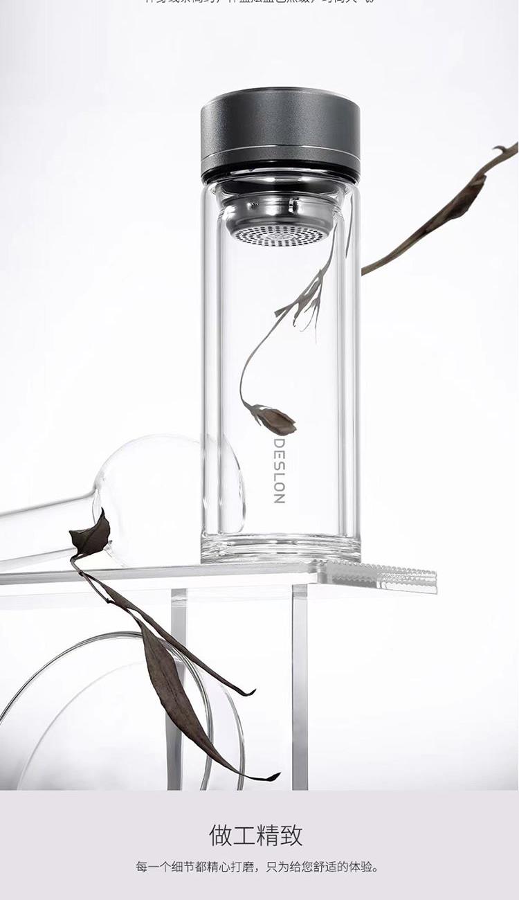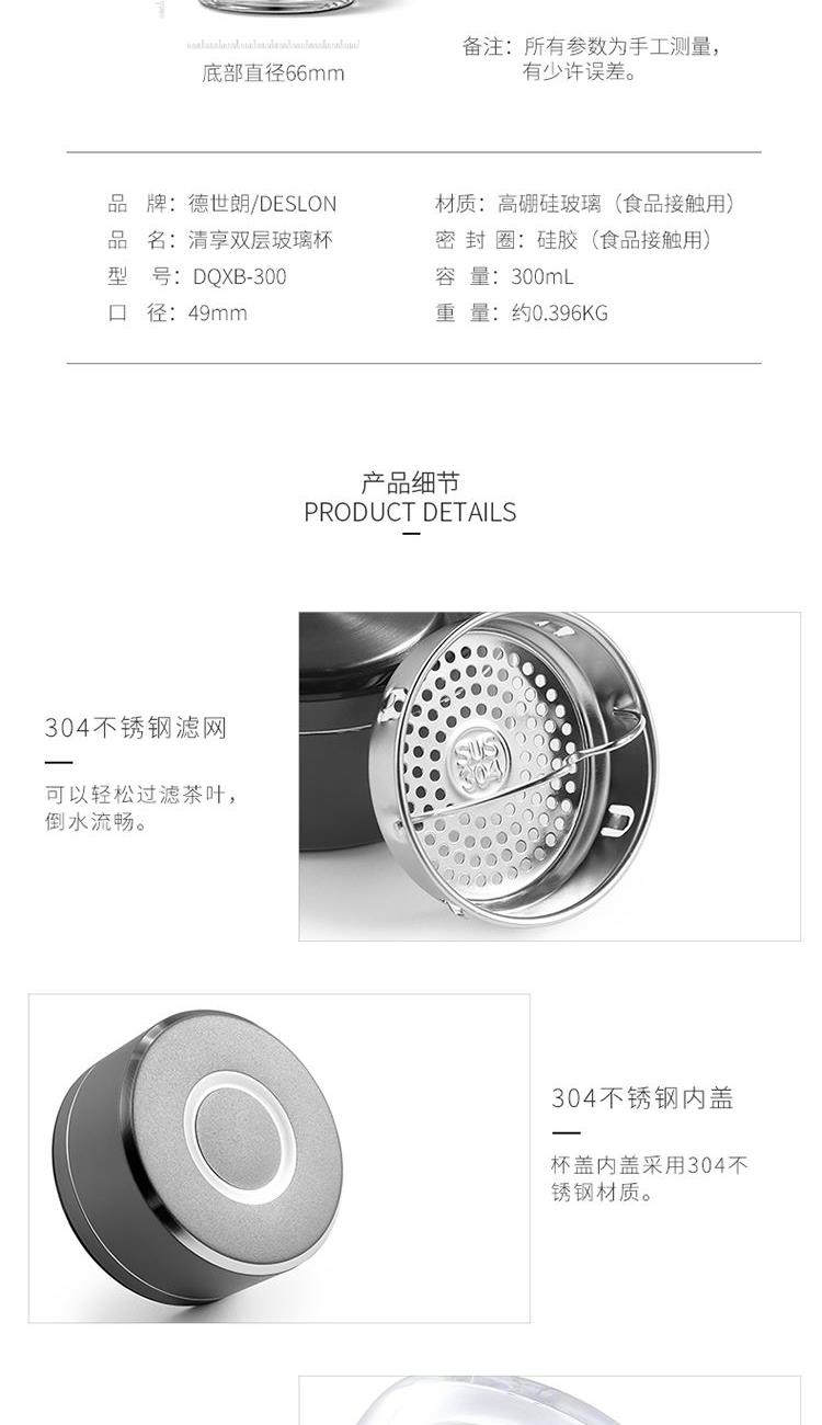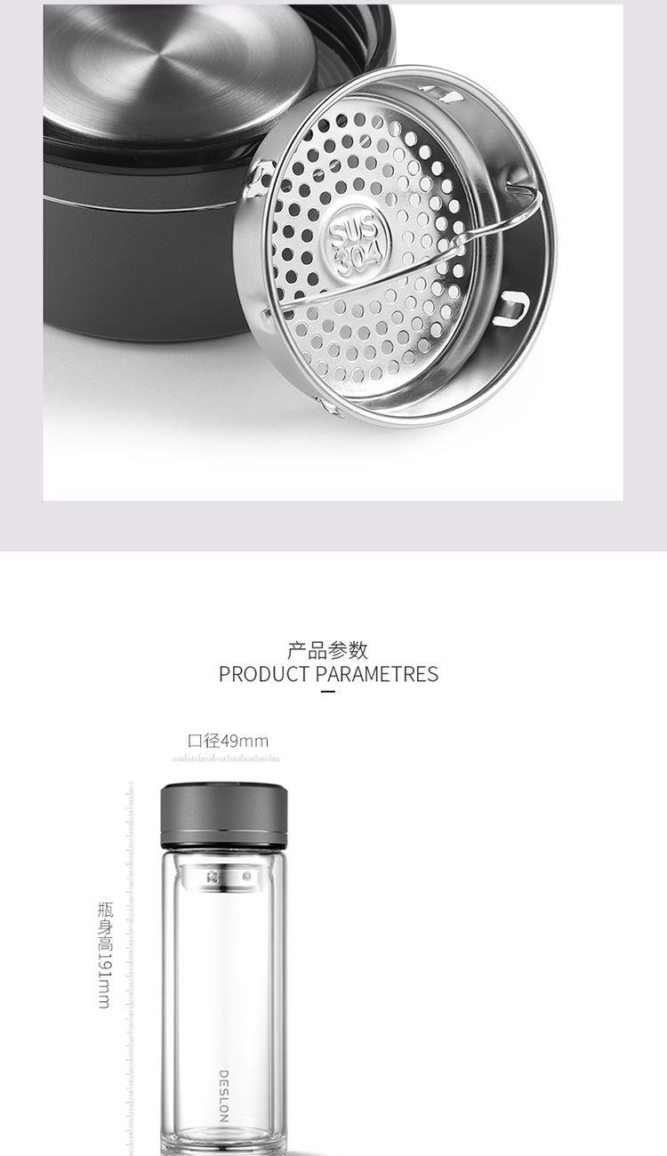 产品容量:300mL 产品口径:内4.9cm 杯体材质:高硼硅玻璃(食品接触用) 滤网材质:奥氏体型不锈钢06Cr19Ni10(食品接触用) 塑 料 件:PP(食品接触用) 密 封 圈:硅胶(食品接触用) 产品特点: 1. 杯盖内盖采用304不锈钢材质,安全卫生,经久耐用; 2. 杯身采用双层高硼硅玻璃,具有良好的隔热效果; 3. 304不锈钢滤网,超精细激光孔压技术,轻松过滤茶叶,杯漏带有提手,便于拆卸清洗; 4. 杯底为水晶厚底,烧制而成,持久耐用; 5. 加工精致,手感圆润舒适,玻璃光泽透亮,经久不褪。