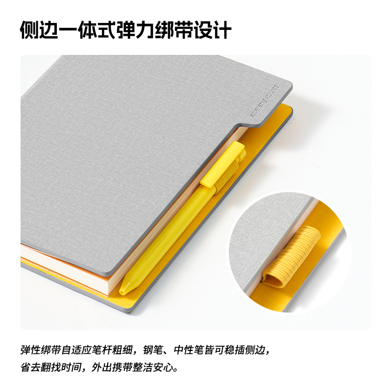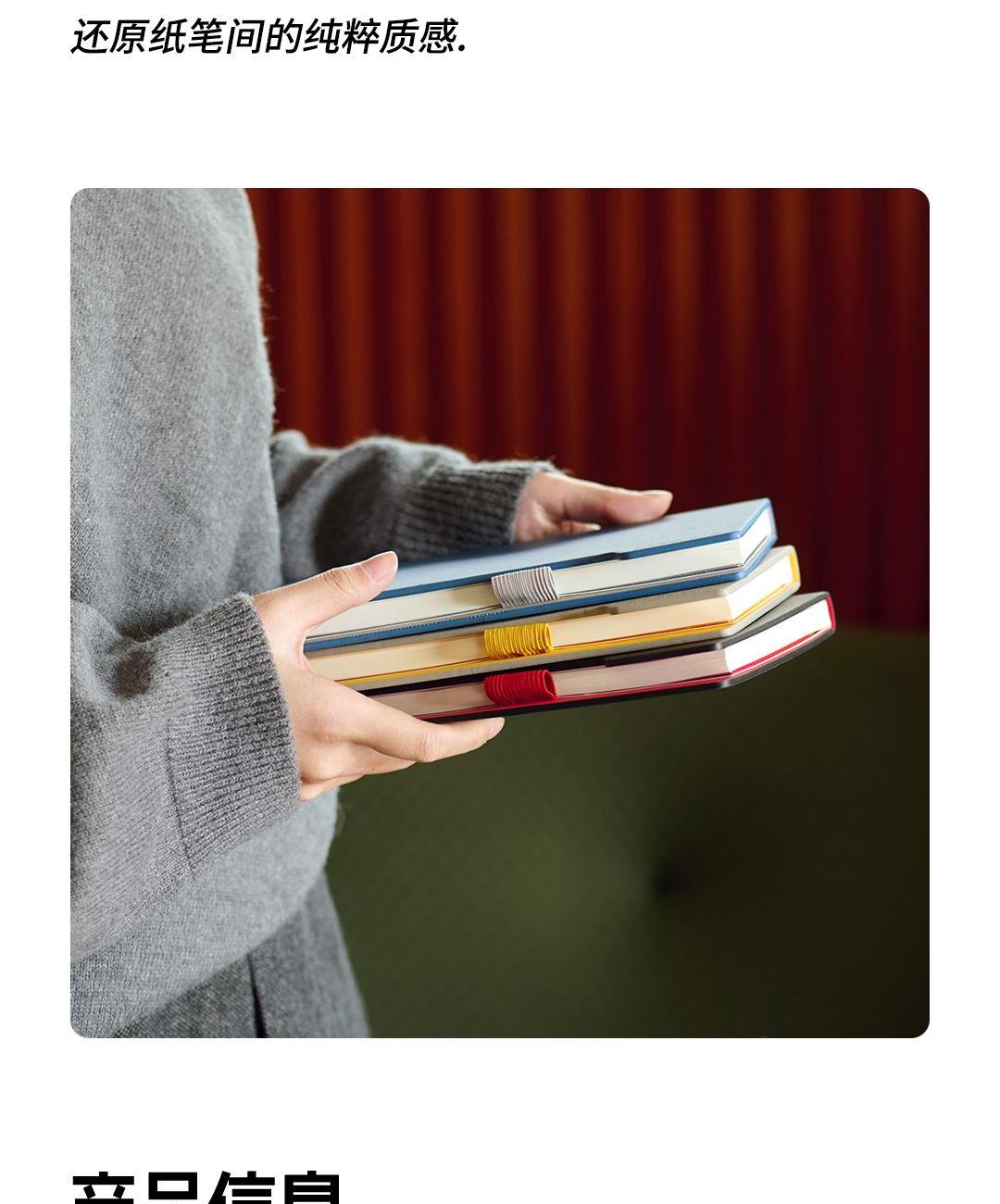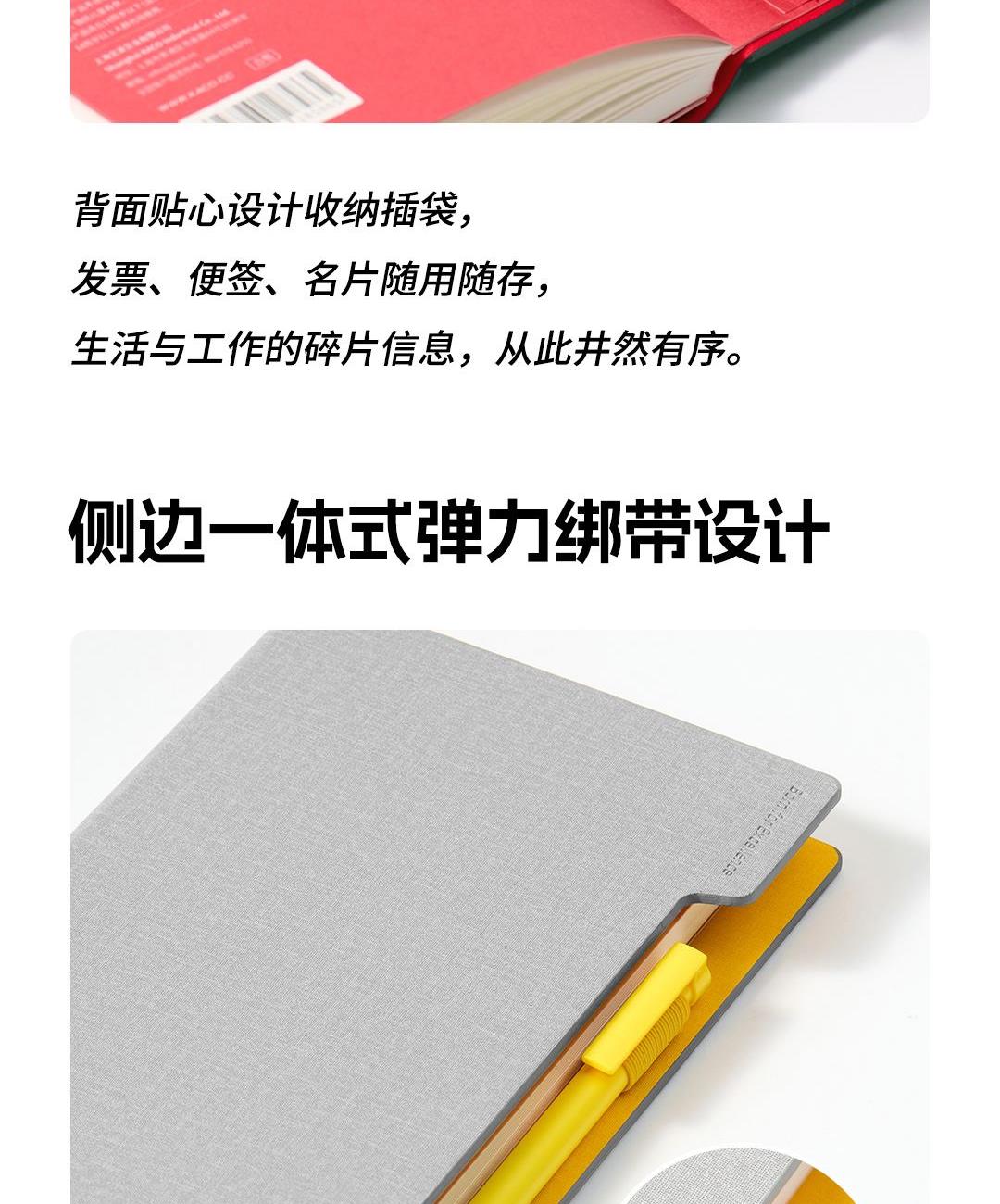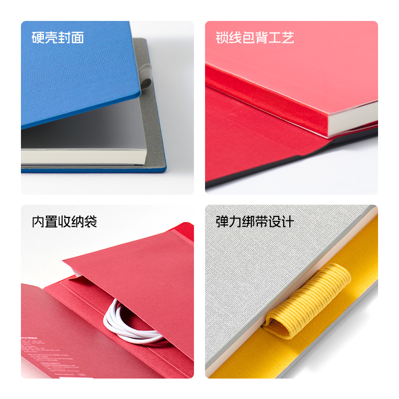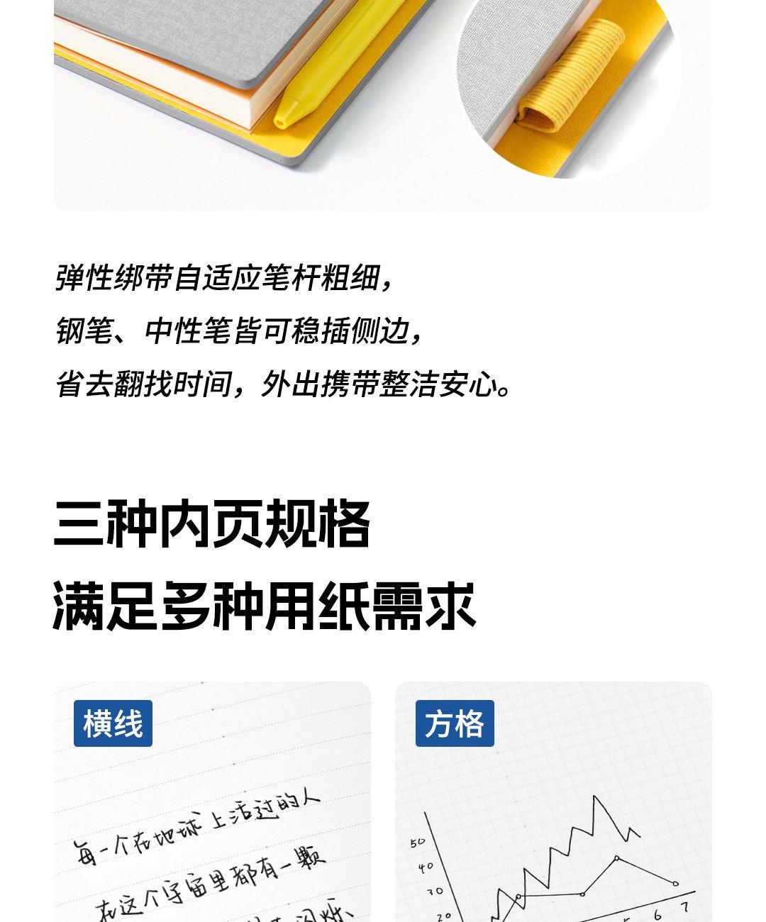 尺 寸:210*148 mm 材 质:布+灰卡(封面), 80g道林纸(内页) 外观颜色:灰色/深蓝/黑色 1、硬壳布艺封面设计,手感细腻,随手书写也稳如垫板。 2、书芯锁线包背工艺,不易掉页,长期使用依然牢固。 3、内置收纳式文件插袋,票据、小纸条随手收纳。 4、侧边一体式弹力绑带设计,方便插笔,外出携带更安心。 5、三种内页形式,满足规划、记录、绘制等多种需求。 6、每本含96张内页,是日常使用的理想容量。 7、采用80g道林纸,厚度适宜,不易洇墨透纸。 单本尺寸:单本入opp袋,210*148mm, 370g 货 期:7-10天发货(不含重大法定假日) 包装方式:单本入opp袋