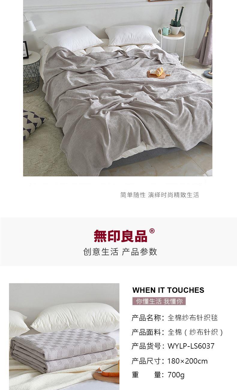 规 格:180×200cm 面 料: 棉(纱布针织) 克 重: 700g “無印良品”大染无印,优良品质的产品是年轻人喜欢的,“無印”设计, 优雅 , 质朴 , 自然 , 是無印良品的初心与追求。让体验更舒适。享受简约健康生活,走进無印,上善若水,大爱无疆,创新让生活更精彩。