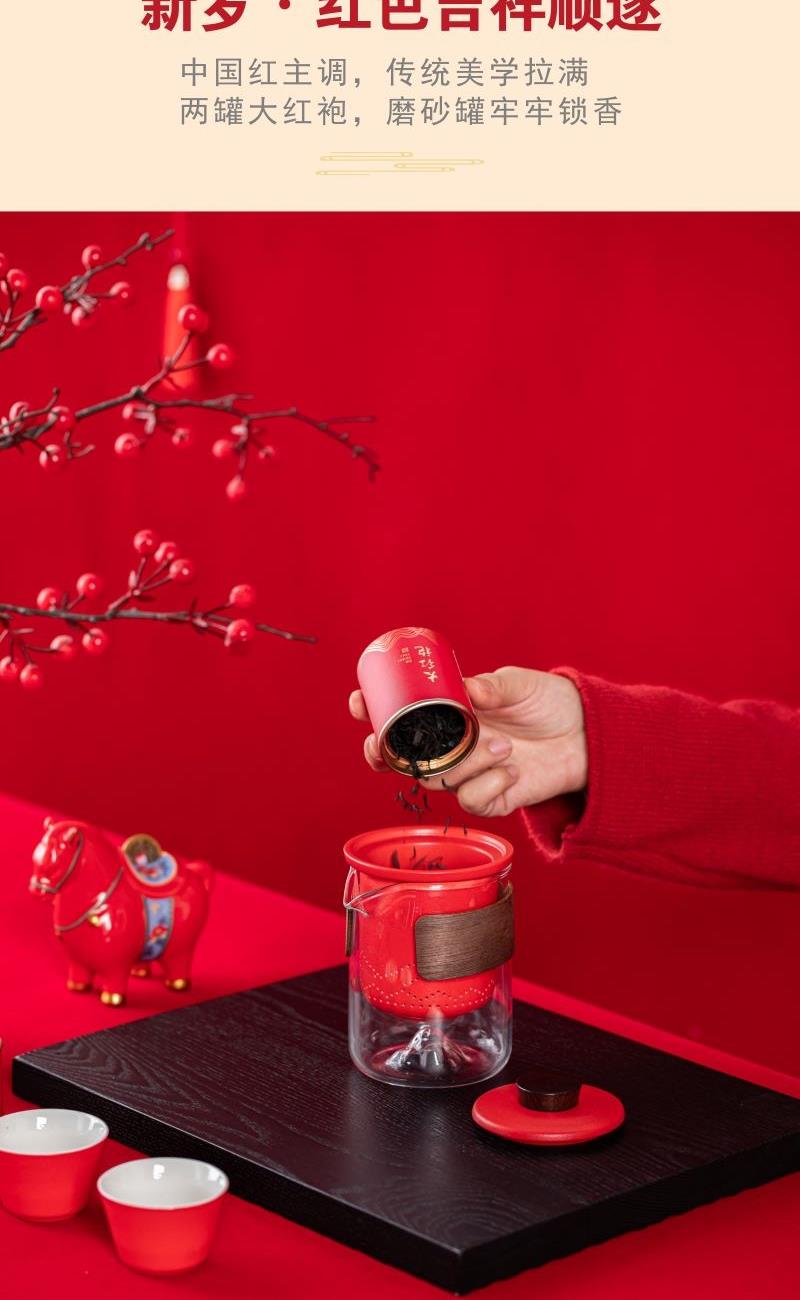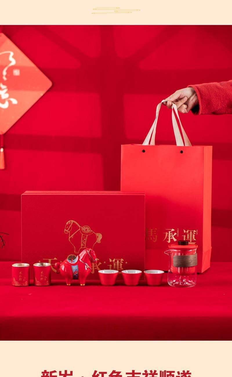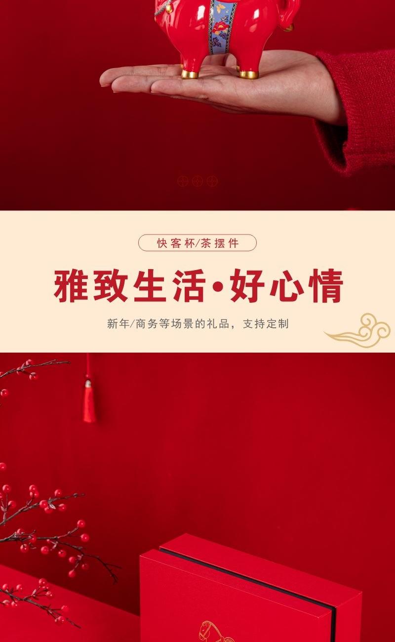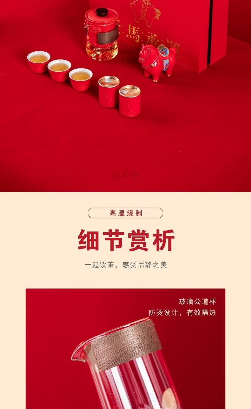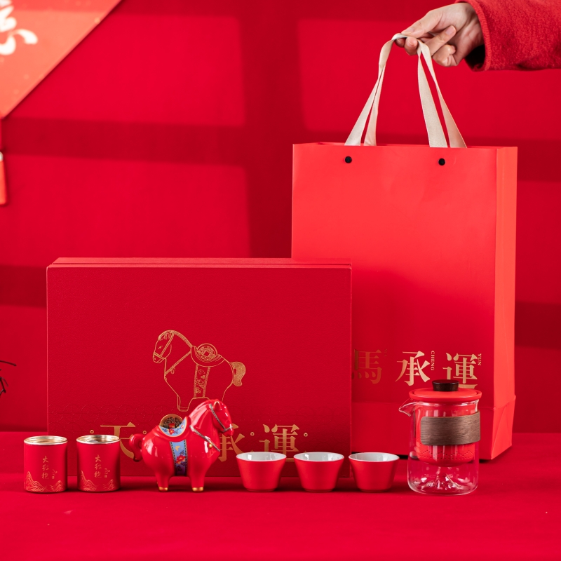 产品型号:TMCY-KK007 产品材质:陶瓷 产品颜色:红色 产品配置:玻璃快客杯x1 、杯x3 、马上赚钱x1 、小茶罐x2 、礼盒礼袋x1 产品规格:快客杯340ml、杯40ml、马上赚钱120*60*100mm、茶叶8.g/罐 产品毛重:2.00kg 包装数量:15套 包装尺寸:342*237*111mm 外箱尺寸:73*35*59cm 产品特点: 1. 红韵雅致:中国红主调,传统美学拉满; 2. 茶香锁鲜:两罐大红袍,磨砂罐牢牢锁香; 3. 寓意吸睛:珐琅彩马配铜钱,“马上赚钱”超讨喜; 4. 礼饮双绝:一壶三杯快客设计,自饮有格调、送礼有鸿运。