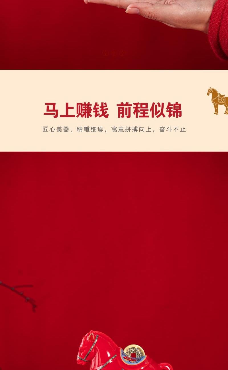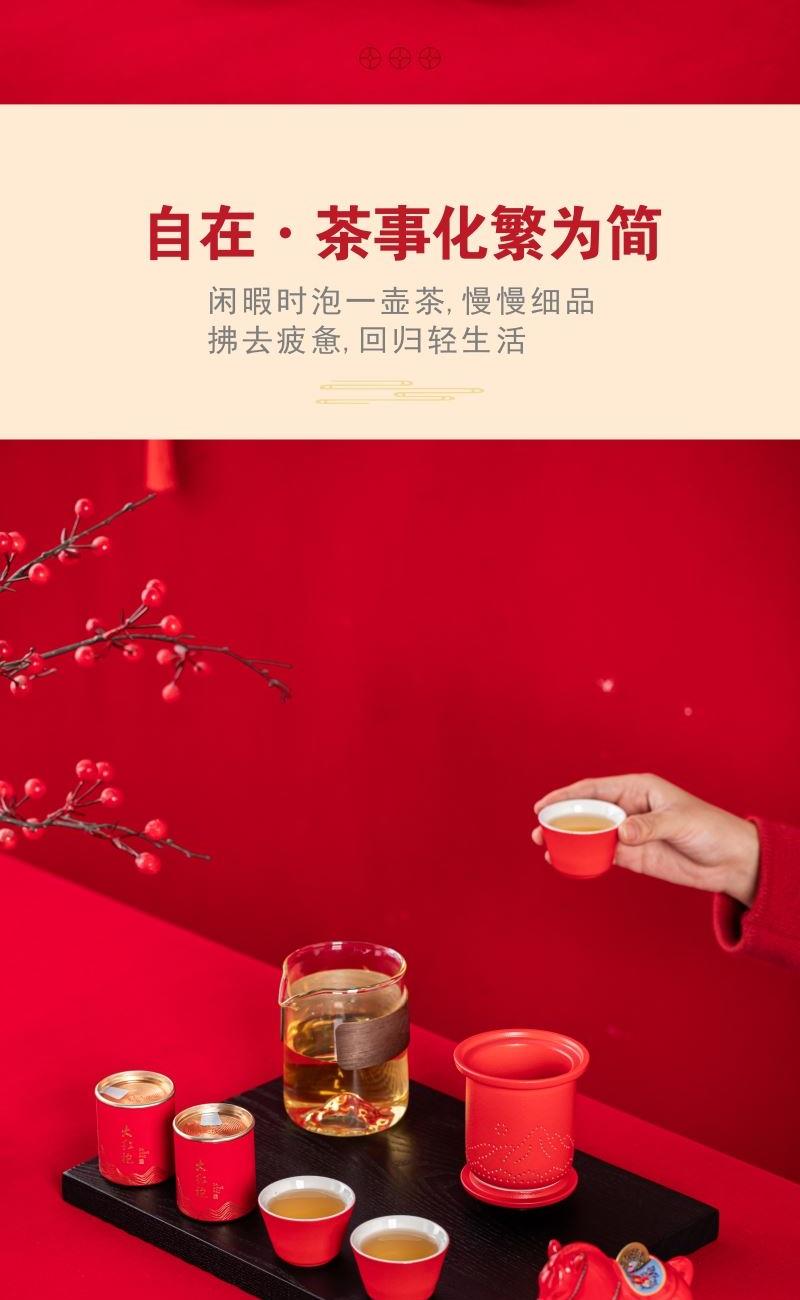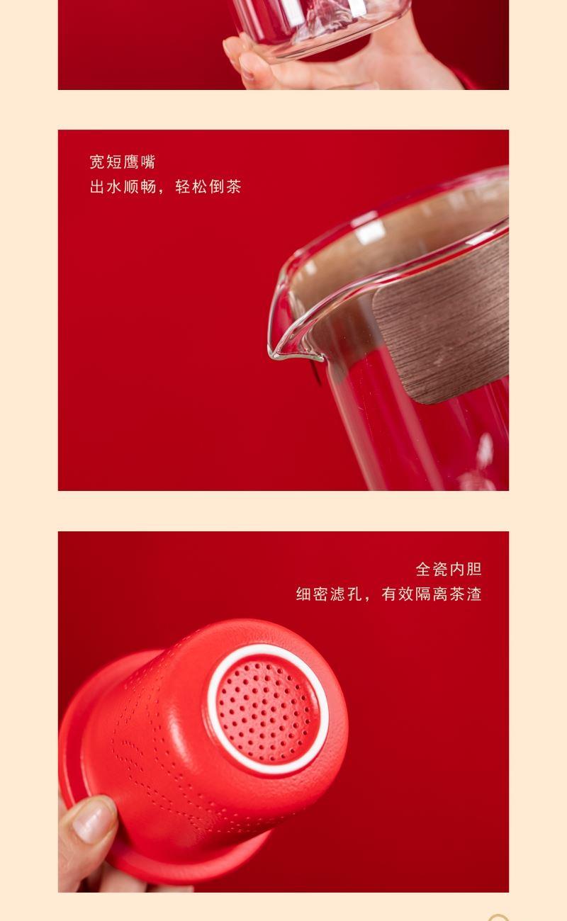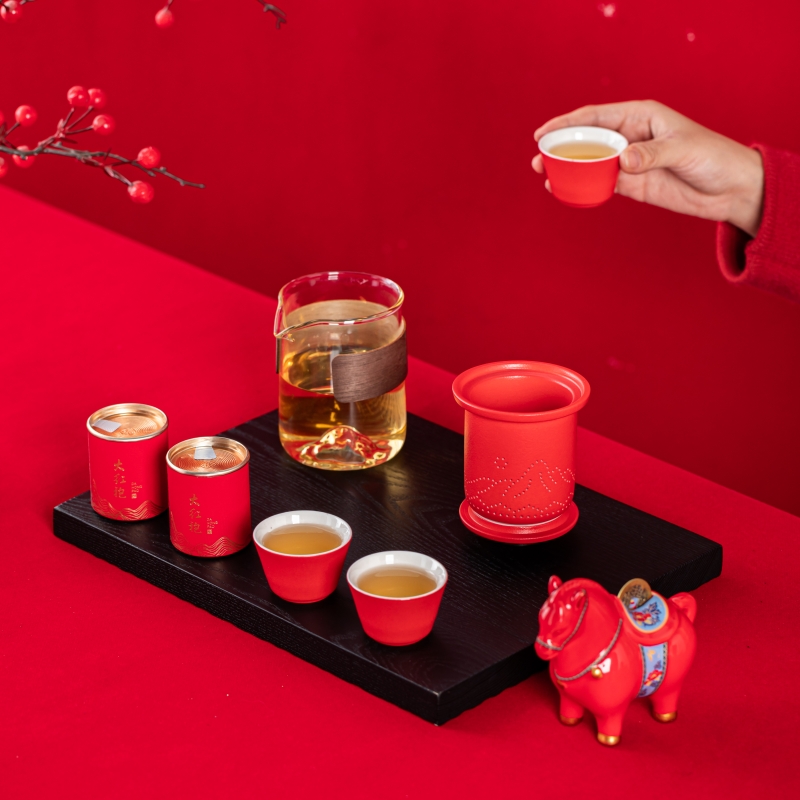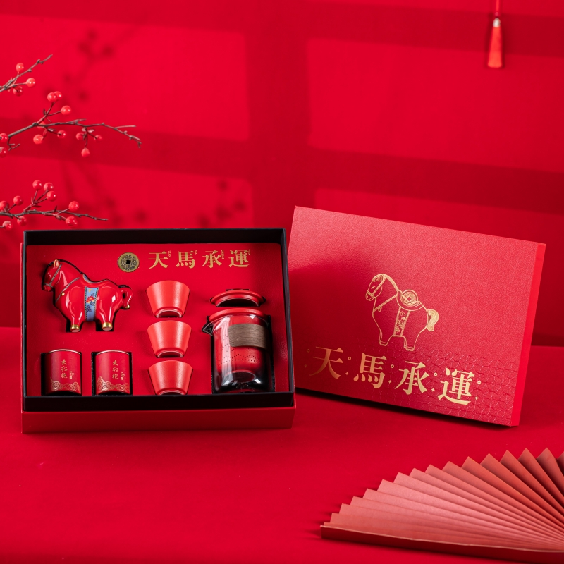 产品型号:TMCY-KK007 产品材质:陶瓷 产品颜色:红色 产品配置:玻璃快客杯x1 、杯x3 、马上赚钱x1 、小茶罐x2 、礼盒礼袋x1 产品规格:快客杯340ml、杯40ml、马上赚钱120*60*100mm、茶叶8.g/罐 产品毛重:2.00kg 包装数量:15套 包装尺寸:342*237*111mm 外箱尺寸:73*35*59cm 产品特点: 1. 红韵雅致:中国红主调,传统美学拉满; 2. 茶香锁鲜:两罐大红袍,磨砂罐牢牢锁香; 3. 寓意吸睛:珐琅彩马配铜钱,“马上赚钱”超讨喜; 4. 礼饮双绝:一壶三杯快客设计,自饮有格调、送礼有鸿运。
