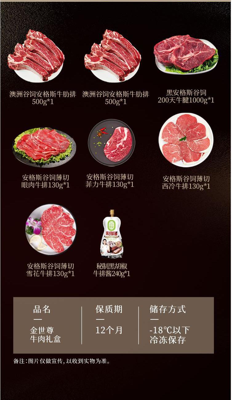 澳洲谷饲安格斯牛肋排500g 澳洲谷饲安格斯牛肋排500g 黑安格斯谷饲200天牛腱1000g 安格斯谷饲薄切眼肉牛排130g 安格斯谷饲薄切菲力牛排130g 安格斯谷饲薄切西冷牛排130g 安格斯谷饲薄切雪花牛排130g (赠)秘制黑胡椒牛排酱240g 外彩箱 加厚保温箱+保温措施 免费宅配到家服务