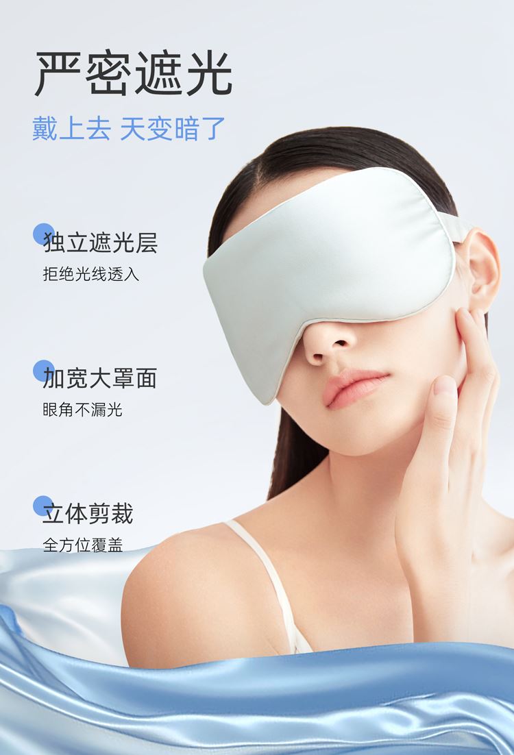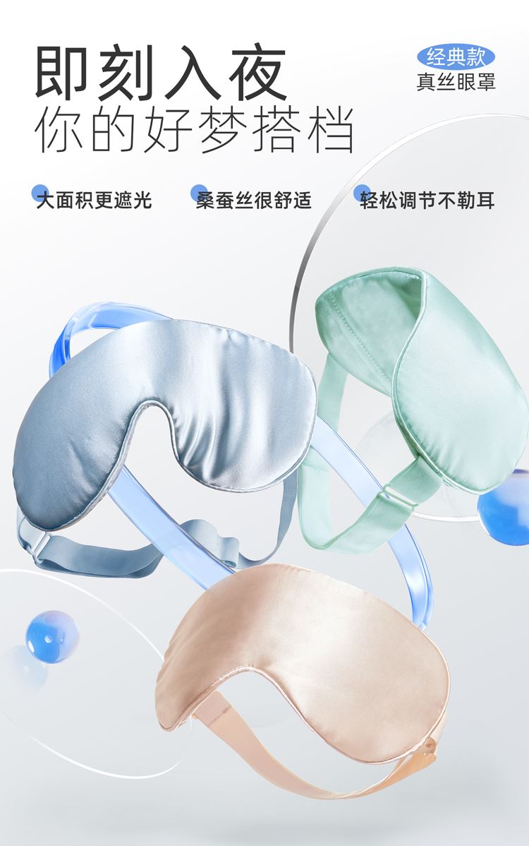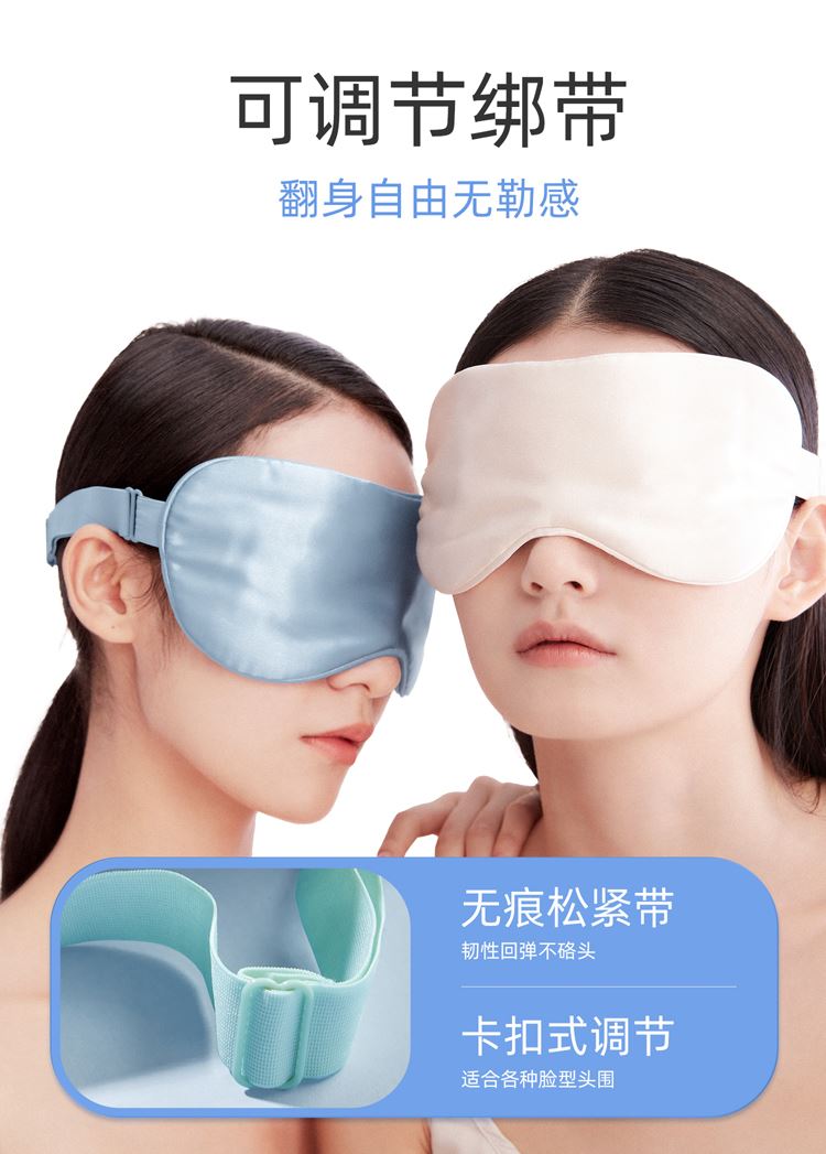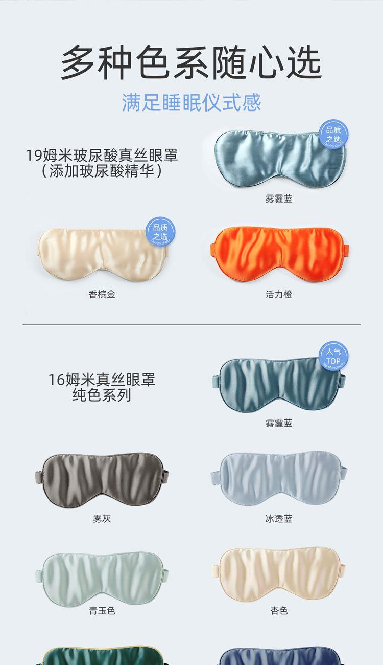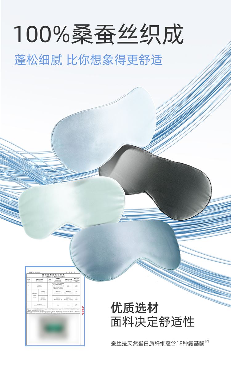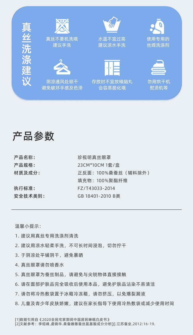 规格:23*10cm 1套/盒 颜色:雾霾蓝 材质及成分:正反面:桑蚕丝(辅料除外) 填充物:聚脂纤维 配置:眼罩1+收纳袋1+外包材1