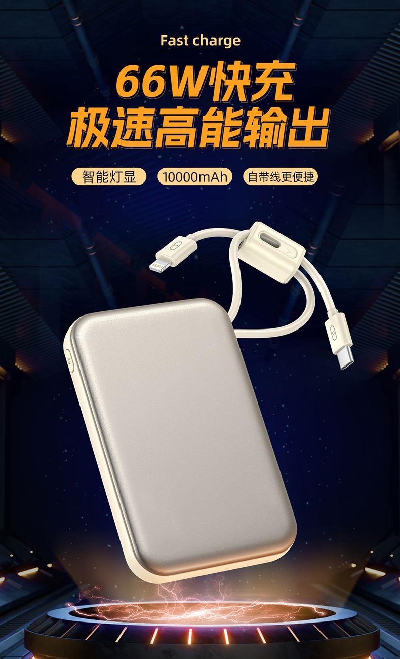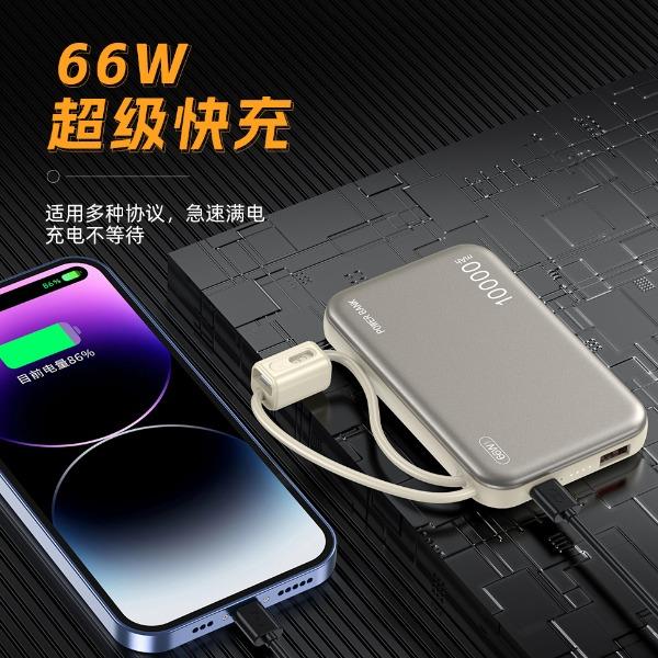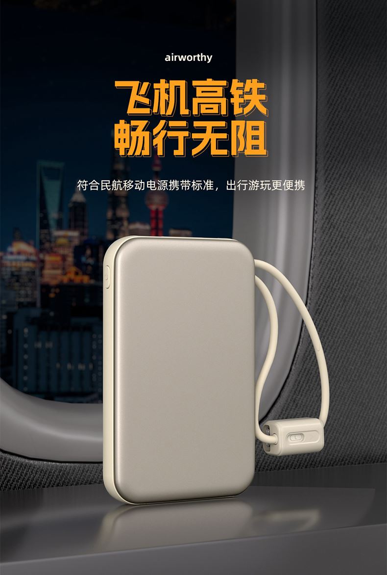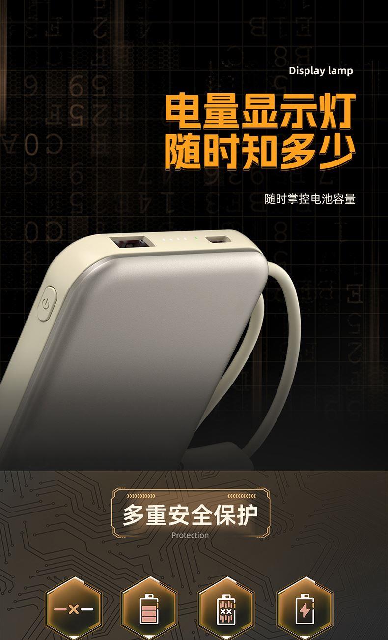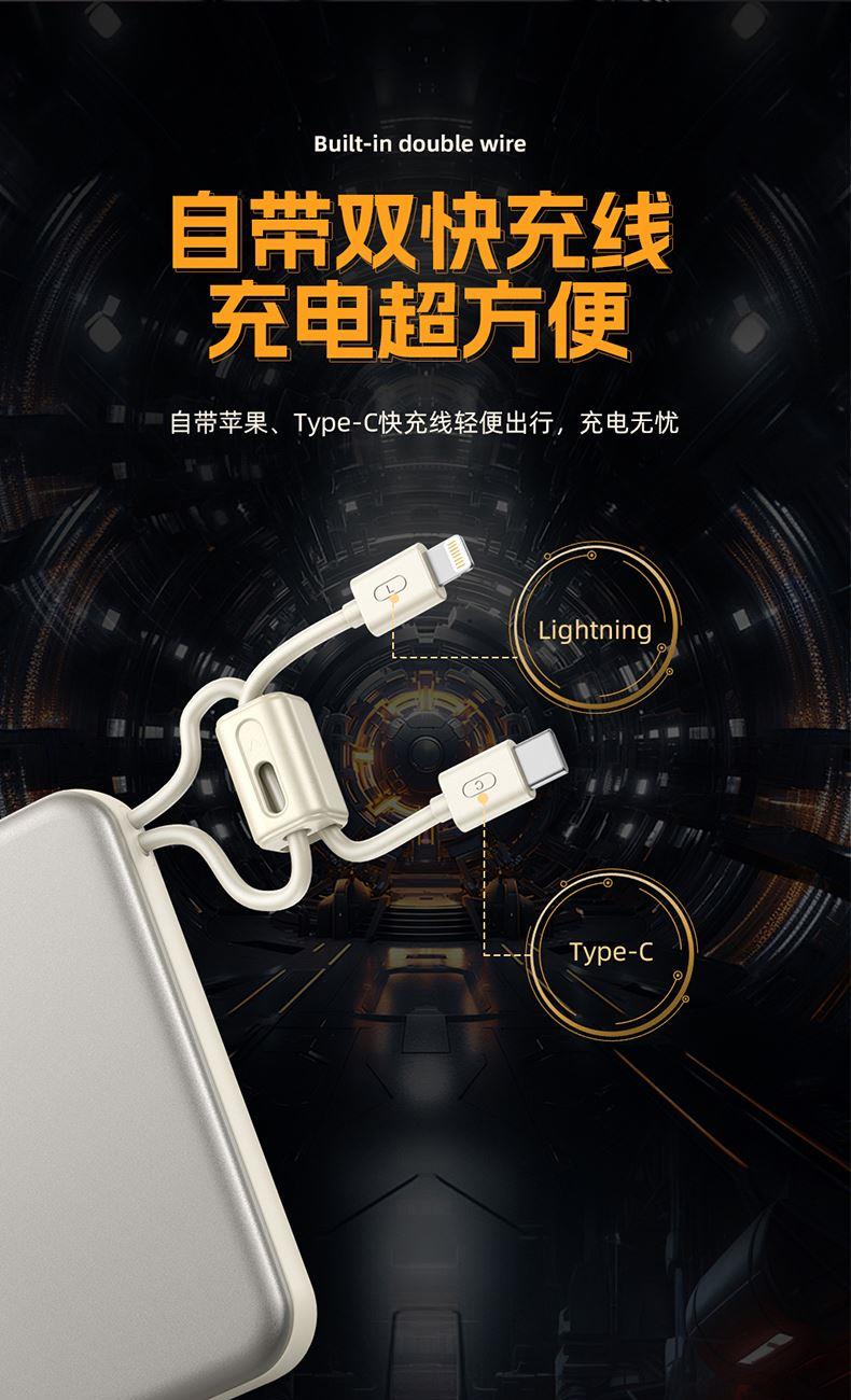 奥苏米3C认证刀锋22.5W铝合金商务移动电源R57N 型 号: R57N 电池 :聚合物*1pcs 电池类型 :聚合物动力电芯 容量:10000mAh / 20000mAh 材质 :ABS+PC 尺寸 :68*108*16mm 颜色 :常备米色 /蓝色/ 紫色 功能特点 简约设计风格,时尚大气; 22.5W超级快充,迅速充电; 10000mAh锂电池,澎湃动力; 自带苹果和Type-C充电线; 一输入三输出,支持苹果15手机 智能数显查看电量