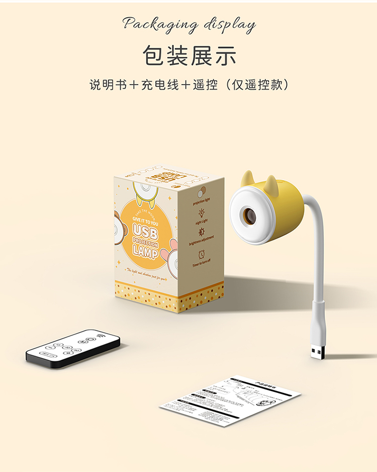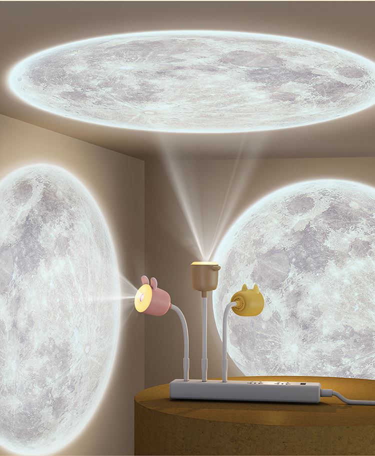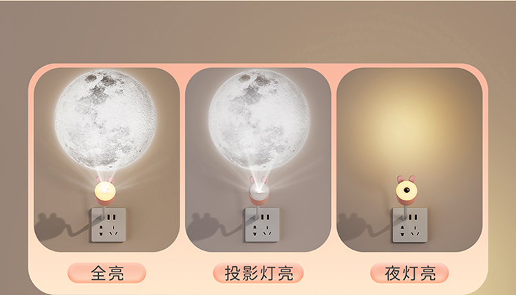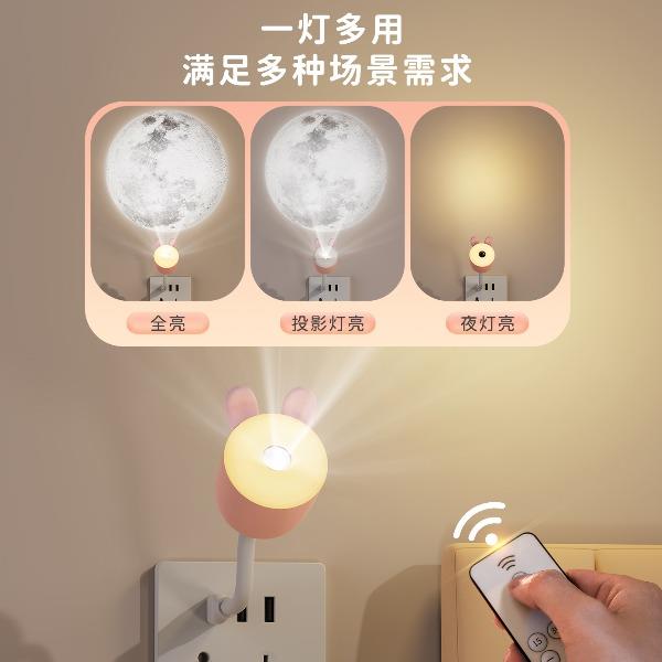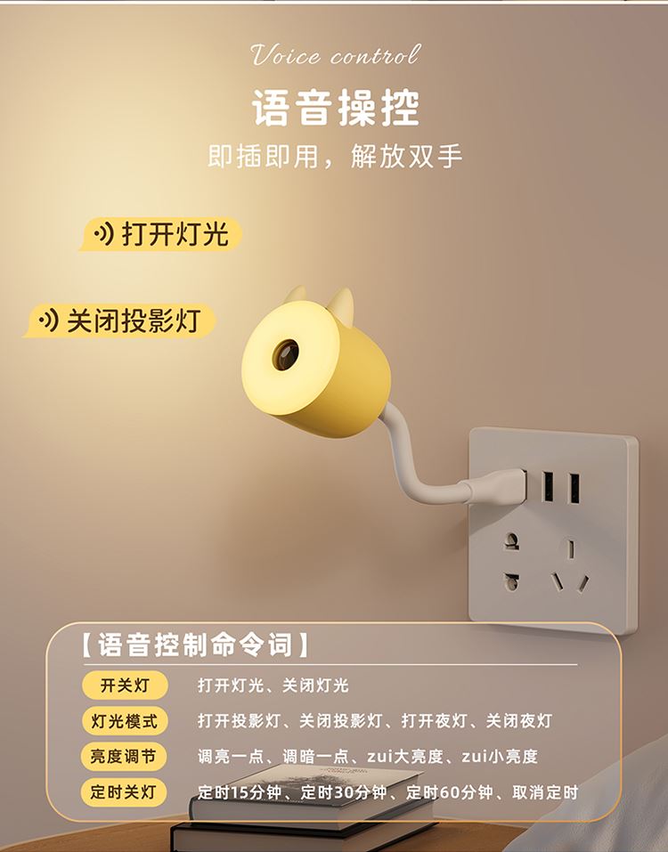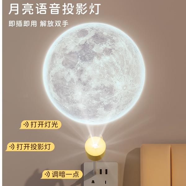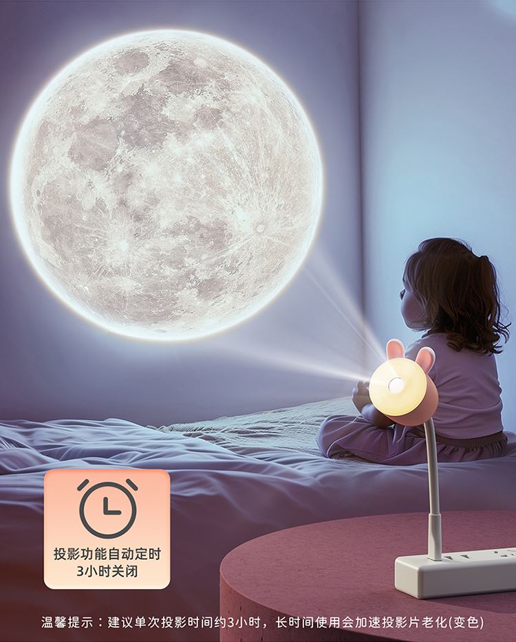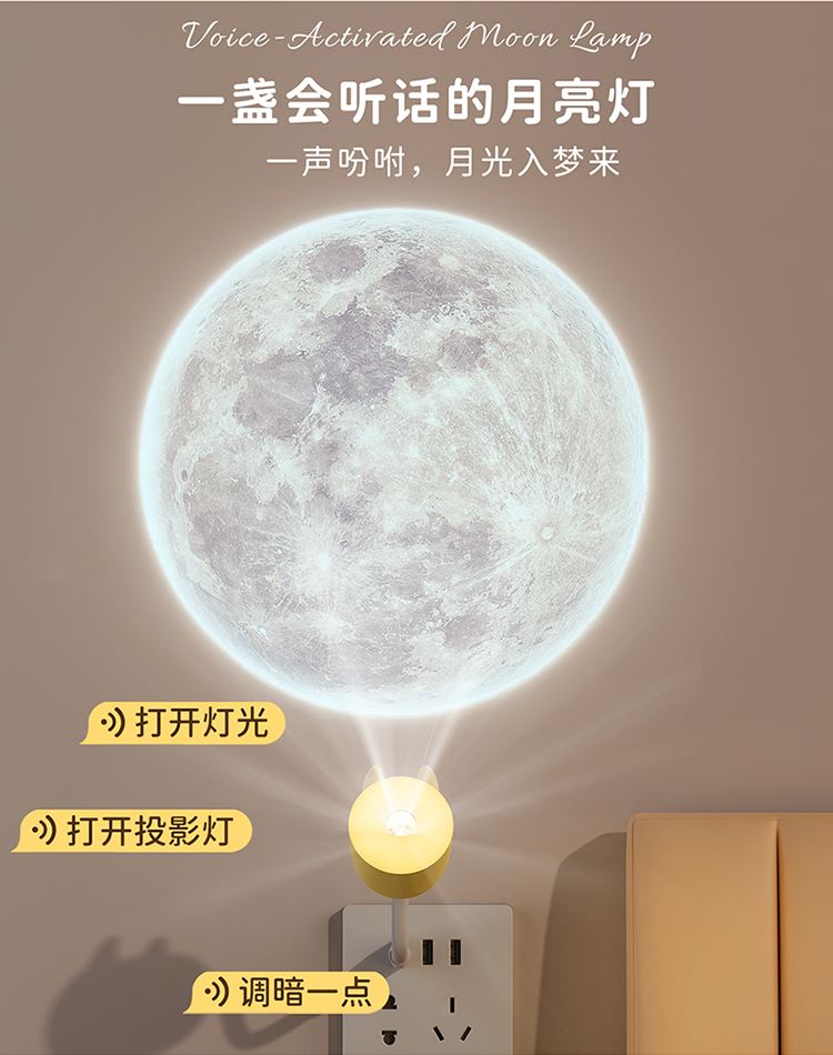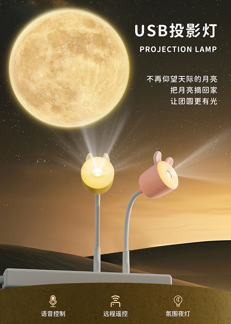 1:语音款和遥控款两款可选,操作方便,懒人必备 2:USB直插,不用担心续航问题,省事省心 3:可爱造型,插在哪里都好看。小夜灯和月球投影灯独立操控,夜晚伴睡好助手 4:月球投影功能定时3小时关灯设定,使用更省心
