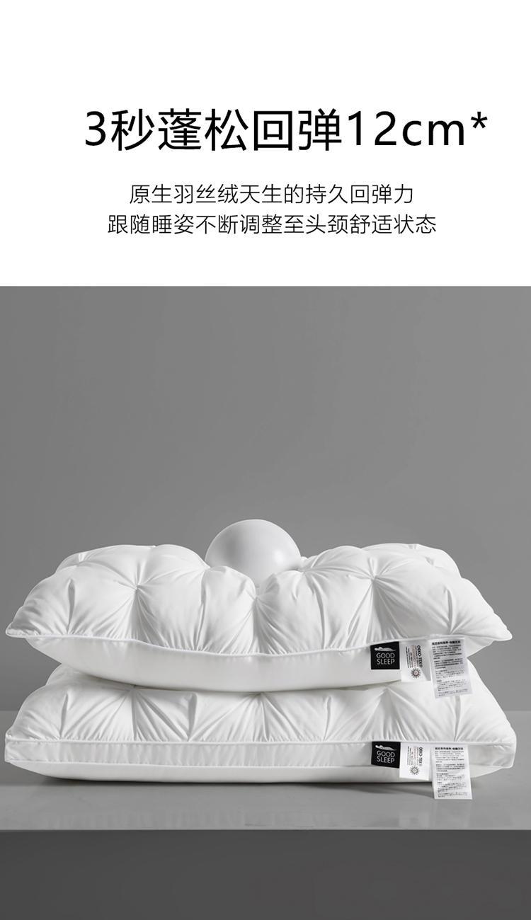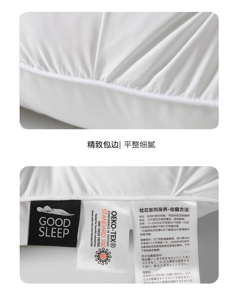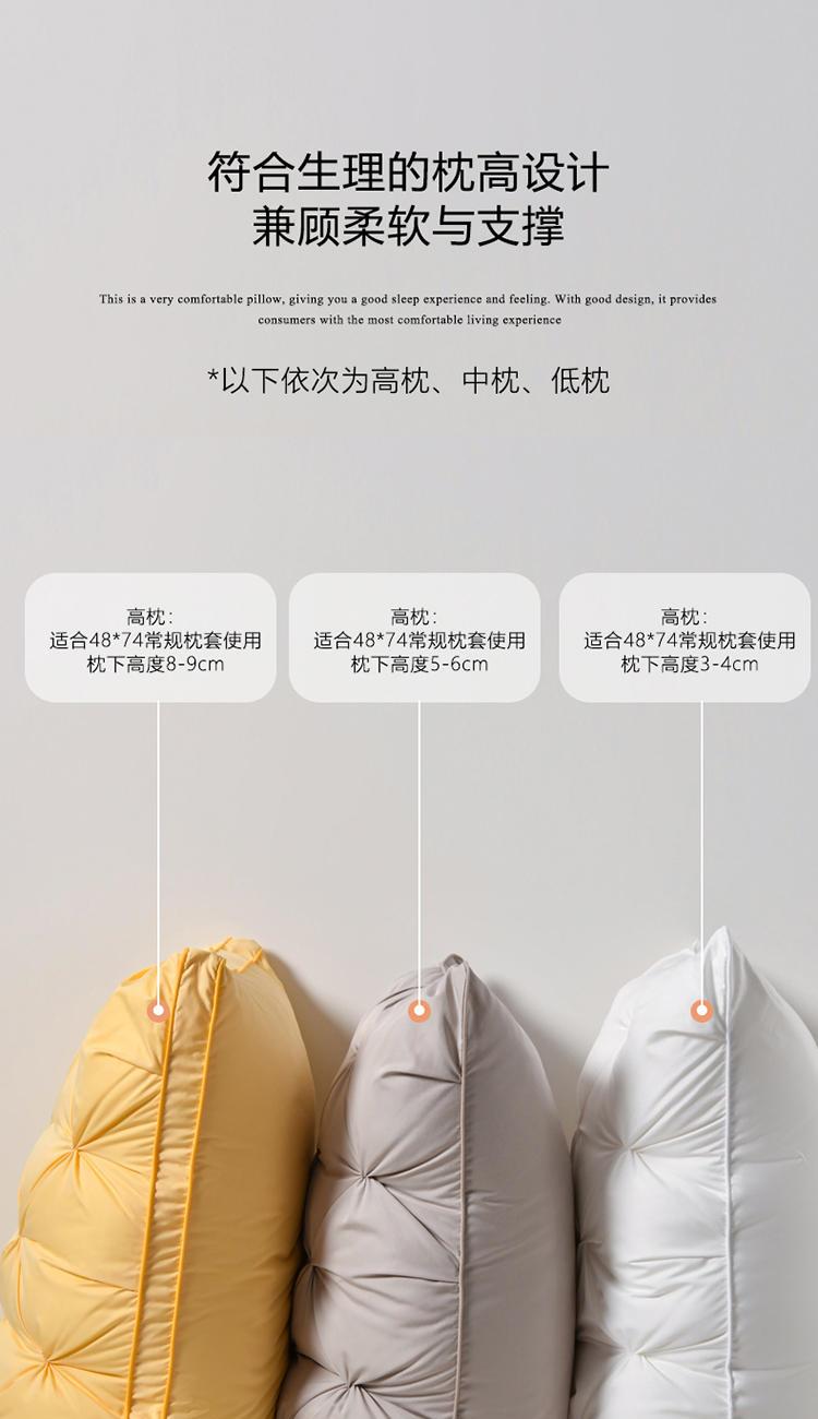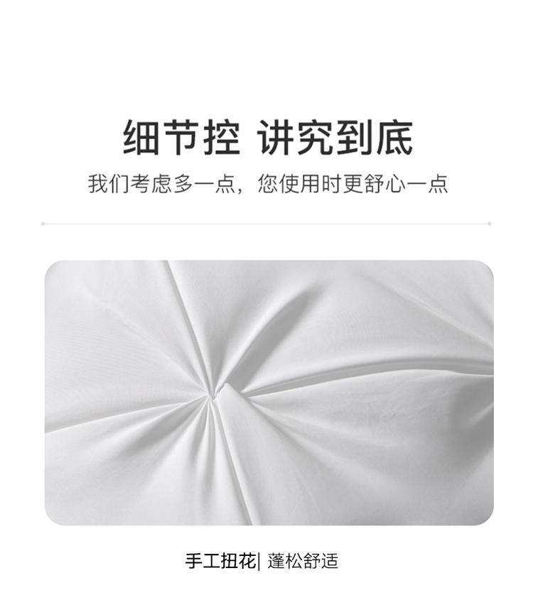 规格:48*74cm低枕650g 高度12-14cm(睡下高度约3-4cm) 花色:典雅白/灰杏/活力橙/水绿 面料:聚酯纤维 填充:聚酯纤维 面料采用复合锦纶纤维+聚酯纤维,触感更加柔软舒适;采用SINOPEC国标纤维,5A级超细羽丝纤维-仿生雁鸭绒填充,既带来了真实的鸭绒蓬松的体验感,又提升了整个枕头的支撑性和回弹性,让柔软和支撑融为一体;原生羽丝绒持久回弹力,3秒回弹;面包式立体工学,高支撑,高柔软,高回弹;手工扭花,蓬松舒适,精致包边,平整细腻