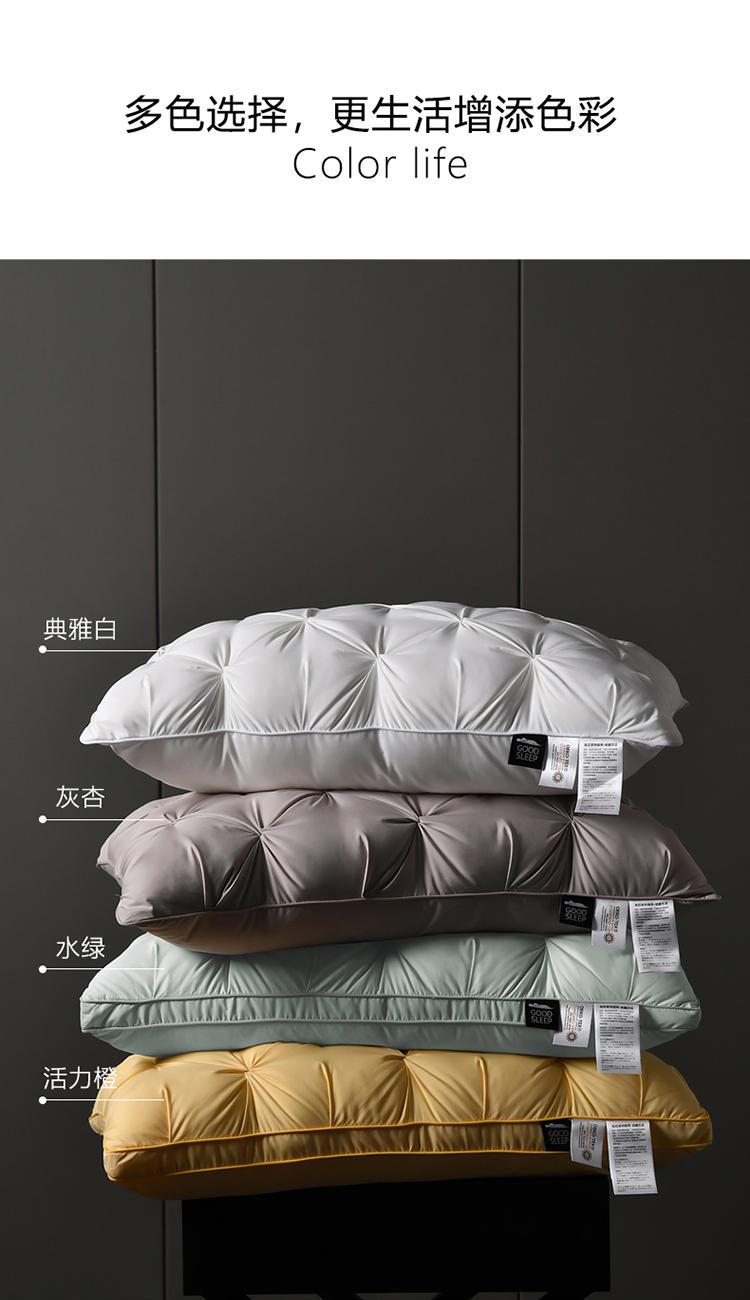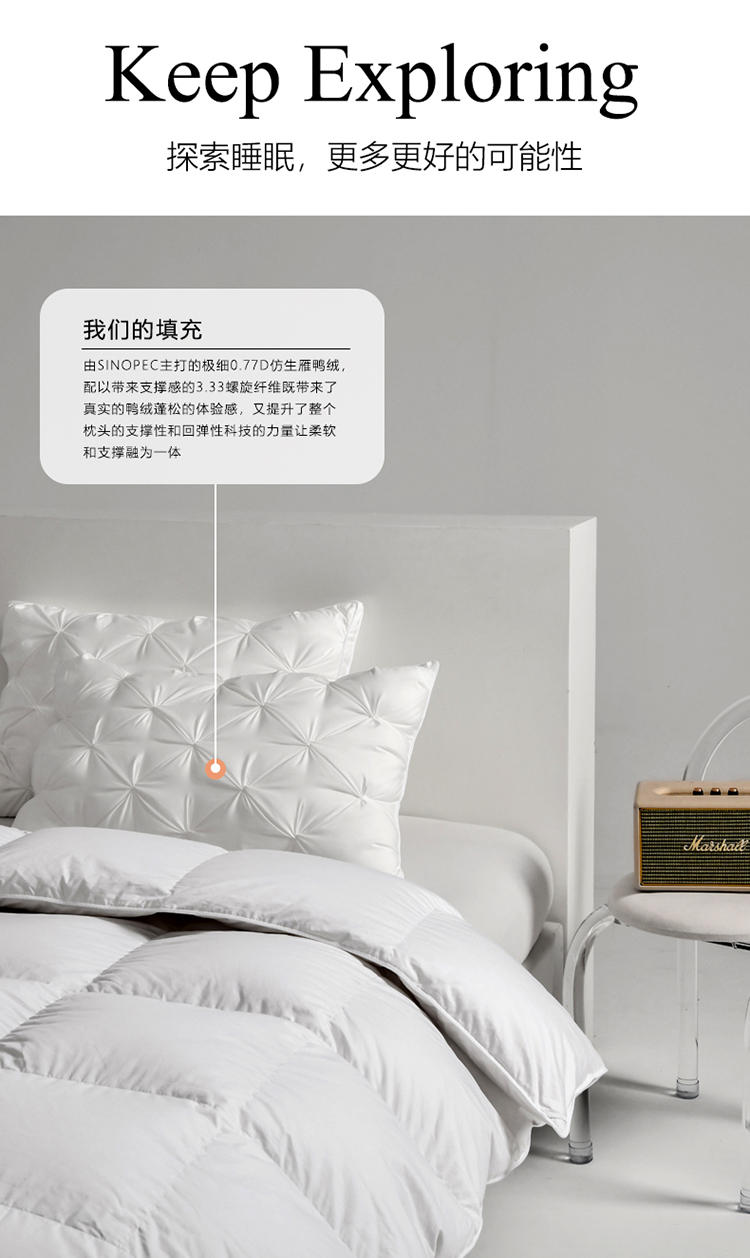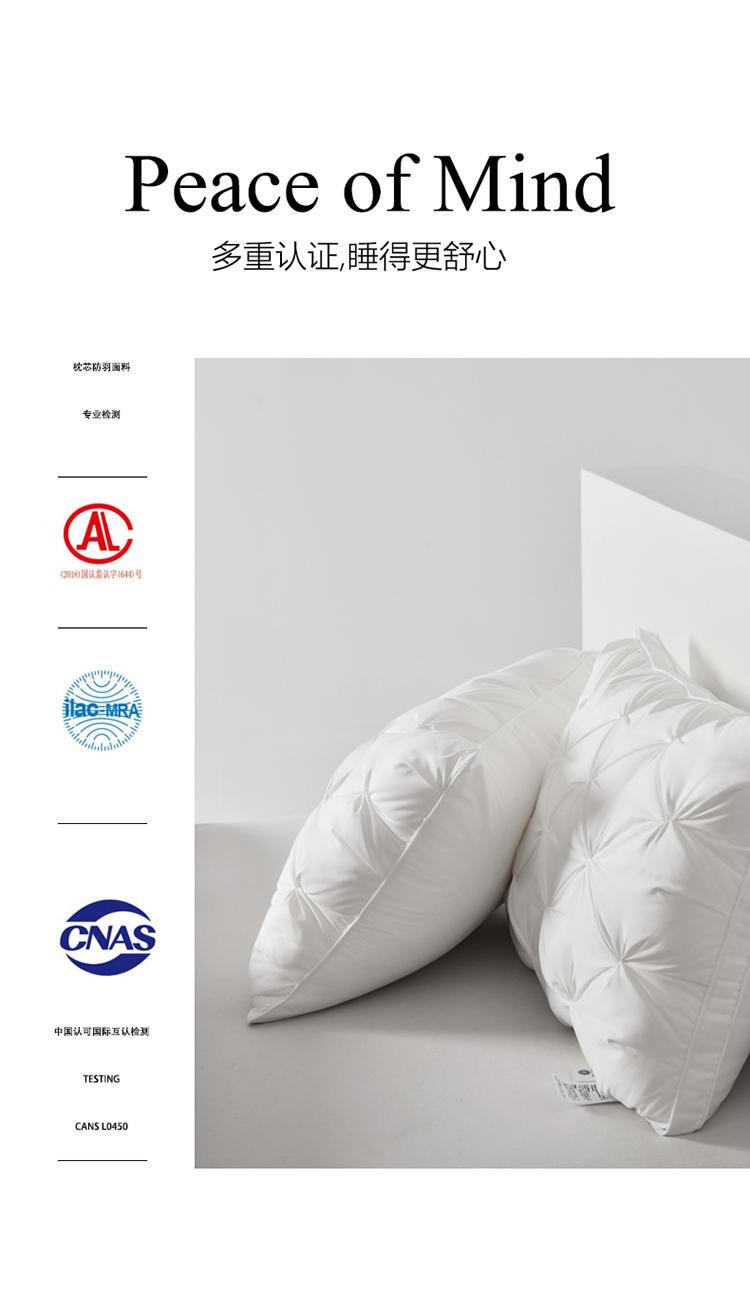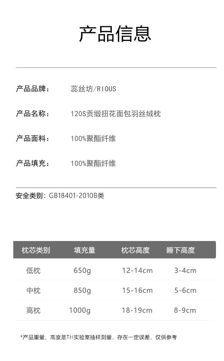 规格:48*74cm低枕650g 高度12-14cm(睡下高度约3-4cm) 花色:典雅白/灰杏/活力橙/水绿 面料:聚酯纤维 填充:聚酯纤维 面料采用复合锦纶纤维+聚酯纤维,触感更加柔软舒适;采用SINOPEC国标纤维,5A级超细羽丝纤维-仿生雁鸭绒填充,既带来了真实的鸭绒蓬松的体验感,又提升了整个枕头的支撑性和回弹性,让柔软和支撑融为一体;原生羽丝绒持久回弹力,3秒回弹;面包式立体工学,高支撑,高柔软,高回弹;手工扭花,蓬松舒适,精致包边,平整细腻