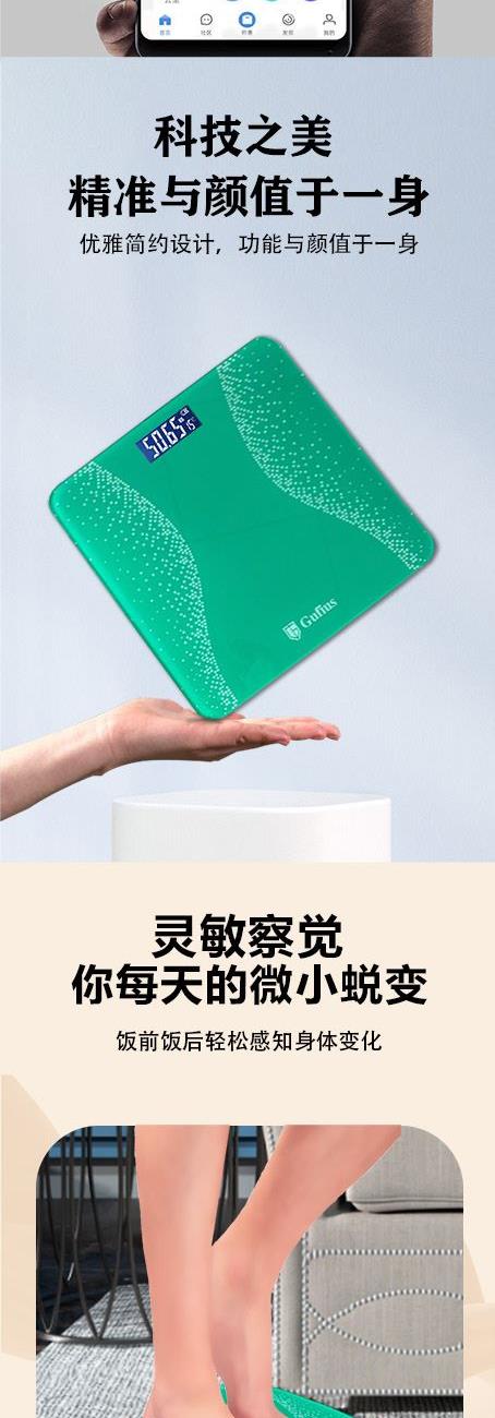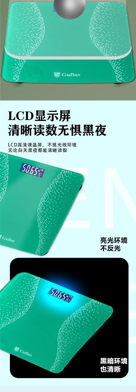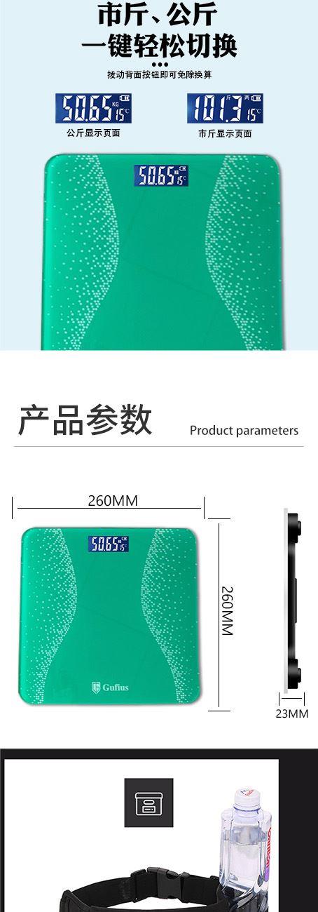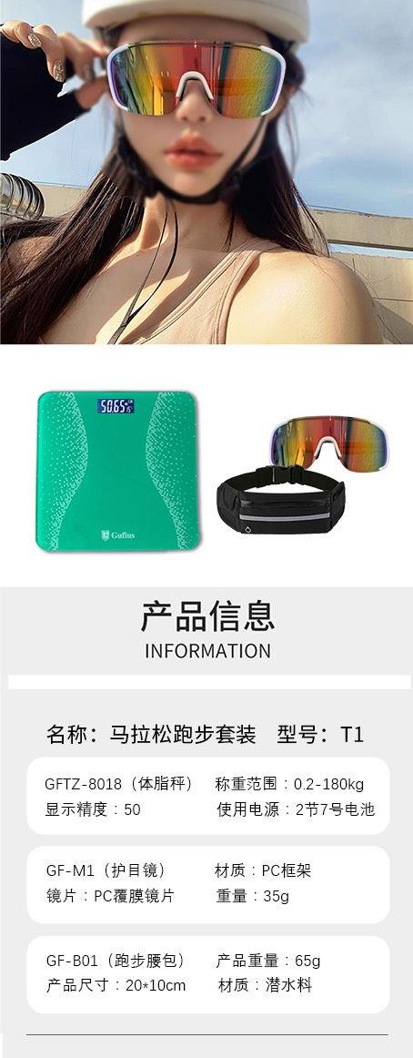 产品规格: 1、GFTZ-8018(体脂秤) 称重范围:0.2-180kg 显示精度:50 使用电源:2节7号电池 2、GF-M1(护目镜) 材质:PC框架 镜片:PC覆膜镜片 重量:35g 3、GF-B01(跑步腰包) 产品重量:65g 产品尺寸:20*10cm 材质:潜水料 产品特点: 1、200g起称,精 准看得见; 2、高强度钢化玻璃,坚固耐用; 3、市斤/公斤一键切换,满足全年龄段习惯; 4、LCD大屏背光显示,昼夜皆清晰; 5、体脂率实时在线检测,时刻提醒身材健康。 6、运动护目镜,适应多种场景; 7、炫彩镜片,佩带清晰,耐磨损,佩带舒适,炫酷骑行; 8、运动腰包,升级多口袋大容量,跑步装备全收纳; 9、腰包耳机孔设计,跑步、运动、健身方便耳机携带; 10、腰包卡扣可调节设计,牢固耐用,方便出行。