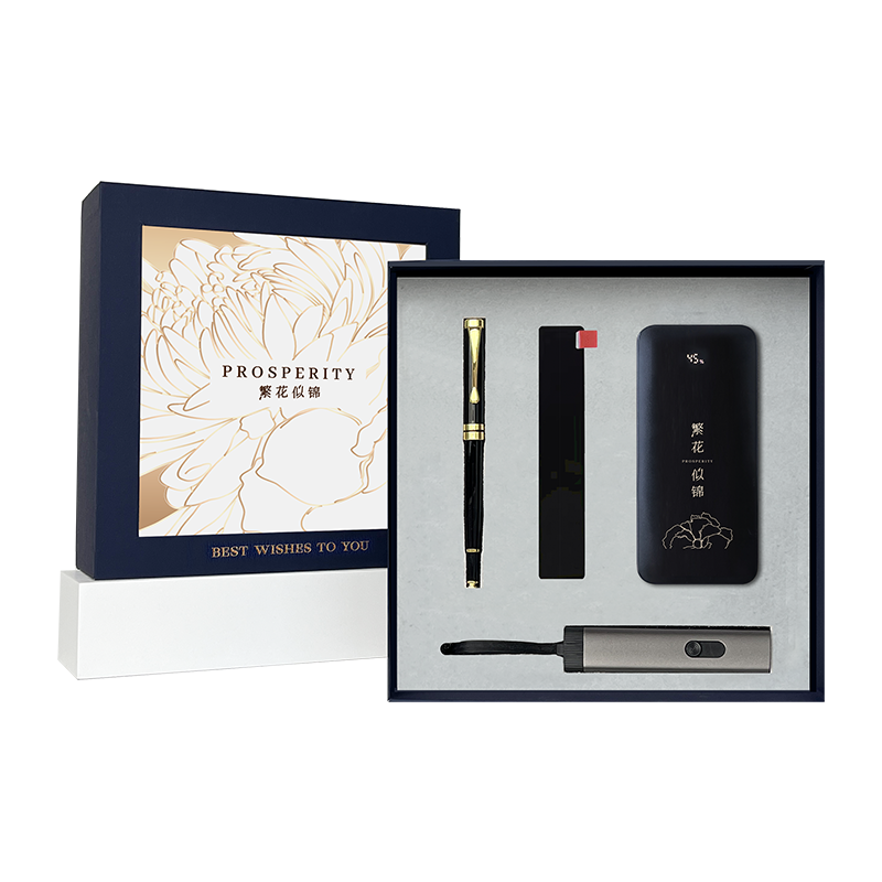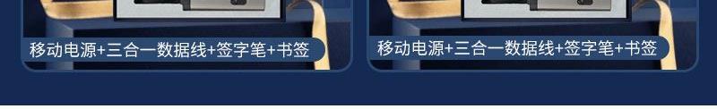 ❶ 彩屏灯光充电宝 ❷ 三合一数据线 ❸ 签字笔 ❹金属书签 ❺ 手提袋