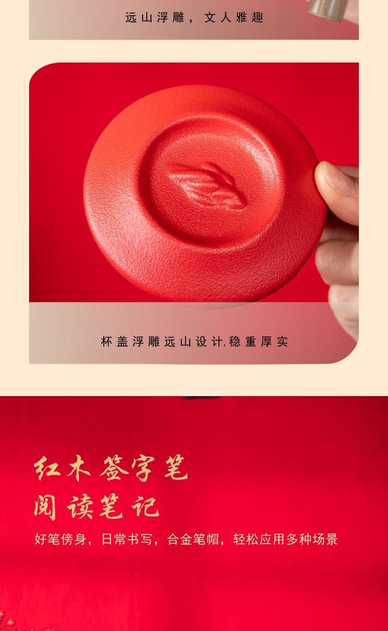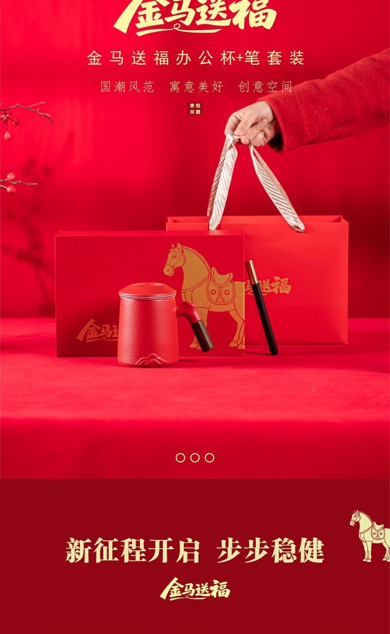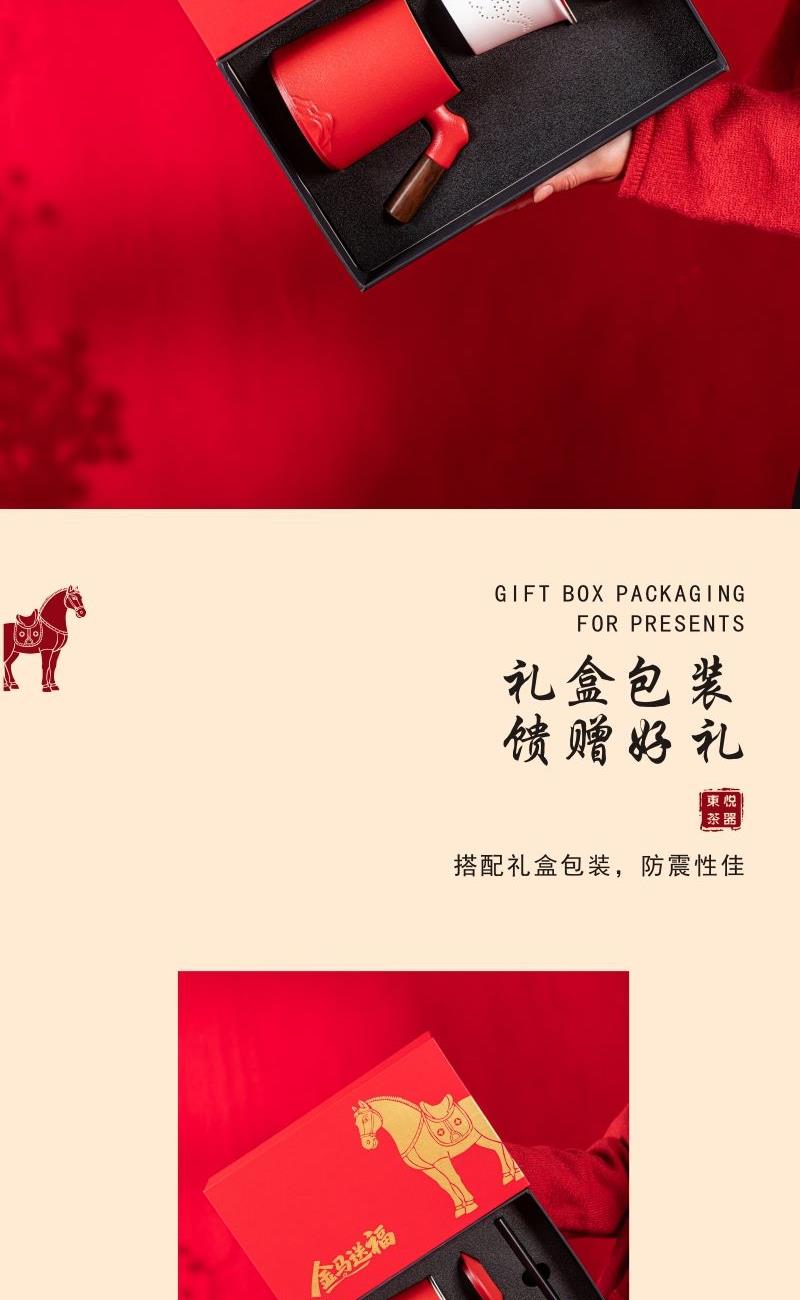 产品配置:办公杯(过滤内胆)x1 、签字笔x1 、礼盒礼袋x1 产品规格:办公杯145*110mm容量*400ml、签字笔147*11mm 产品重量:1.02kg 产品毛重:1.40kg 产品特点: 1、金马礼盒,新年礼的满分选择; 2、美学:金马纹样藏福韵; 3、实用:茶具套装好上手; 4、体面:礼盒包装显心意。