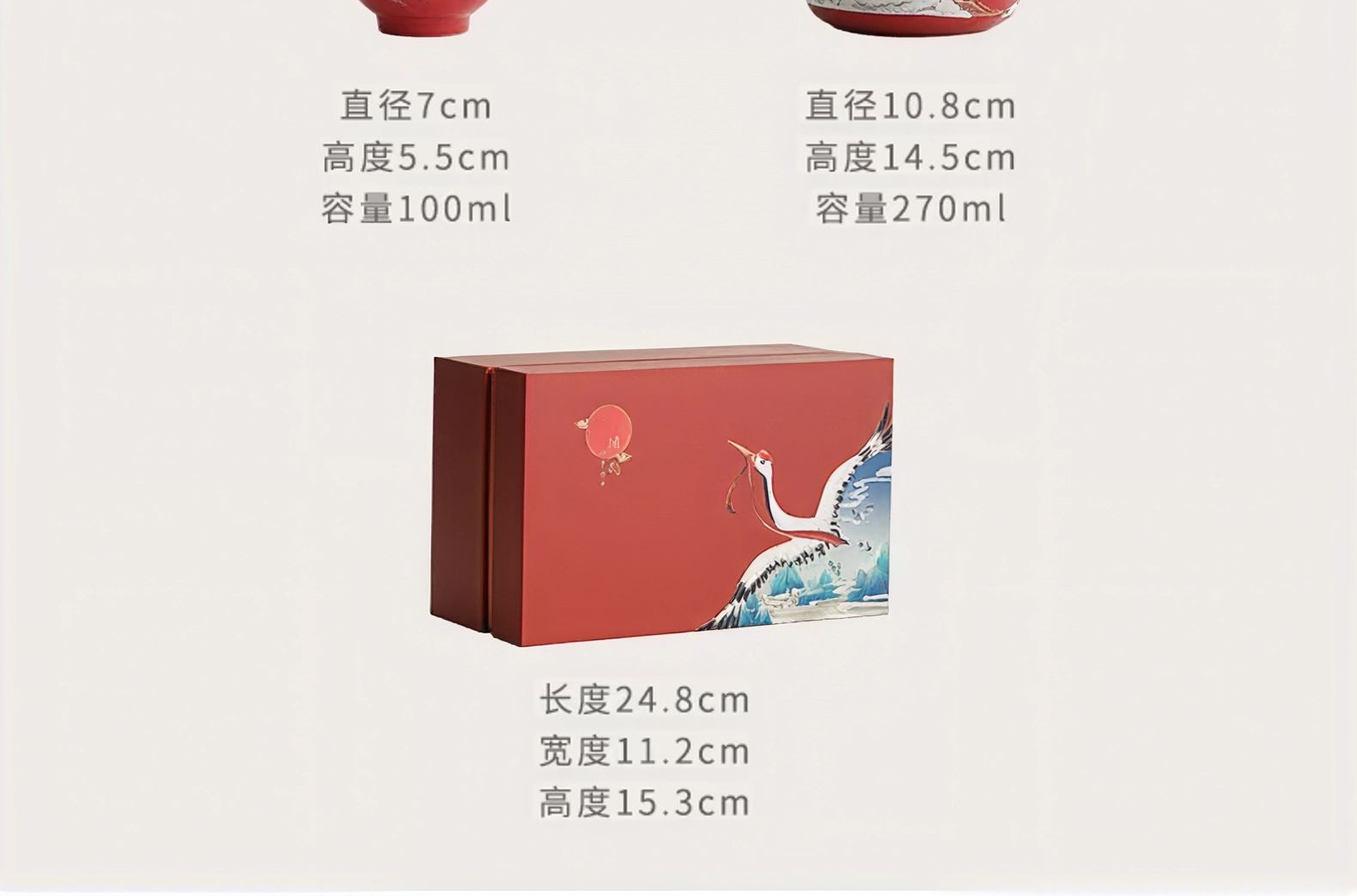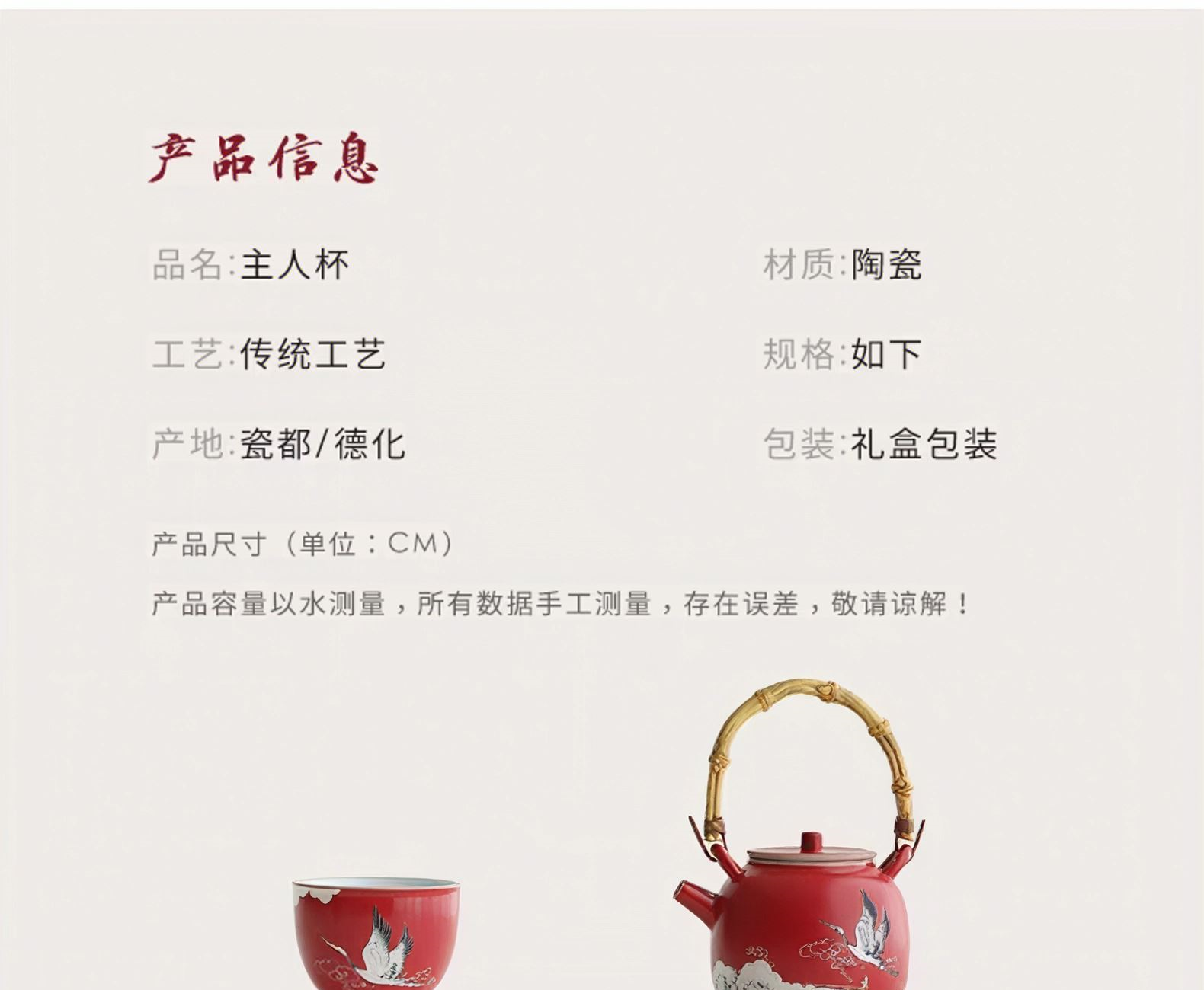 配置:提梁壶*1,茶杯*2. 尺寸:提梁壶10.8*14.5cm 容量270ml, 茶杯7*5.5cm 容量100ml, 礼盒:24.8*11.2*15.3cm。