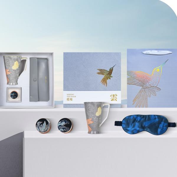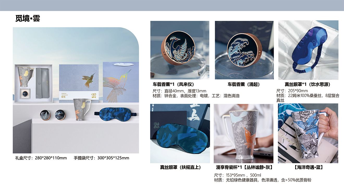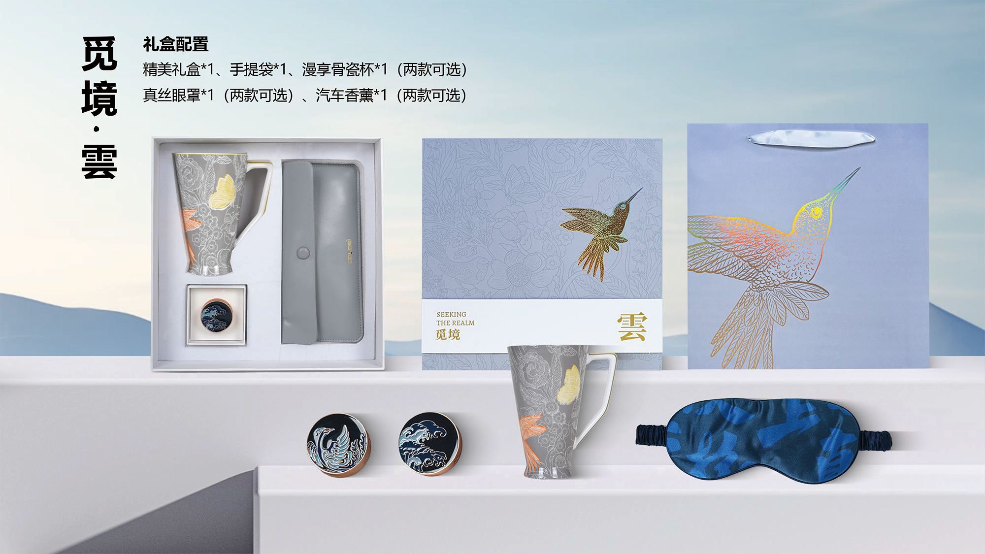 精美礼盒*1 手提袋*1 漫享骨瓷杯*1(两款可选) 真丝眼罩*1(两款可选) 汽车香薰*1(两款可选)
