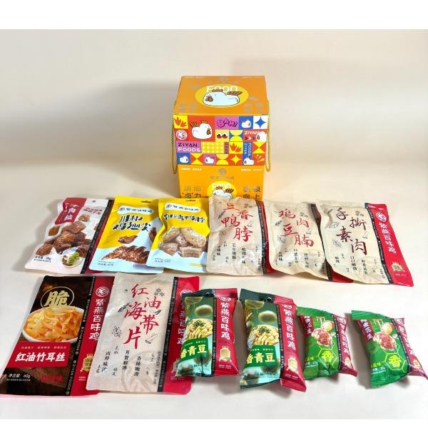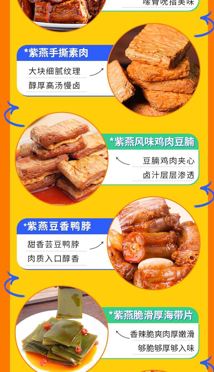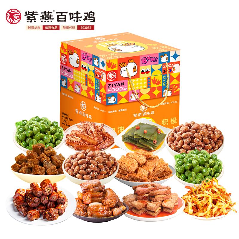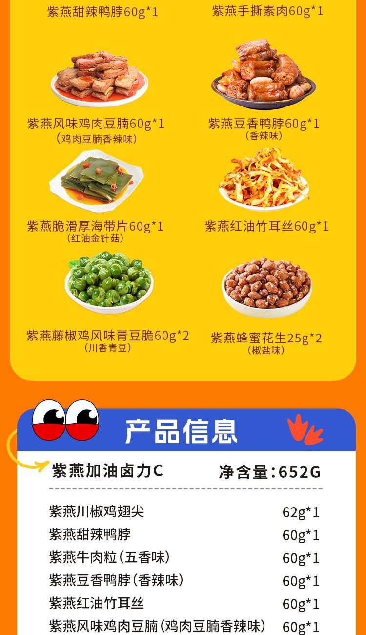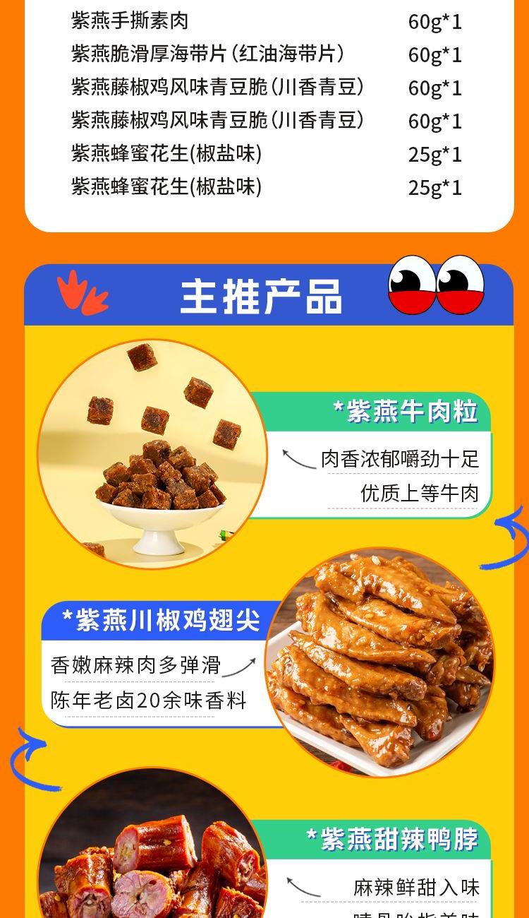 紫燕川椒鸡翅尖62g*1 紫燕甜辣鸭脖60g*1 紫燕牛肉粒(五香味)60g*1 紫燕豆香鸭脖(香辣味)60g*1 紫燕红油竹耳丝60g*1 紫燕风味鸡肉豆腩(鸡肉豆腩香辣味)60g*1 紫燕手撕素肉60g*1 紫燕脆滑厚海带片(红油海带片)60g*1 紫燕藤椒鸡风味青豆脆(川香青豆)60g*1 紫燕藤椒鸡风味青豆脆(川香青豆)60g*1 紫燕蜂蜜花生(椒盐味)25g*1 紫燕蜂蜜花生(椒盐味)25g*1 礼盒+组装+外盒