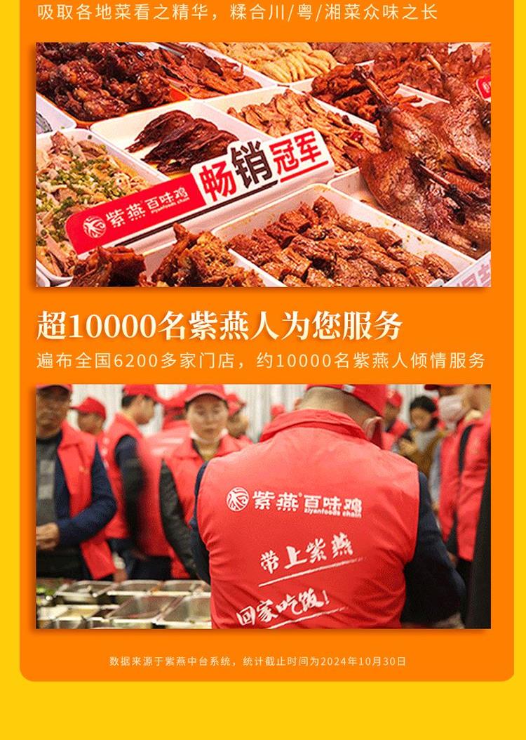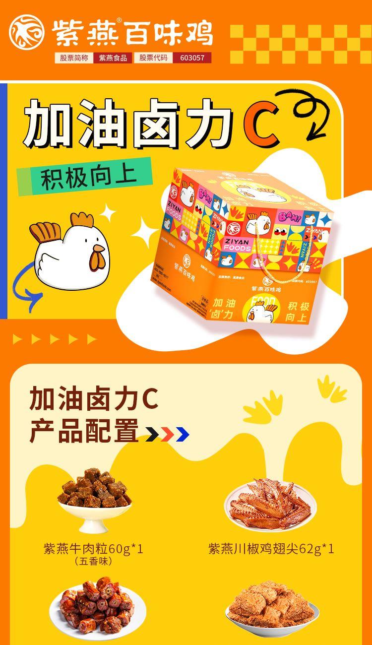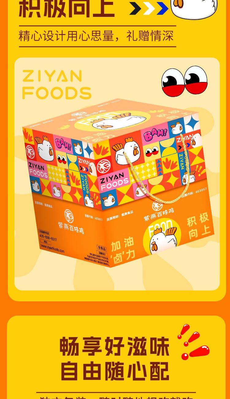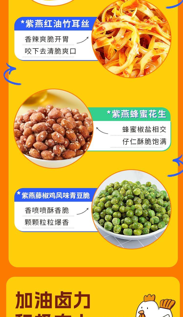 紫燕川椒鸡翅尖62g*1 紫燕甜辣鸭脖60g*1 紫燕牛肉粒(五香味)60g*1 紫燕豆香鸭脖(香辣味)60g*1 紫燕红油竹耳丝60g*1 紫燕风味鸡肉豆腩(鸡肉豆腩香辣味)60g*1 紫燕手撕素肉60g*1 紫燕脆滑厚海带片(红油海带片)60g*1 紫燕藤椒鸡风味青豆脆(川香青豆)60g*1 紫燕藤椒鸡风味青豆脆(川香青豆)60g*1 紫燕蜂蜜花生(椒盐味)25g*1 紫燕蜂蜜花生(椒盐味)25g*1 礼盒+组装+外盒