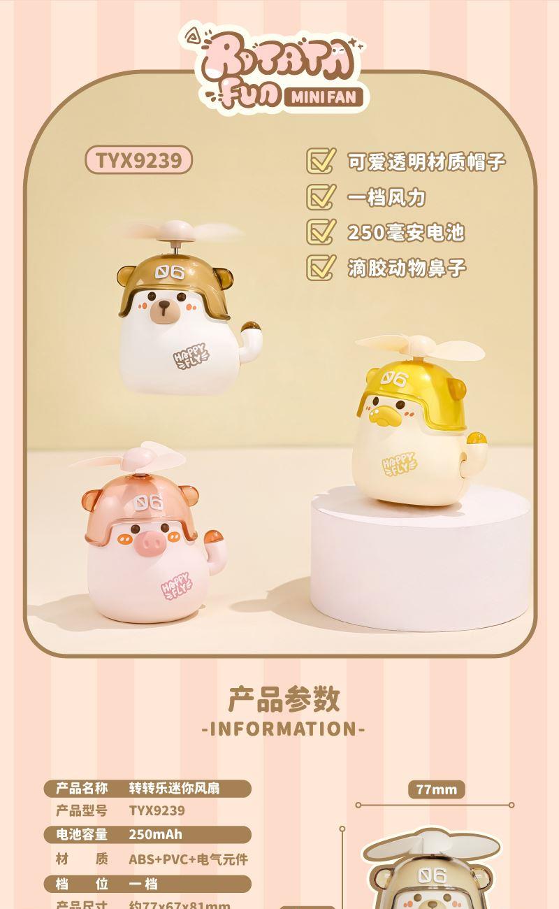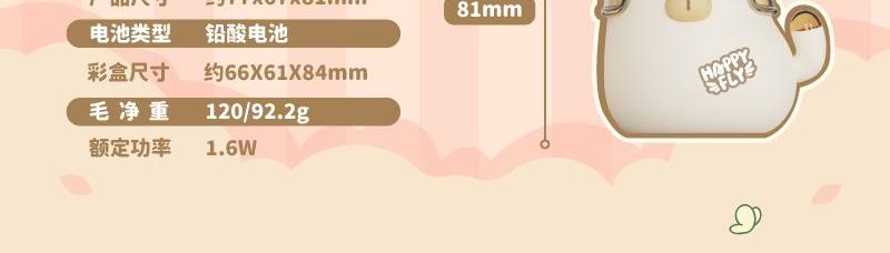 产品颜色:黄色、粉色、棕色 电池容量:250mAh 材质:ABS+PVC+电气元件 档位:一档 产品尺寸:约77x67x81mm 电池类型:铅酸电池 彩盒尺寸:约66X61X84mm 毛净重:120/92.2g 额定功率:1.6W 外箱尺寸:44.5x27.5x41.5cm 整箱毛净重:16/15kg 备注:本产品整箱发货