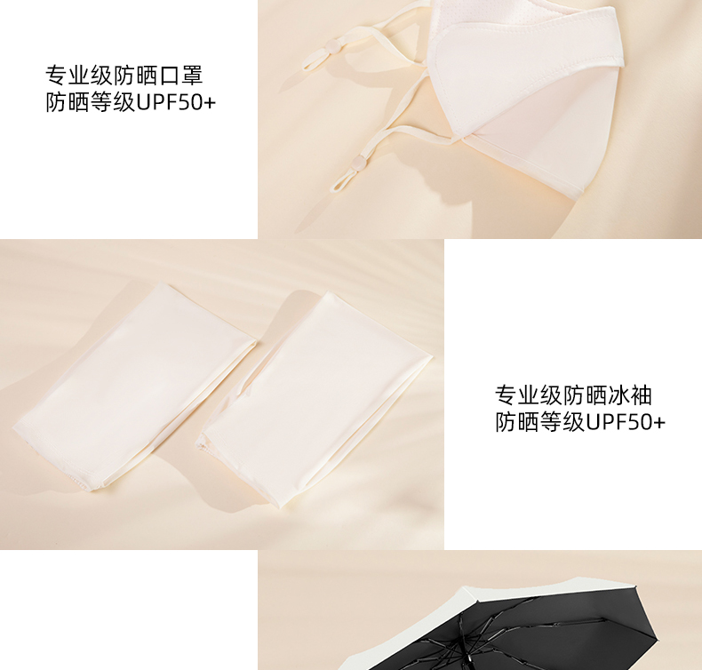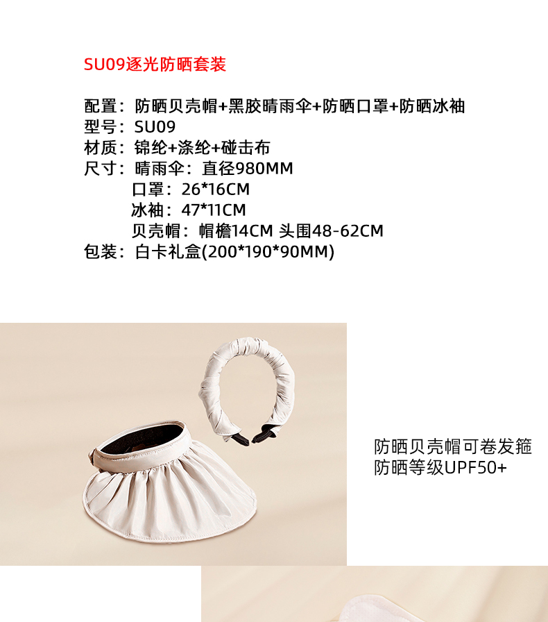 配置:防晒贝壳帽+黑胶晴雨伞+防晒口罩+防晒冰袖 型号:SU09 材质:锦纶+涤纶+碰击布 尺寸:晴雨伞:直径980mm 口罩:26*16cm 冰袖:47*11cm 贝壳帽:帽檐14cm 头围48-62cm 包装:白卡礼盒(200*190*90mm)