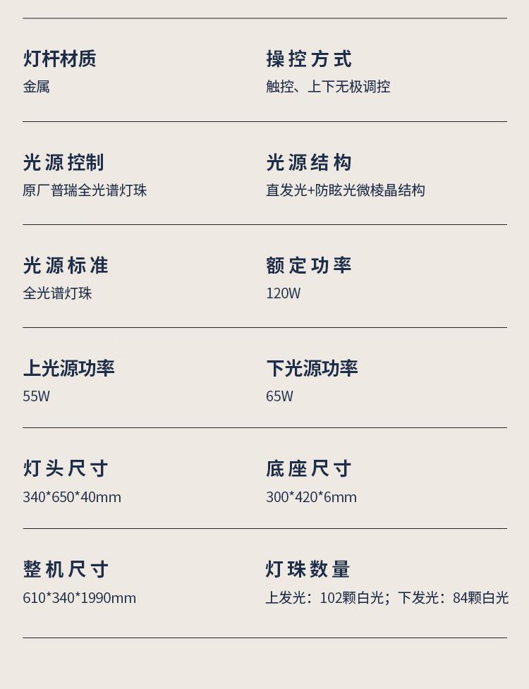 灯杆材质:铁灯杆+塑料灯头+碳素钢底座 操控方式:触控、上下无极调控 光源控制:原厂普瑞全光谱灯珠 光源结构:直发光+防眩光微棱镜结构 光源标准:原装普瑞灯珠 额定功率:120W 上光源功率:55W 下光源功率65W 总 光 通 量:9100lm 中心点照度:1470Lx 均 匀 度: ≤1.1 显色指数Ra:97+1 饱和红色显指R9:>90