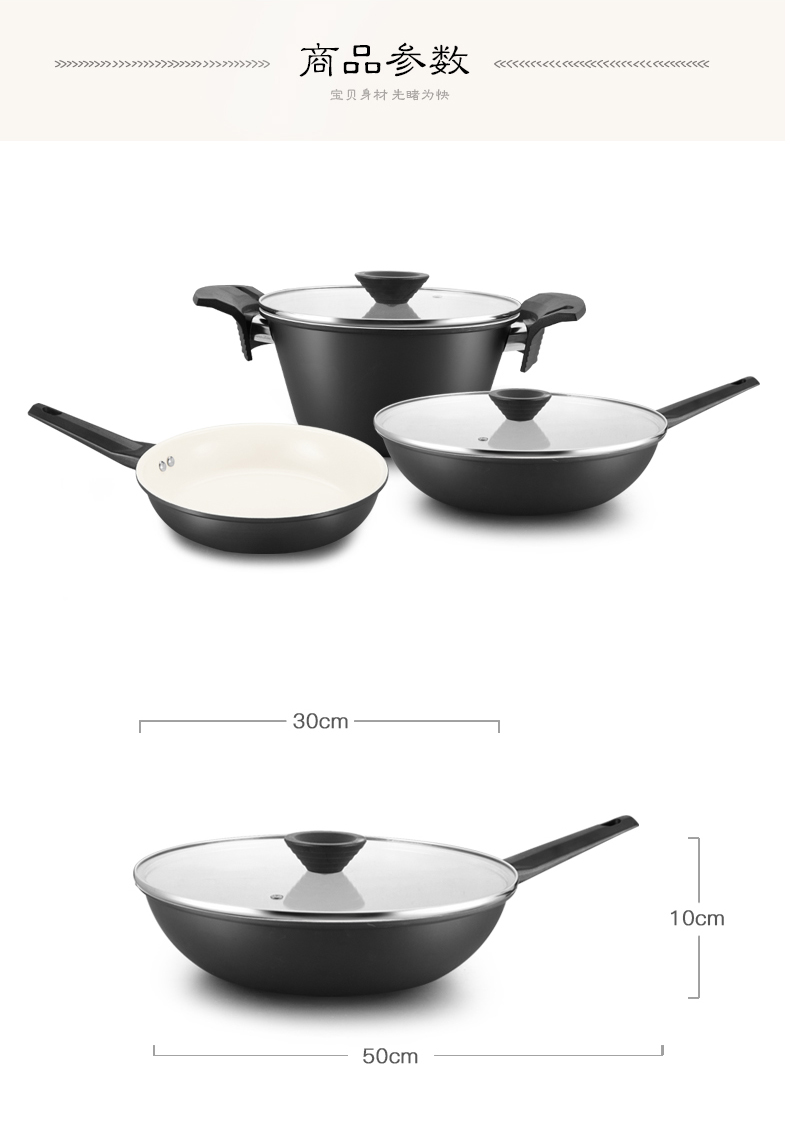 产品型号:LD-104 产品参数:炒锅30cm、煎锅24cm、汤锅24cm 产品材质:精铁 彩盒尺寸:660*160*370 外箱尺寸:68.5*66*39.5(4/只) 条 形 码:6971388522269