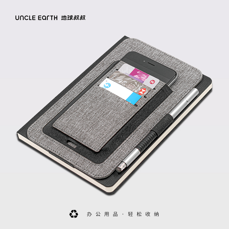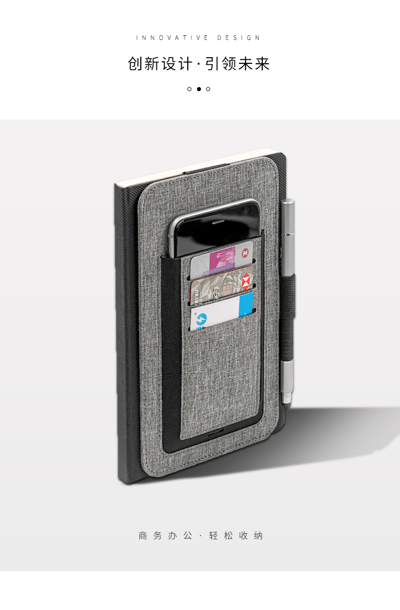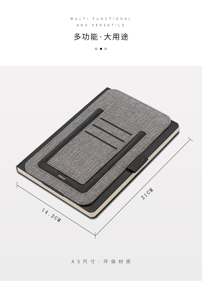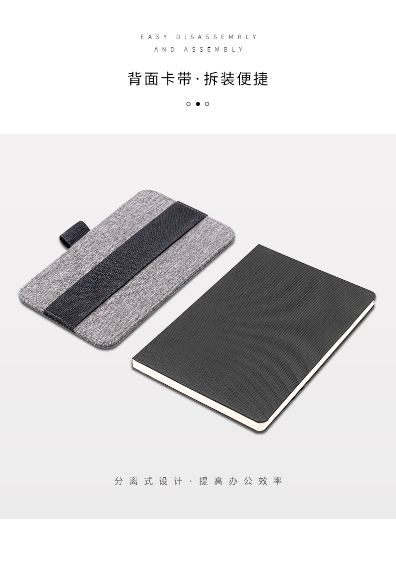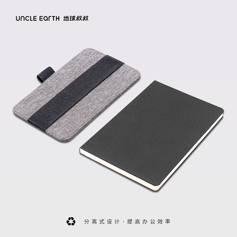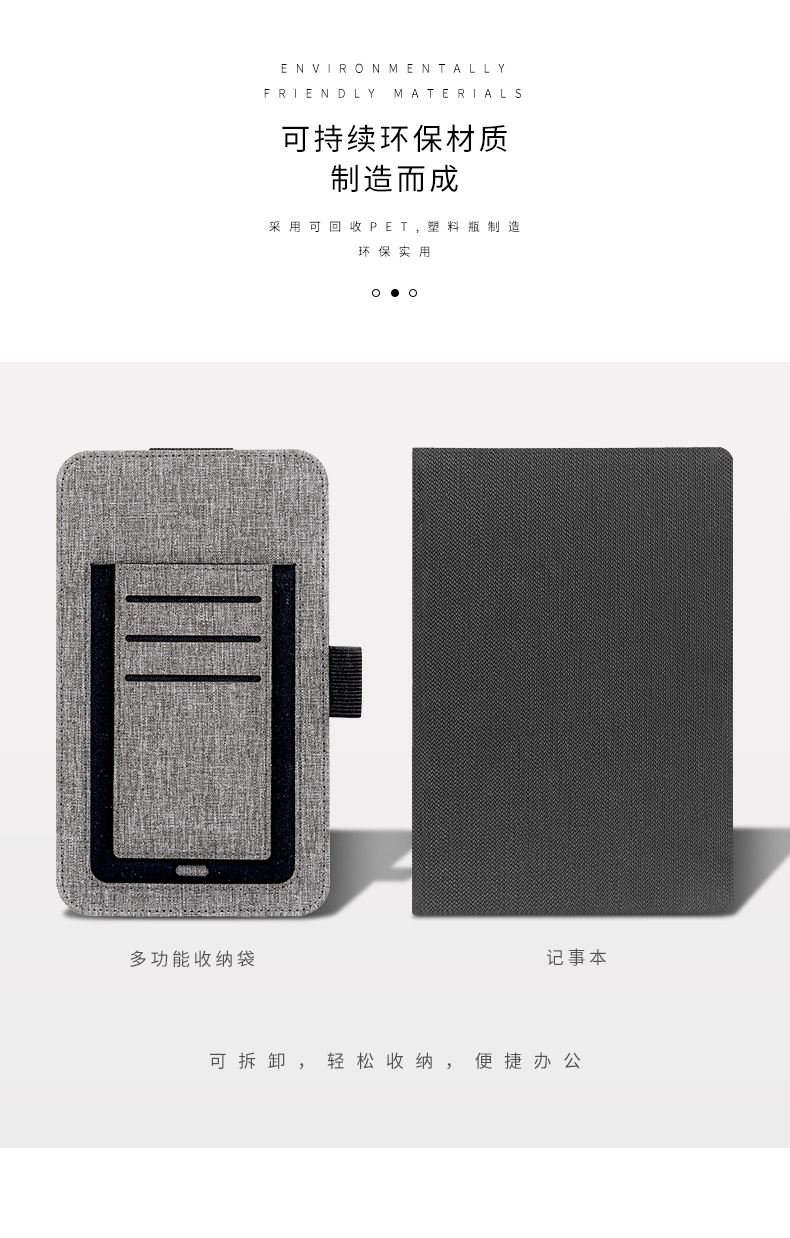 1.记事本Eco, 带有可拆卸的实用腰带收纳“背尔袋”。这款 精装硬纸卡笔记本融合了过去与未来, 配备实用腰带收 纳, 配有集成卡夹、笔环和手机袋等功能。 2.笔记本封面和可拆卸实用收纳“背尔袋带”均由可回收得 PET 聚酷 聚酷瓶材质材质制成。此外, 这款 A5 横格记事 本采用创新的线迹装订, 可在任何水平面上打开, 并采用 适合钢笔的无酸纸。 3.尺寸: 142 x 210 毫米,可丝印单色logo,标准黑色纸盒包装,含封套不含笔,标准装:30.5*24*23cm/20pcs/8kgs
