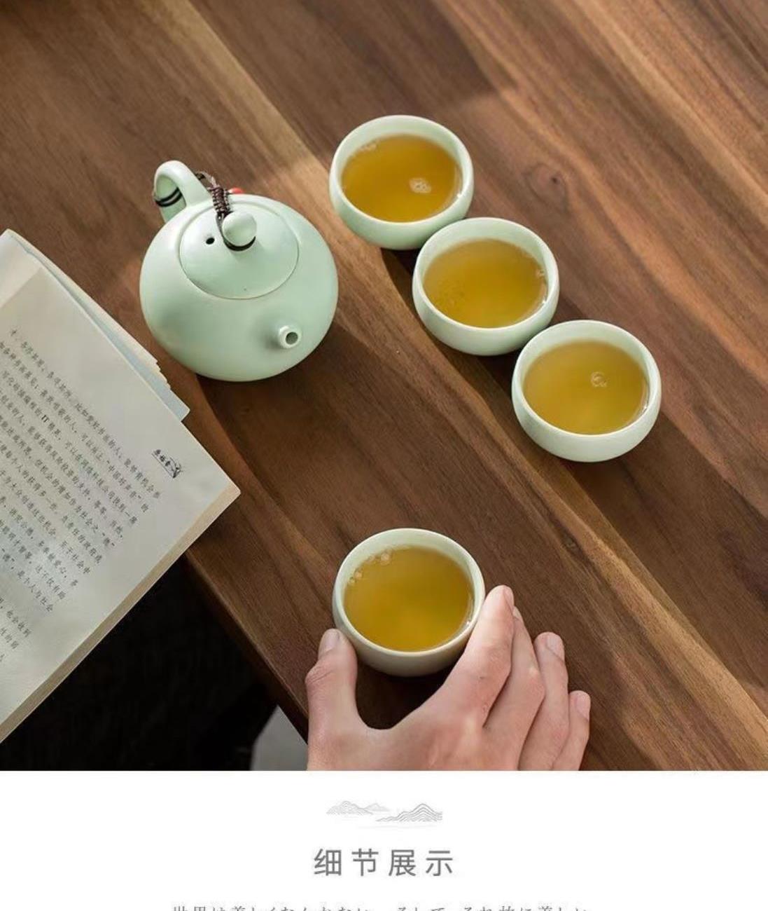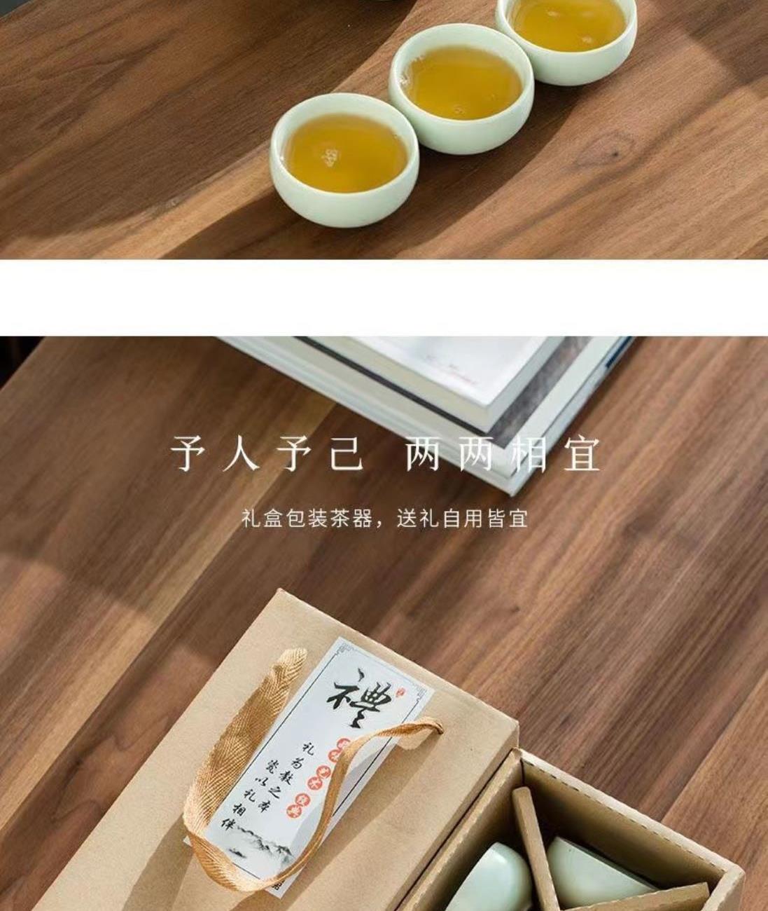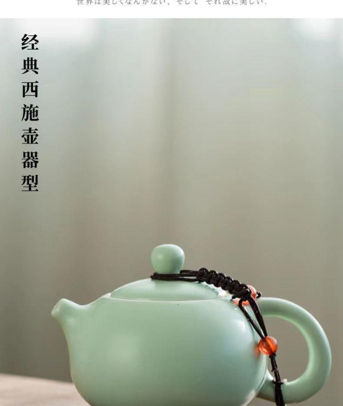 容 量:壶200ML 杯60ml 材 质:仿汝窑瓷 产品配置:1壶+4杯+1提手纸盒 产品尺寸:壶 长9.5CM*高7.3CM 杯长6.3CM*高3.4CM 产品特点: 防壶盖掉地 壶盖钮配有绳子链接壶把,保护壶盖 。 多孔出水口 人性化的过滤孔,能有效的过滤茶渣 。隔热把手 人工衔接,精致工艺,隔热防烫又防滑。