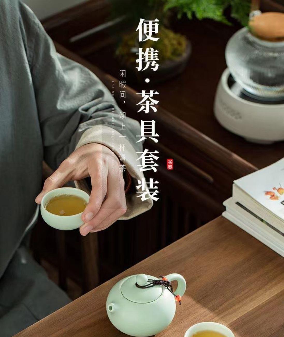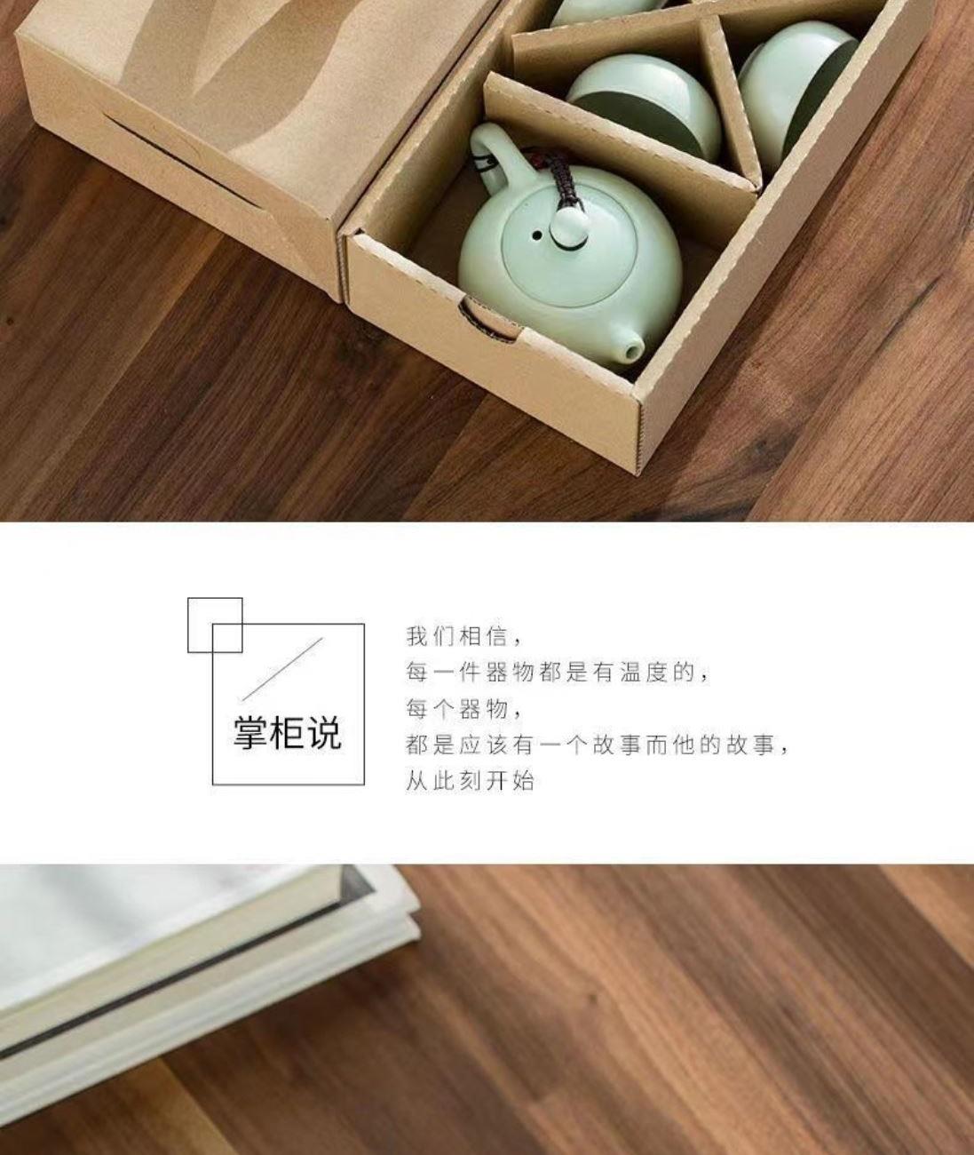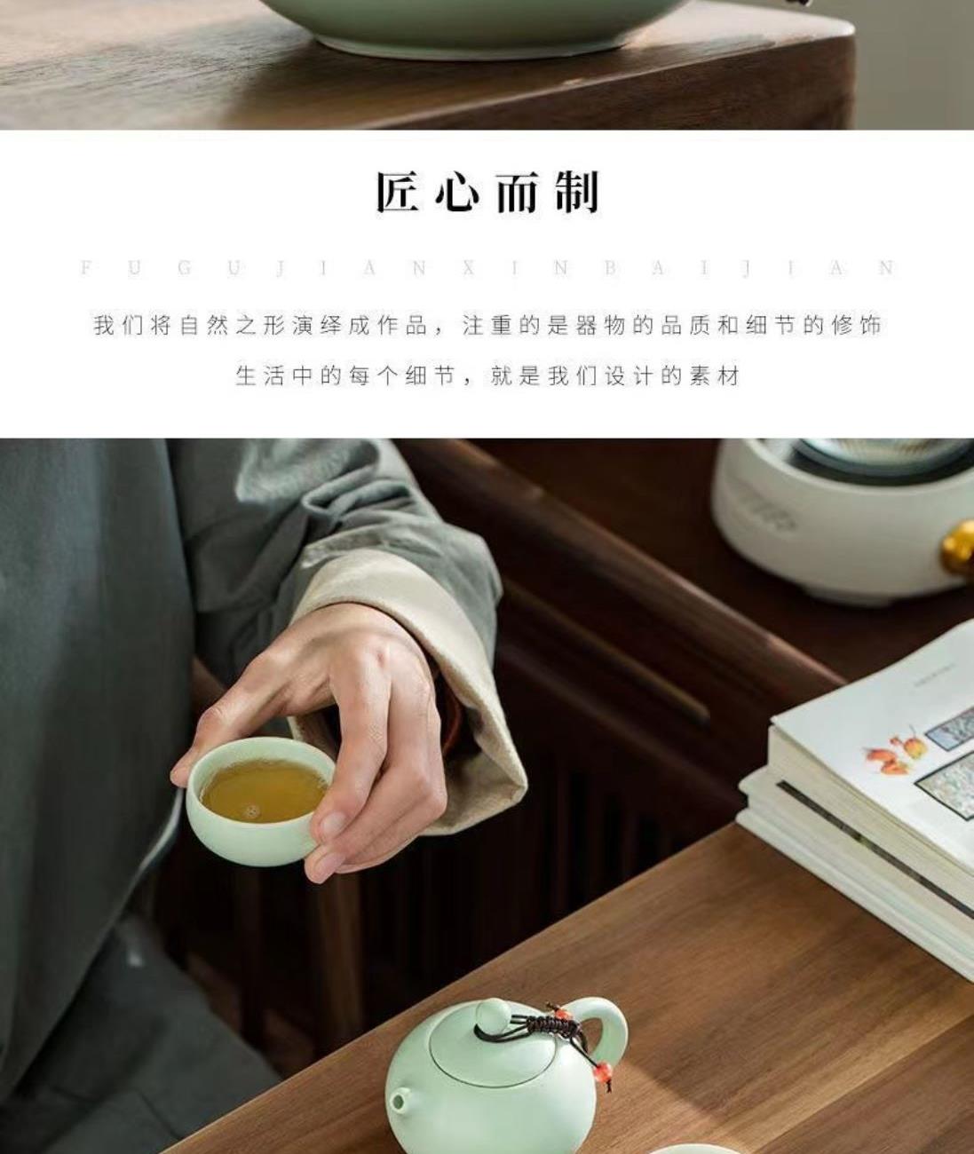 容 量:壶200ML 杯60ml 材 质:仿汝窑瓷 产品配置:1壶+4杯+1提手纸盒 产品尺寸:壶 长9.5CM*高7.3CM 杯长6.3CM*高3.4CM 产品特点: 防壶盖掉地 壶盖钮配有绳子链接壶把,保护壶盖 。 多孔出水口 人性化的过滤孔,能有效的过滤茶渣 。隔热把手 人工衔接,精致工艺,隔热防烫又防滑。