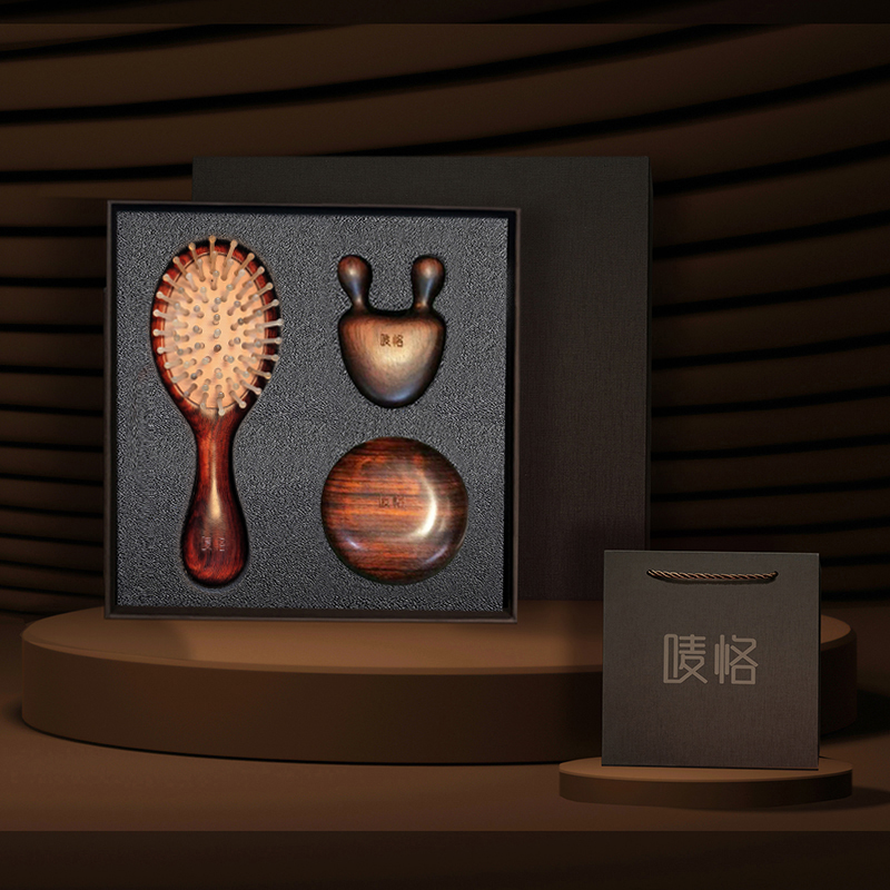 主要材质:檀木、山羊角 气垫梳尺寸:160*60MM(宽处) 檀木笔尺寸:135*11MM 按摩梳尺寸:65*42MM 包装盒尺寸:195*130*48MM