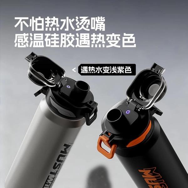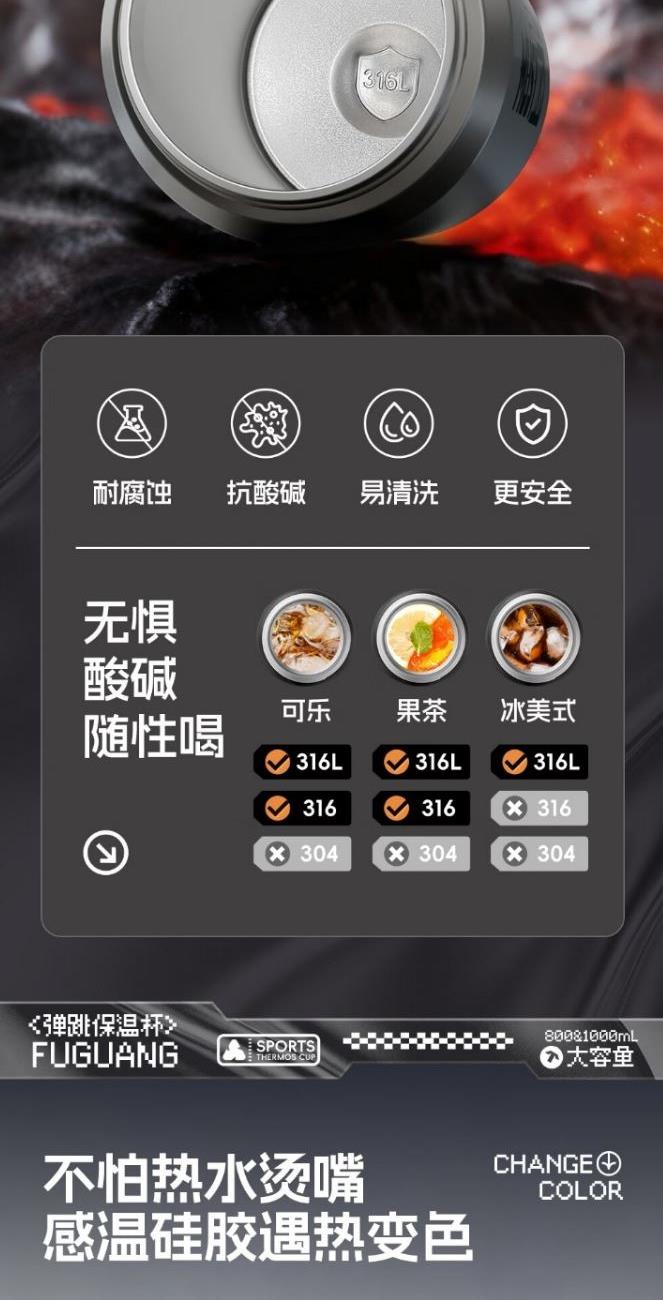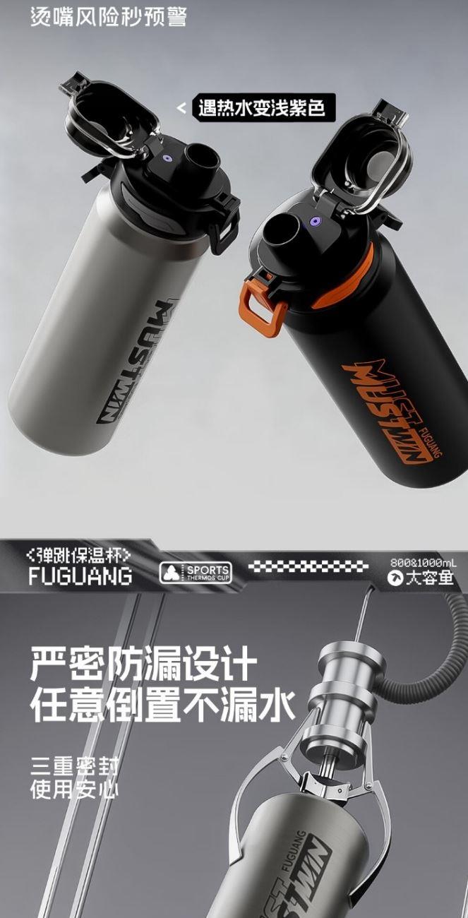 容量:800/1000ml 颜色:黑色灰本色 尺寸:82*274mm 材质:316L奥氏体不锈钢内胆、食品级PP,PC配件。 不怕热水烫嘴感温硅胶遇热变色。 食品级吸管设计柔软不上嘴,便携是手方便出行,硅胶耐磨底垫静音防滑设计。 包装:单瓦盒
