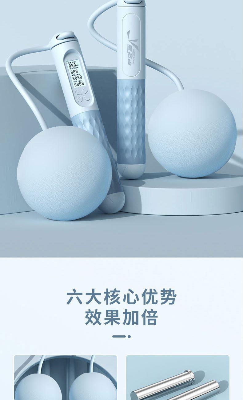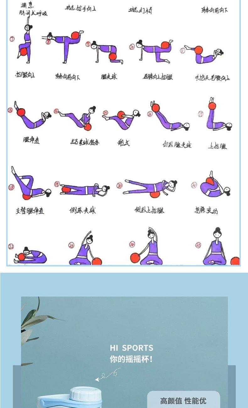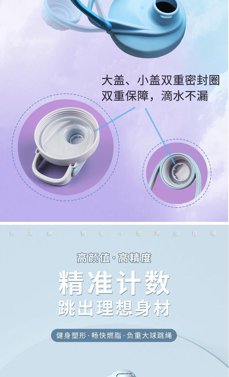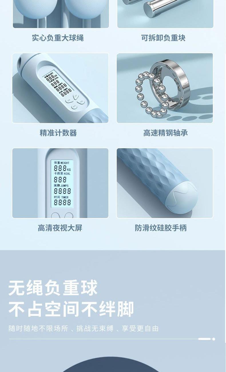 配置:智能计数跳绳X1+八字拉力器X1+瑜伽球X1+摇摇杯500MLX1 产品材质:跳绳:手柄:PP+TPE 长绳:钢丝+pvc 瑜伽球:PVC 拉力器:乳胶管 摇摇杯:食品级PP 颜色:图片色 产品卖点: 1.跳绳两种绳型可选,室内室外运动打破空间局限。 2.加大球体设计,高清背光显示屏,轻松读取运动数据。 3.内置高速钢制轴承,360°不缠绕不打结跳绳更稳定、更顺畅,绳长随意调节,加粗螺旋钢丝不易断。 4.拉力器选用乳胶材质,弹性大不易断。 5. 瑜伽球,23-25cm直径自行控制,黄金尺寸。 6.运动摇摇杯,内置摇摇球,安全旋扣,便携手提。