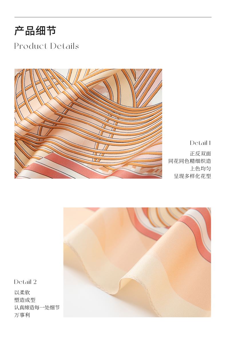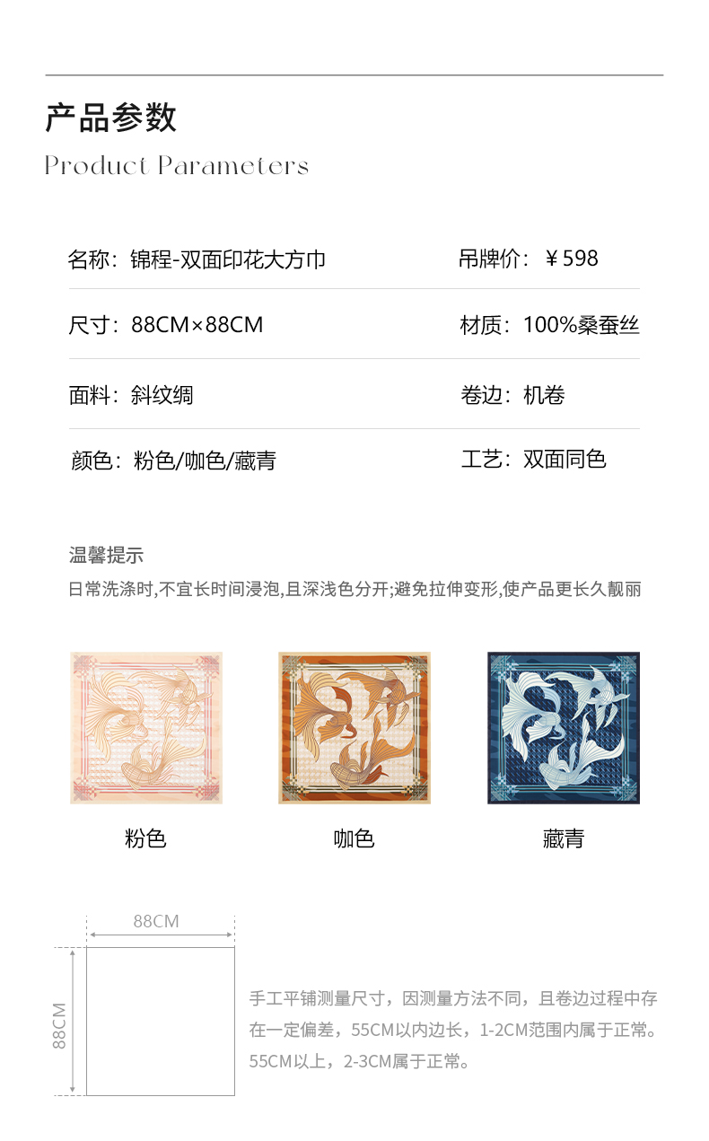 尺寸:88CM×88CM 材质:100桑蚕丝 面料:斜纹绸 卷边:机卷 颜色:粉色/咖色/藏青 工艺:双面同色