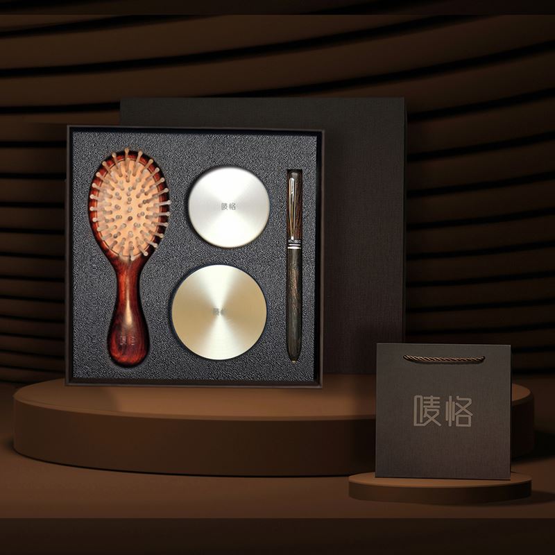 主要材质:老羊角、黄铜、檀木 气垫梳尺寸:160*60MM(宽处) 檀木笔尺寸:135*11MM 薰香尺寸:68*28MM 香罐尺寸:55*18MM 包装尺寸:193*193*65MM