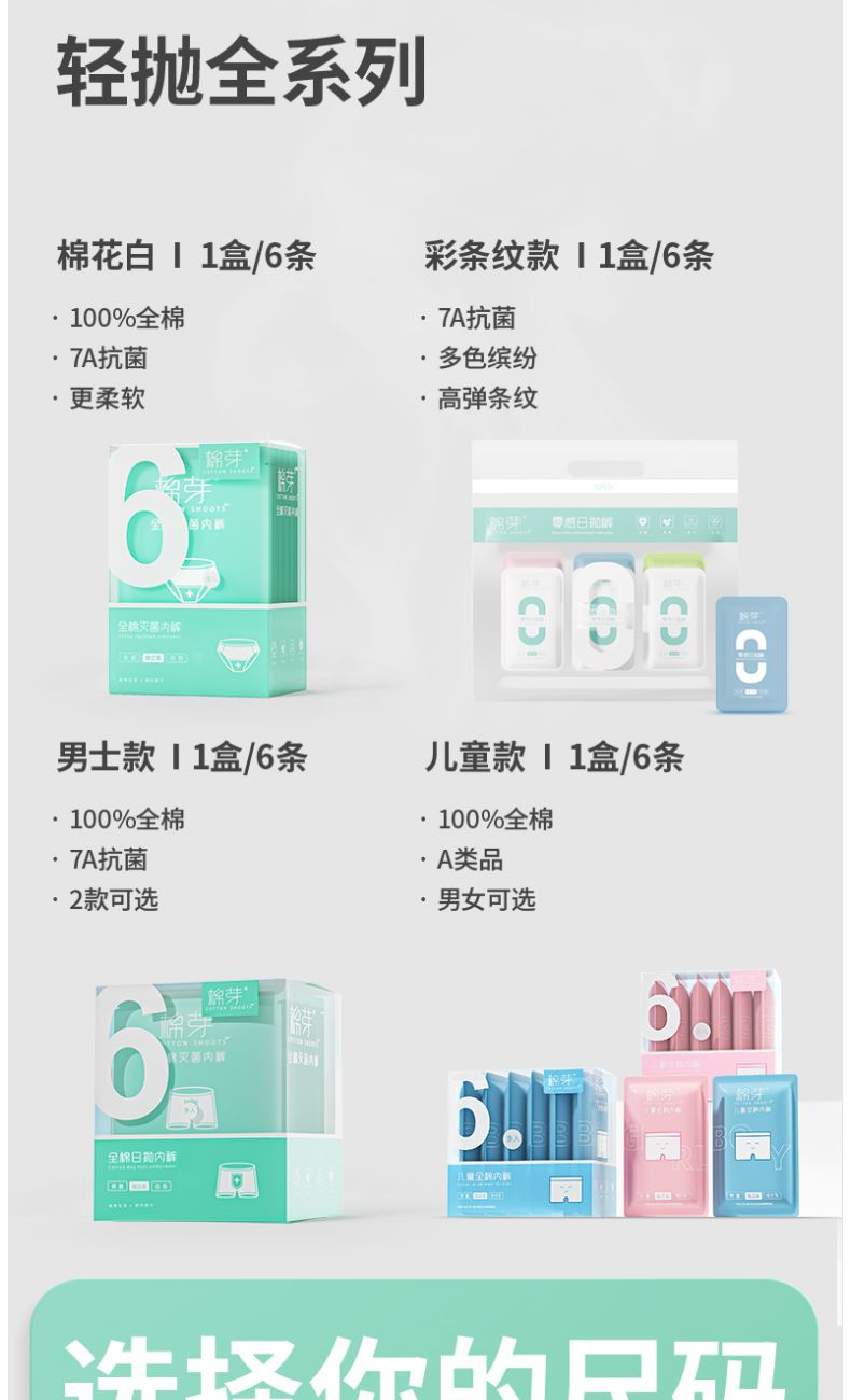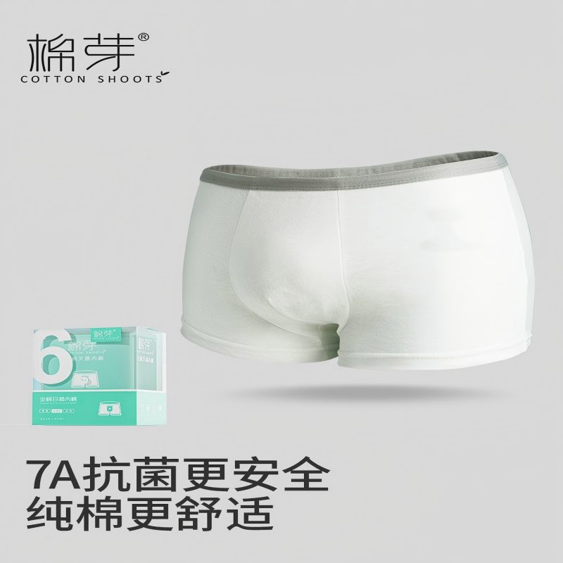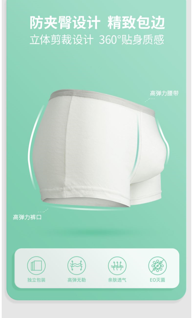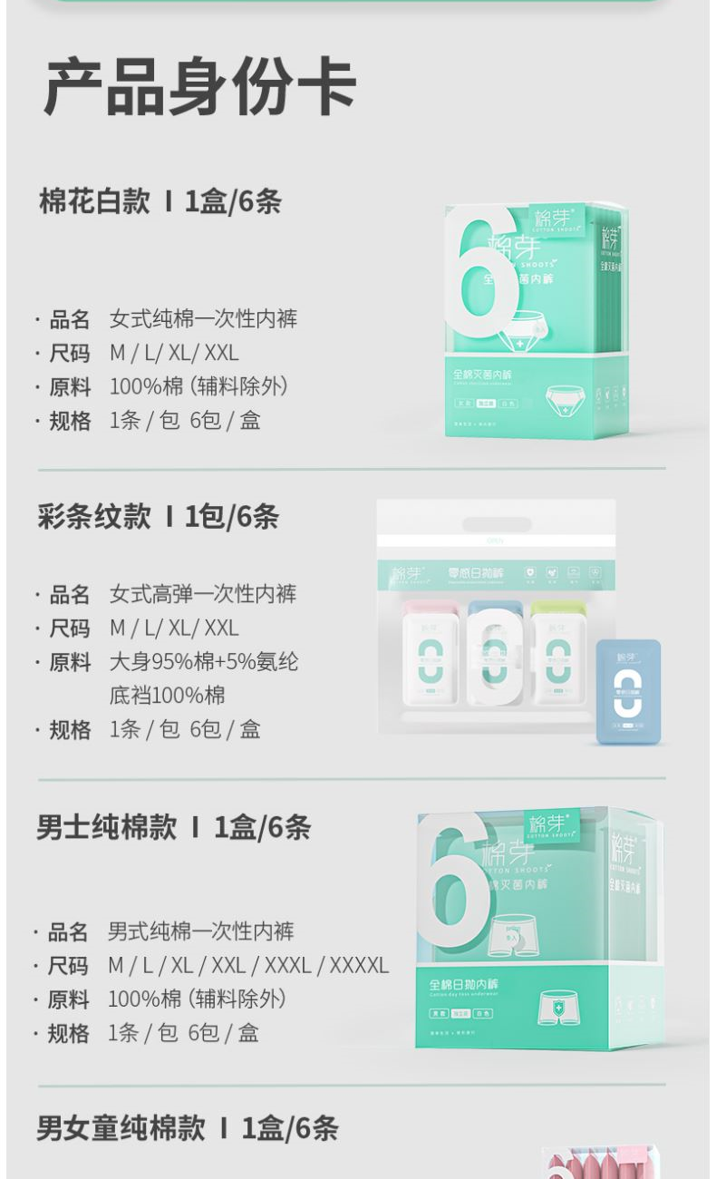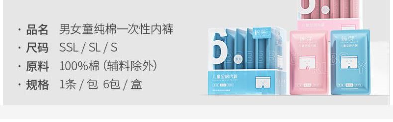 尺码:XL/XXL/3XL/4XL 材质:棉(辅料除外) 净含量:6条/盒*1盒 核心利益点: 1、亲肤柔软、立体剪裁。 2、即拆即穿,穿完即丢,方便出行。 3、铝膜袋真空包装、干净卫生。