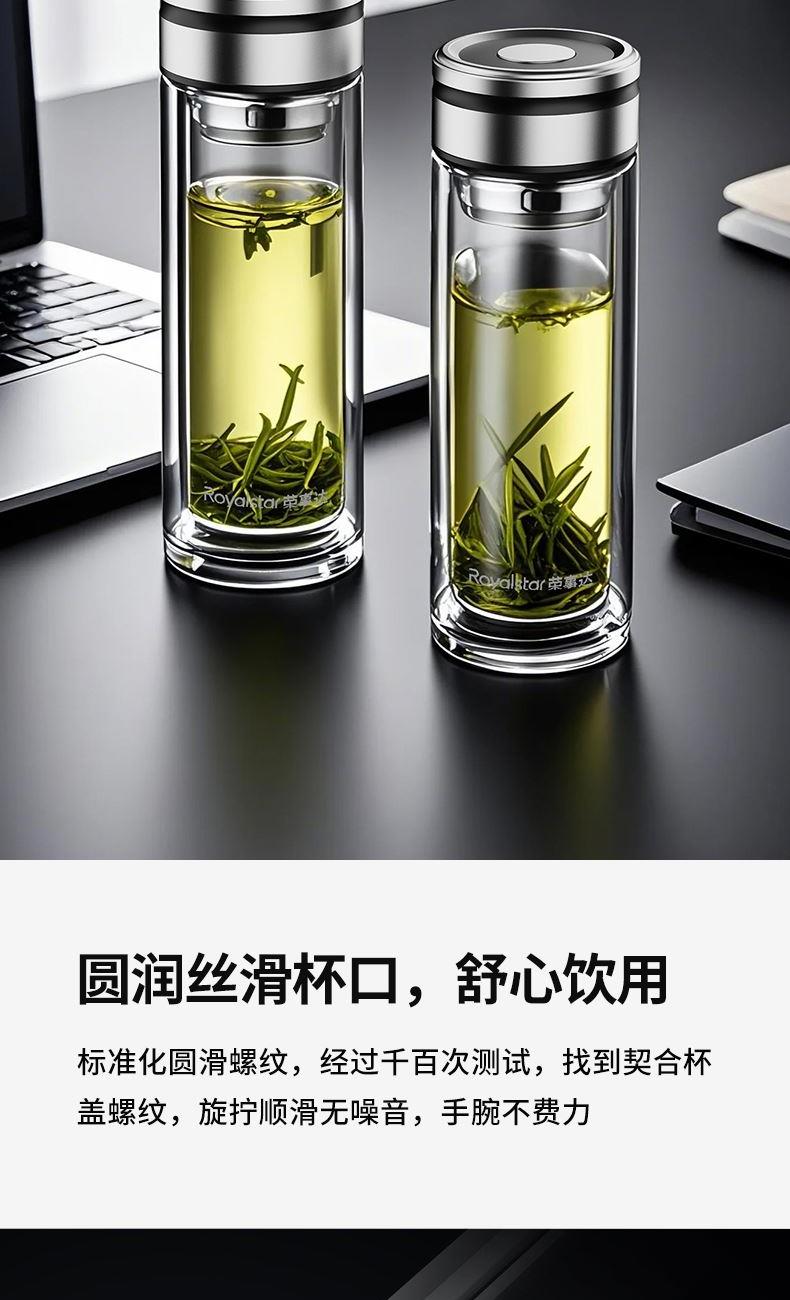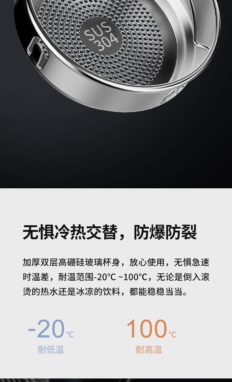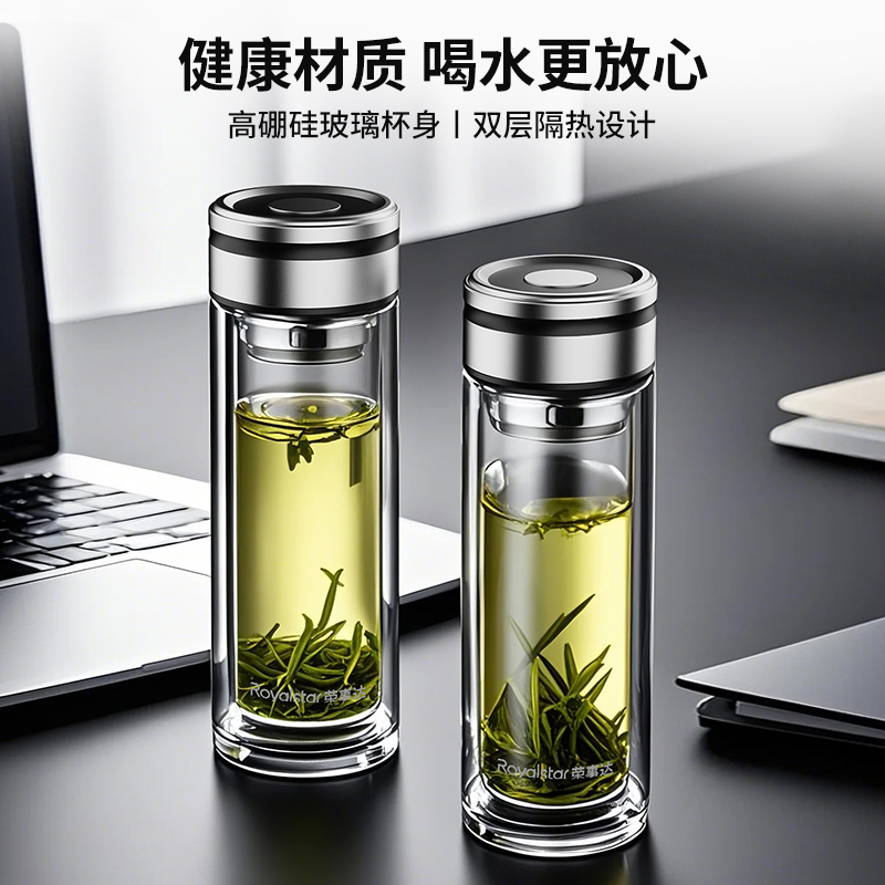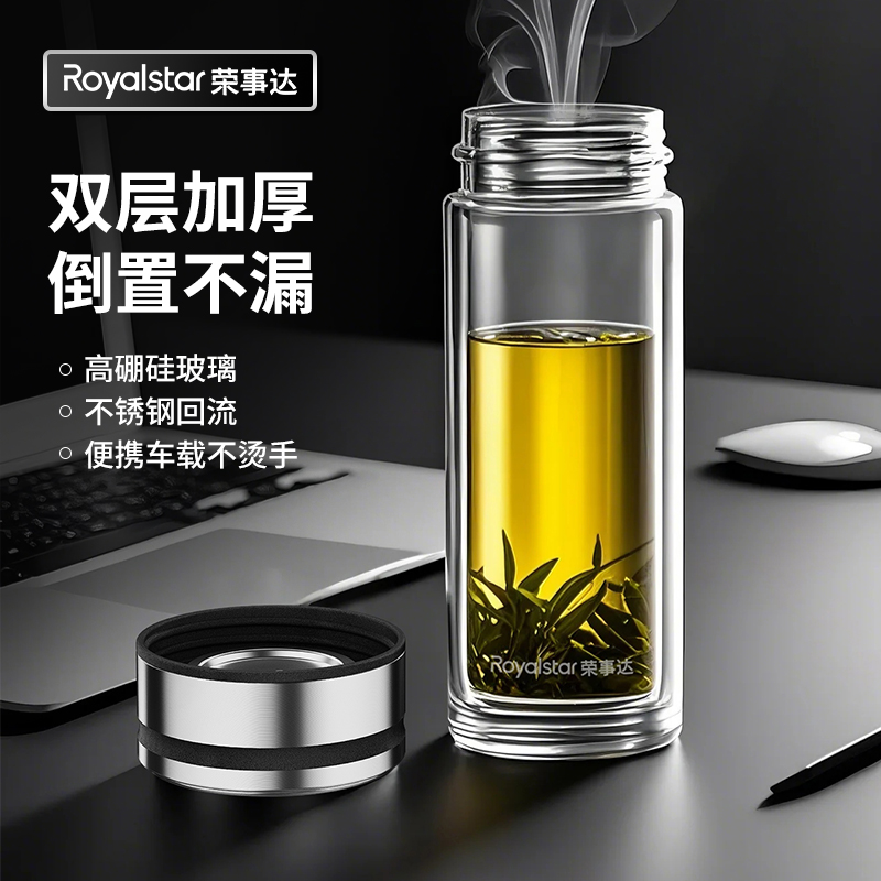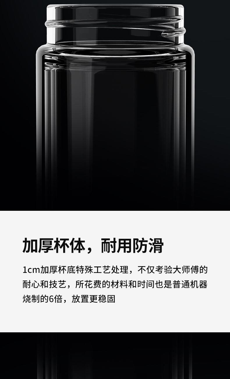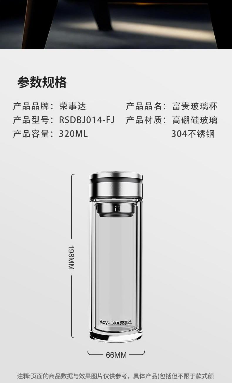 产品型号:RSDBJ014-FJ 产品容量:320ML 产品尺寸: 6.5*6.5*19.5 cm 产品材质:高硼硅玻璃+不锈钢 彩盒尺寸: 7.2*7.2*21cm 外箱尺寸:38.5*38.5*44cm 采用双层高硼硅高透明玻璃构造,经600多度的高温烧制而成,新型绿色环保,晶莹剔透,质感好; 双层玻璃隔热不烫手,延缓温度流失。 优质食品级PP组杯盖加以不锈钢内塞,工艺严谨,造型简约大气,手感细腻舒适。