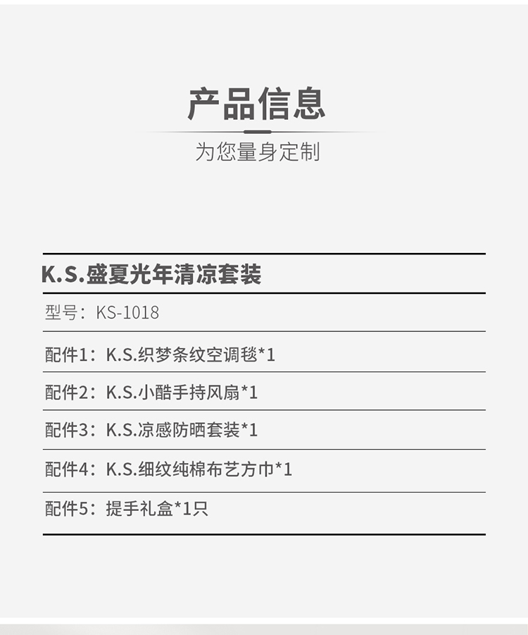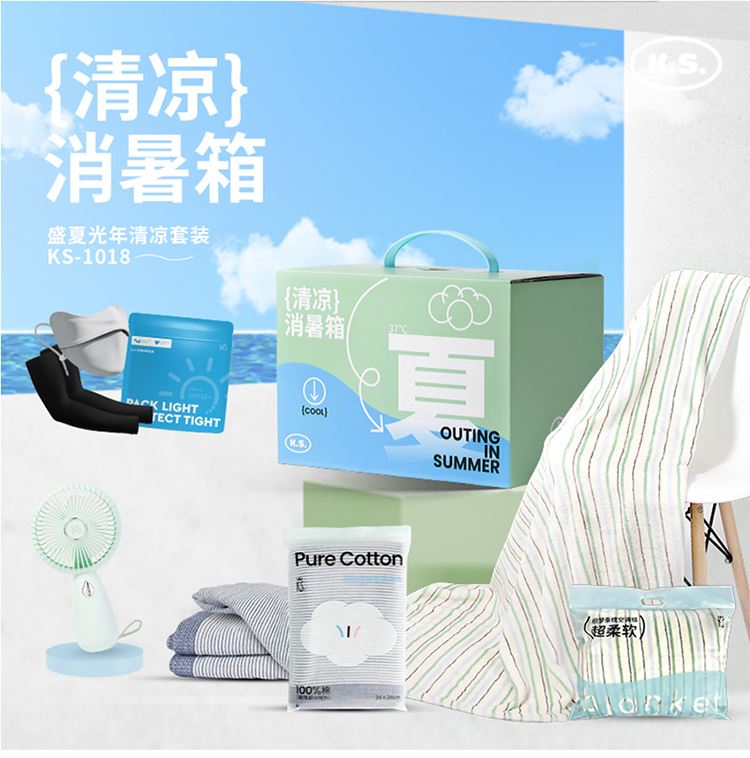 材质:空调毯/300G涤纶针织布 防晒套装/口罩/锦纶+氨纶(装饰物除外) 冰袖/冰袖90%锦纶;10%氨纶 风扇/塑胶,电子原件 方巾/99.99%棉 规格:空调毯/95*140CM 防晒冰袖/均码 防晒口罩/均码 方巾/34*34CM 风扇/16*4.5*8cm 包装:撕拉彩盒 薄荷苏打汽水配色的「夏」字在盒面弹跳,白色光感符号如清风拂过,诠释「消暑美学」的现代诗意。 更适用于高温关怀员工福利/商务合作伴手礼、VIP维护礼等。 套装主打价值感,专业呵护。含有防晒套装、全棉方巾、织梦条纹毯、手持风扇。 尊享灵活定制服务、专属礼赠方案设计、可自由组合套装内容。用夏的清新,重构礼赠社交的温度计量单位。