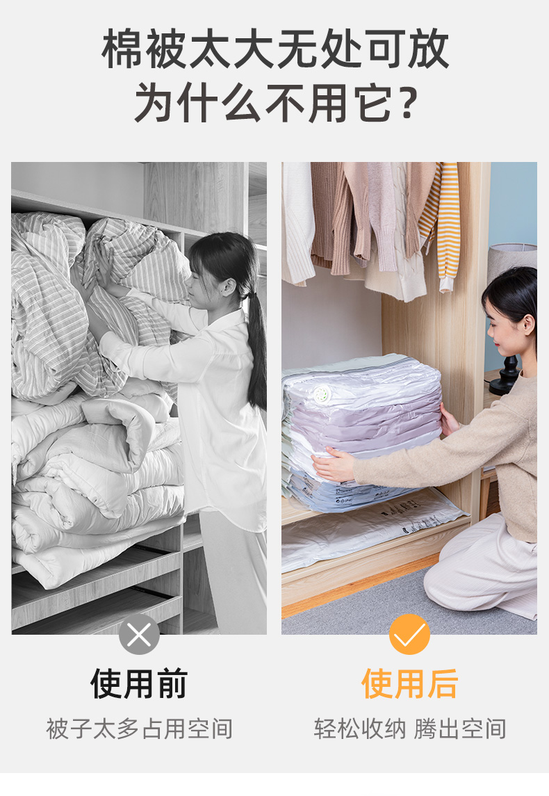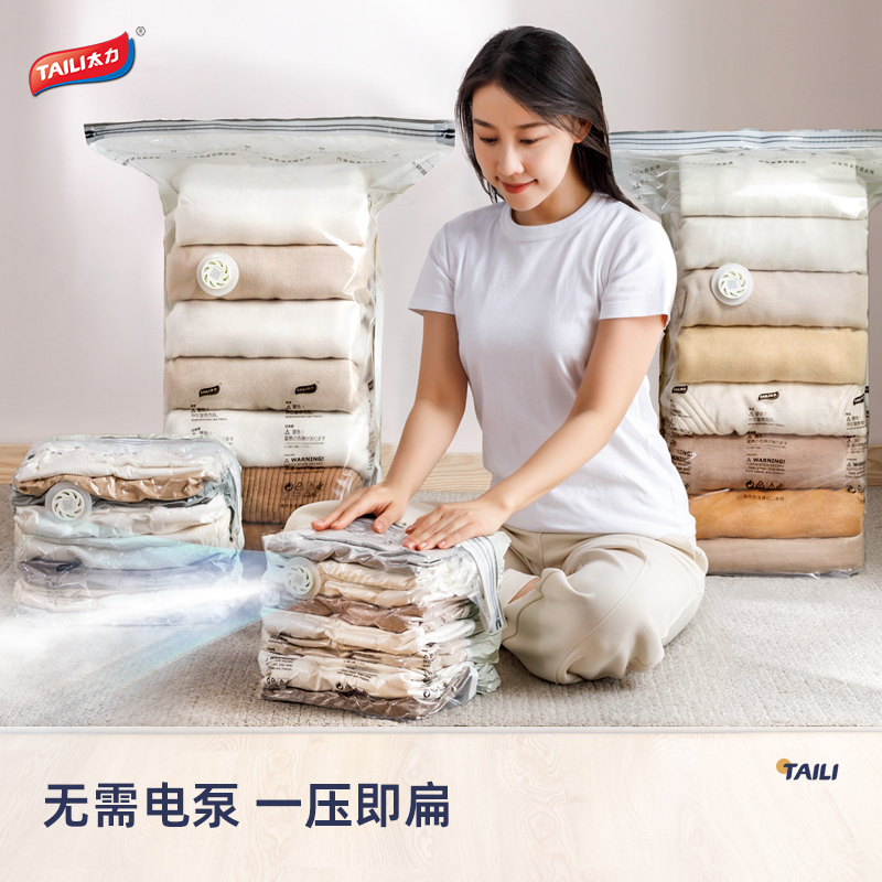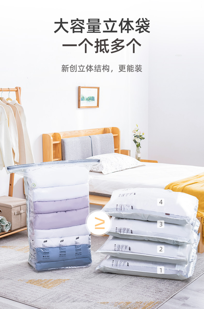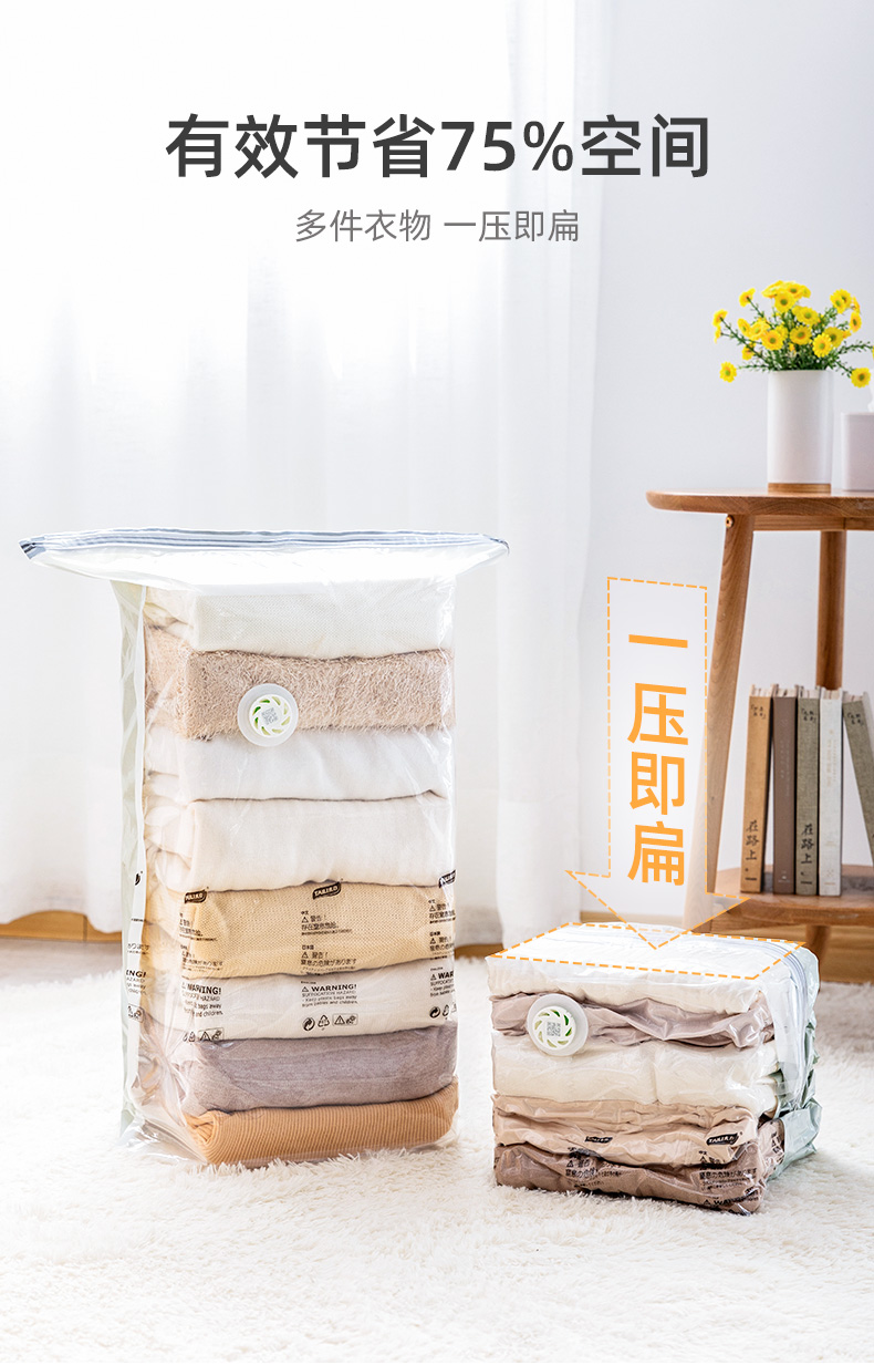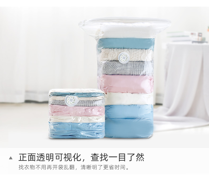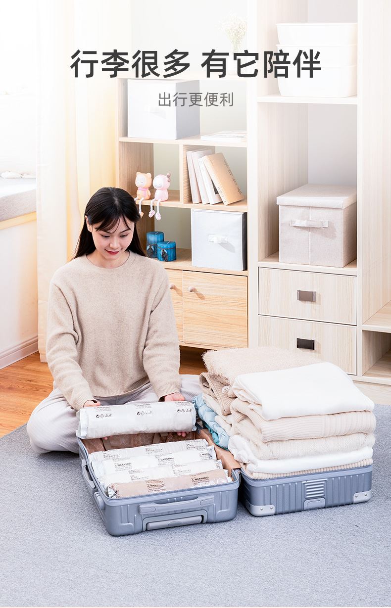 产品尺寸:50*70*30cm(6) 厚度:7丝 材质:塑料 适用对象:衣服,洗漱用品,玩具 类别:压缩袋 适用场景:卧室,旅行 图案:纯色 功能:便携,防水,真空压缩 产品描述:免抽气,真空压缩袋;无需抽气工具,3秒速排;创新气阀,双重密封,严防漏气(密封橡胶塞+按压锁盖结构);回弹效果显著;5层高分子聚合材料,更耐用;防水、防潮密封不漏;强力承重,无惧破坏;小程序智能管理衣物;