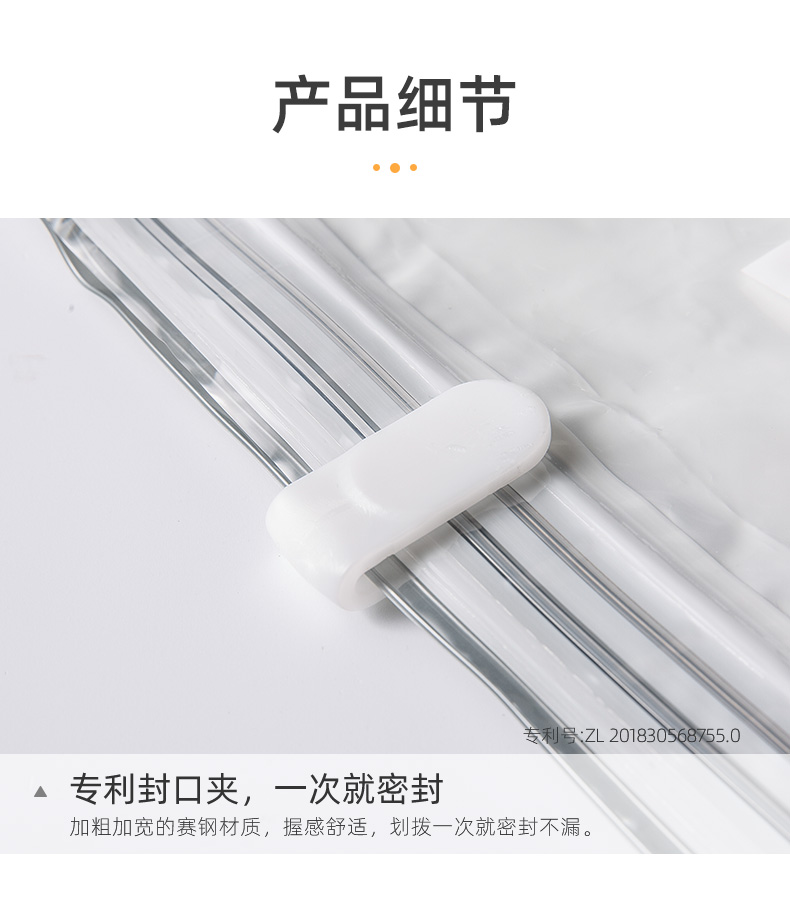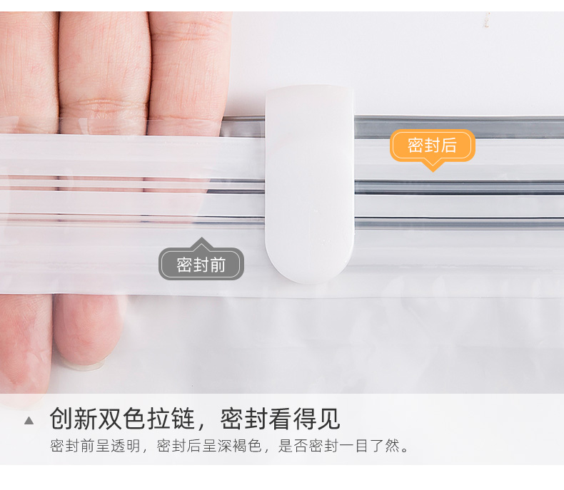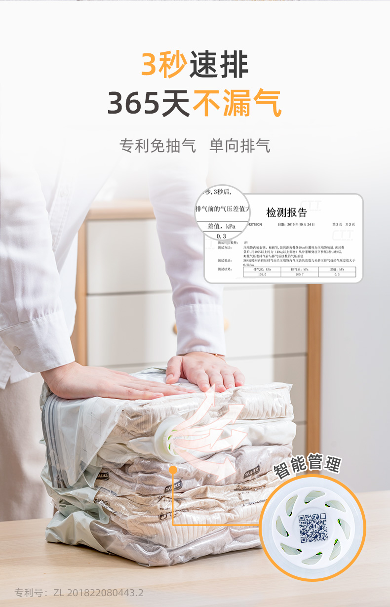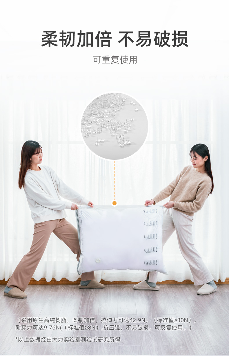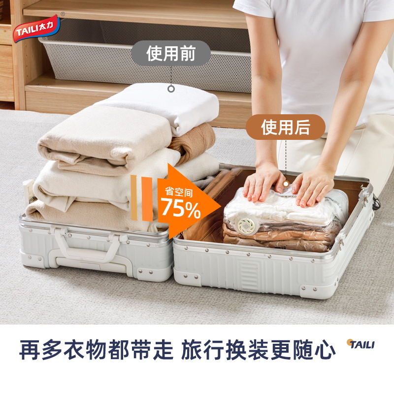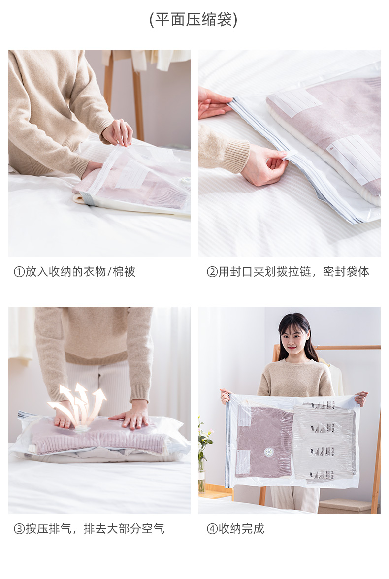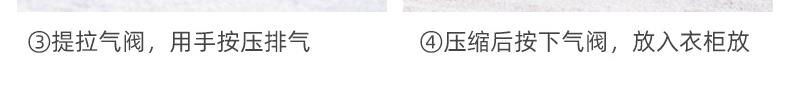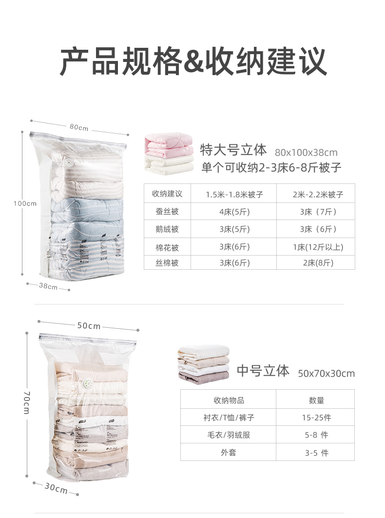 产品尺寸:50*70*30cm(6) 厚度:7丝 材质:塑料 适用对象:衣服,洗漱用品,玩具 类别:压缩袋 适用场景:卧室,旅行 图案:纯色 功能:便携,防水,真空压缩 产品描述:免抽气,真空压缩袋;无需抽气工具,3秒速排;创新气阀,双重密封,严防漏气(密封橡胶塞+按压锁盖结构);回弹效果显著;5层高分子聚合材料,更耐用;防水、防潮密封不漏;强力承重,无惧破坏;小程序智能管理衣物;
