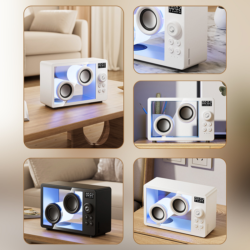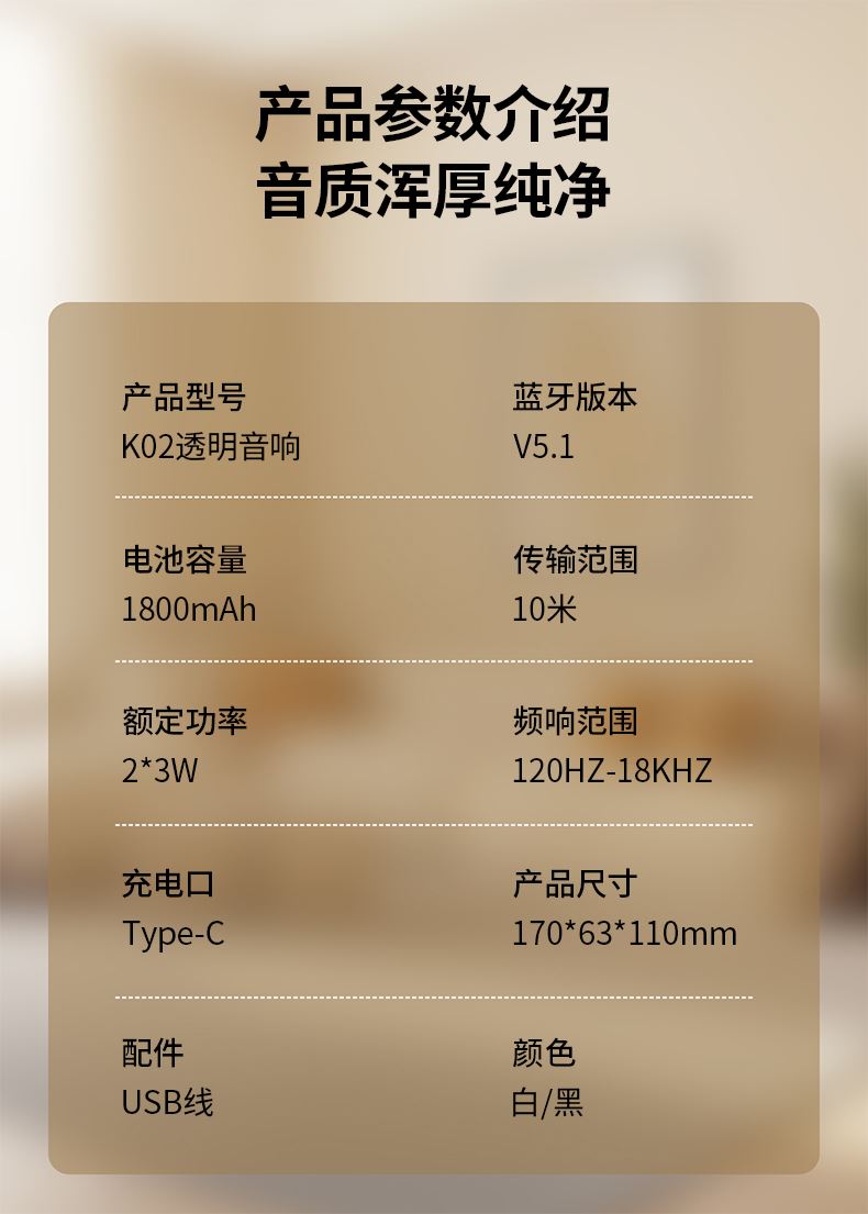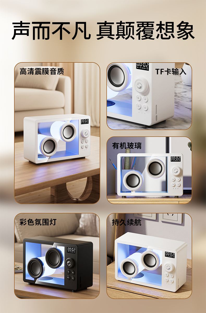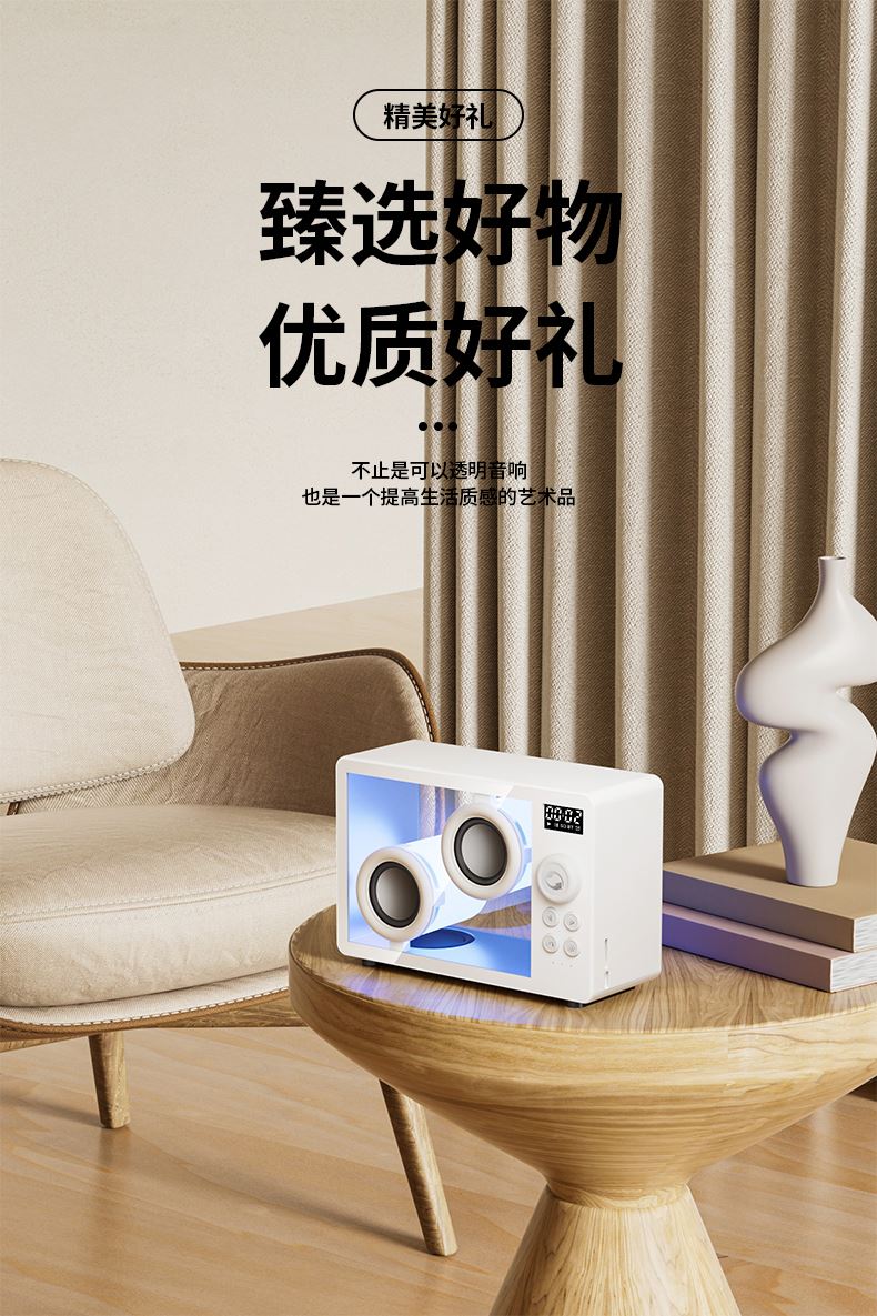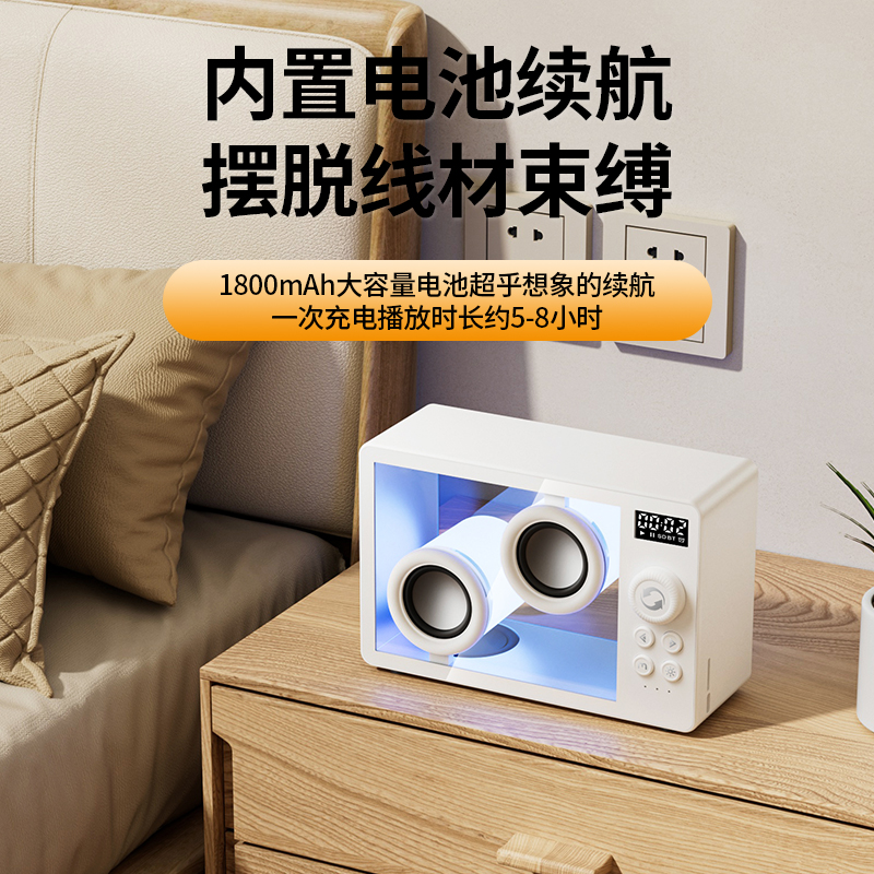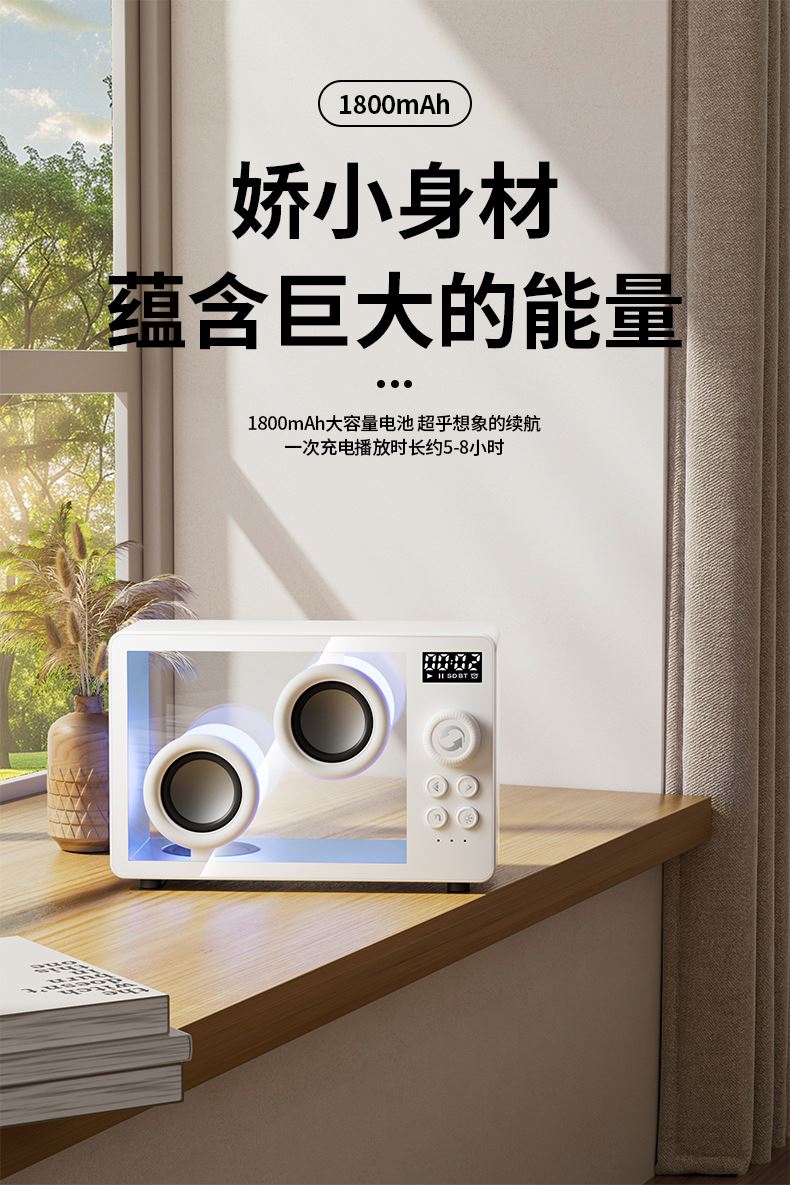 *5.1蓝牙版本、创意旋钮开关 *创意高颜值透明身、1800mAh *双喇叭、数显、可设闹钟、可使用TF卡 *材质:ABS+塑胶+有机玻璃+电子元件 *产品重量:385g *产品尺寸:170x71x114mm *包装盒尺寸:200*93*135mm *外箱尺寸:490*415*428mm *整箱重量: *颜色:白色、黑色 *标配:音箱、充电线、说明书
