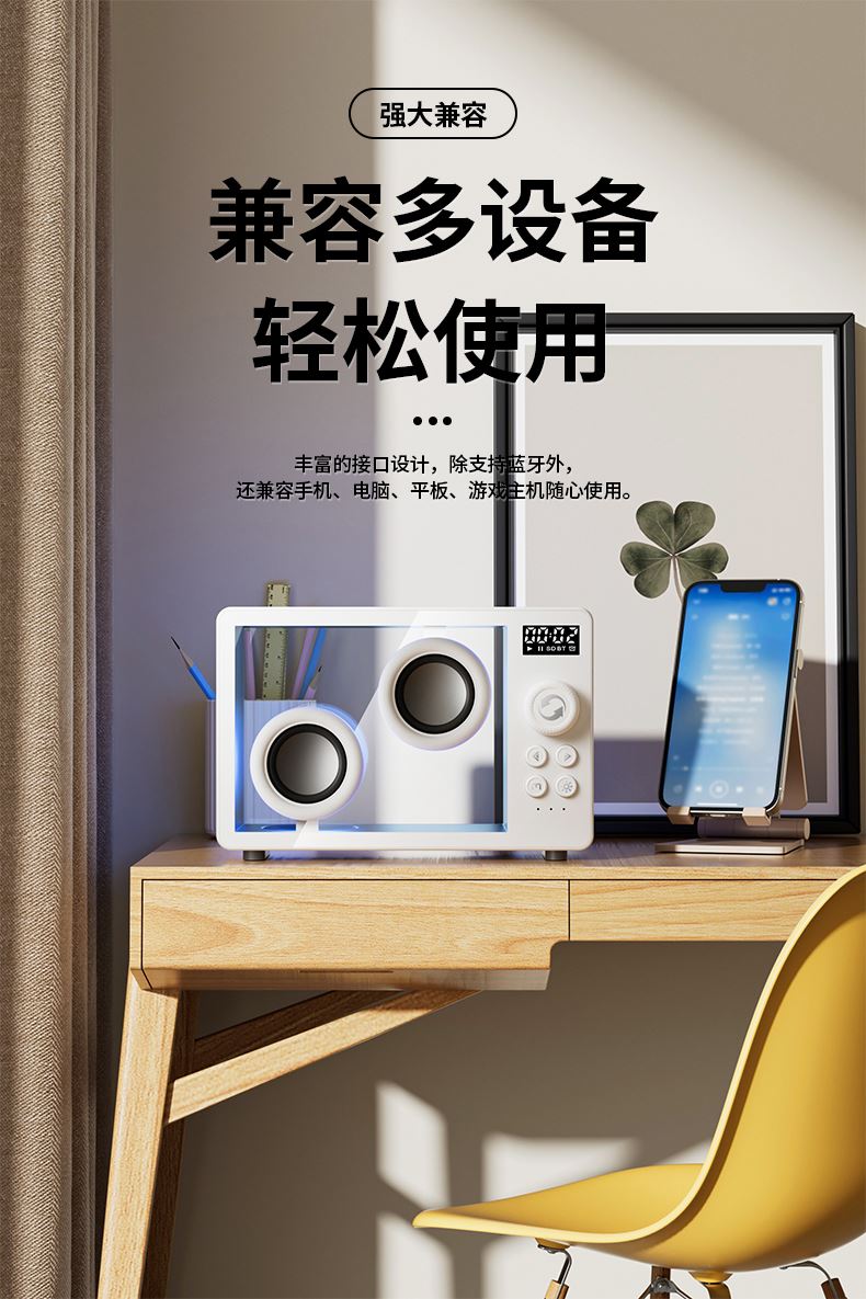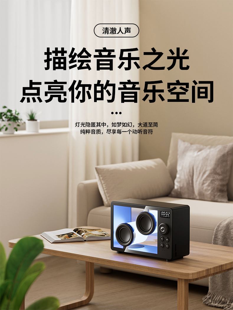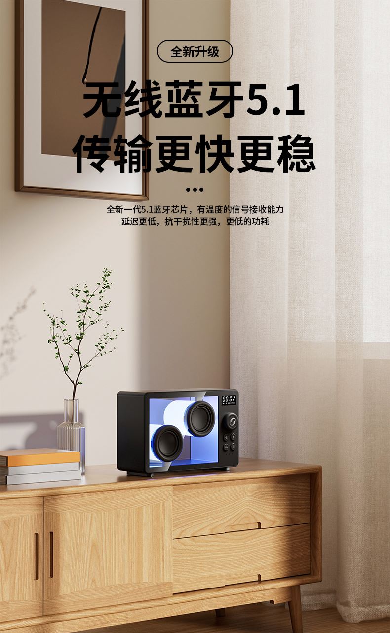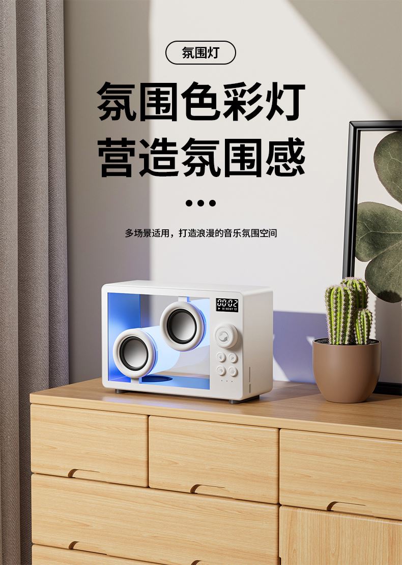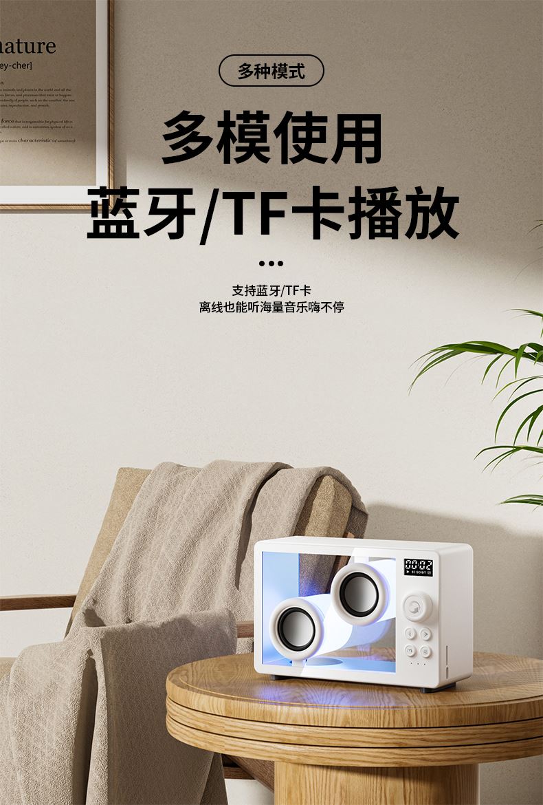 *5.1蓝牙版本、创意旋钮开关 *创意高颜值透明身、1800mAh *双喇叭、数显、可设闹钟、可使用TF卡 *材质:ABS+塑胶+有机玻璃+电子元件 *产品重量:385g *产品尺寸:170x71x114mm *包装盒尺寸:200*93*135mm *外箱尺寸:490*415*428mm *整箱重量: *颜色:白色、黑色 *标配:音箱、充电线、说明书
