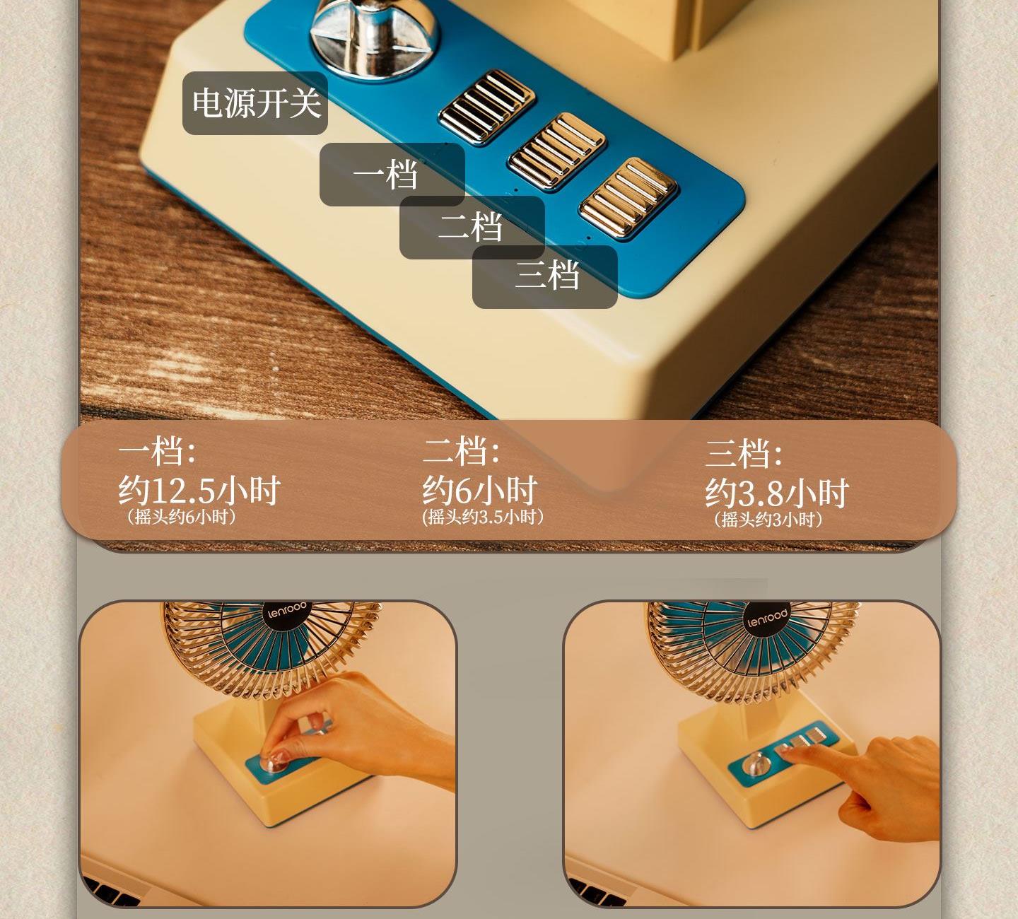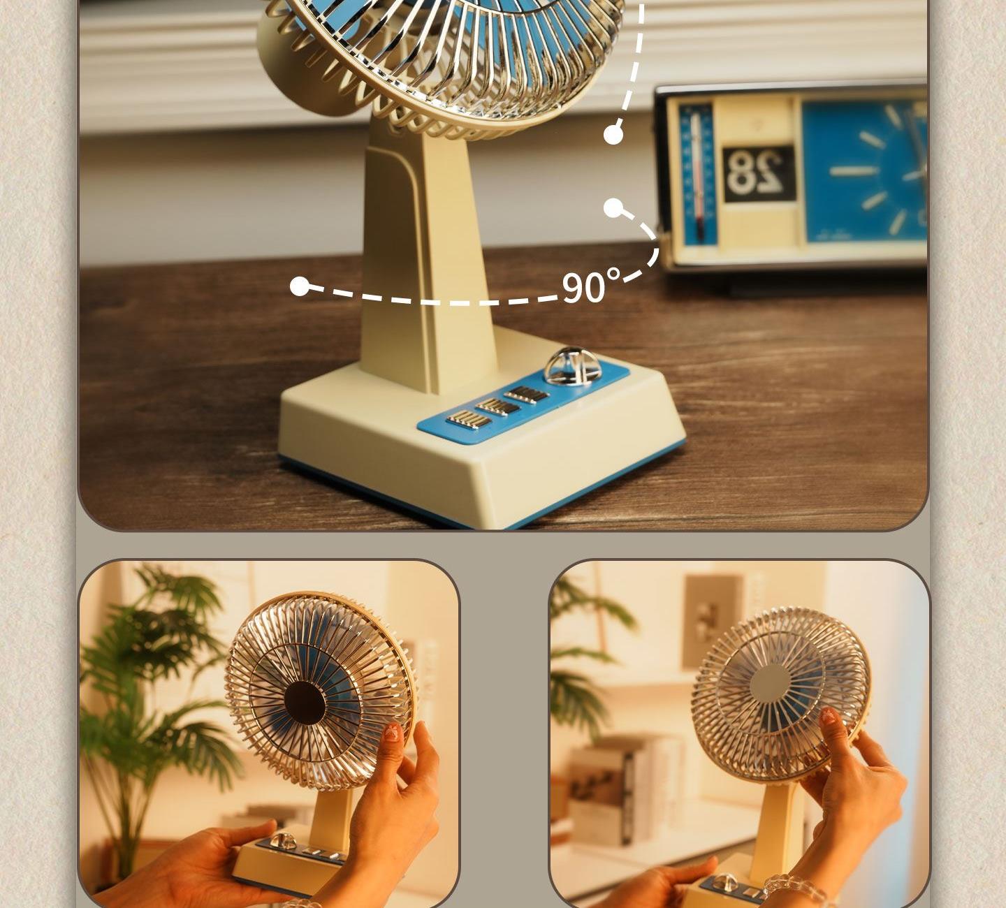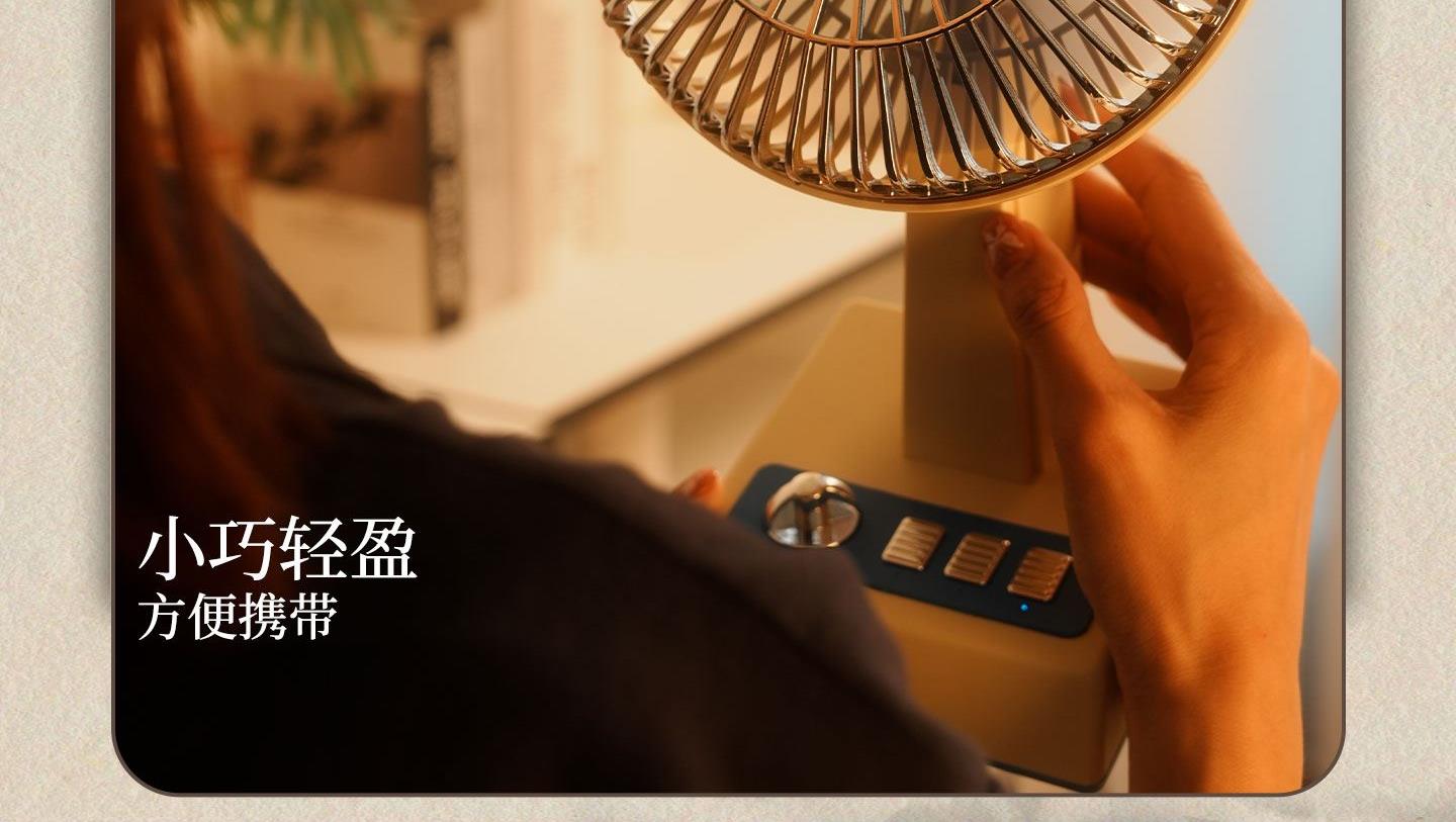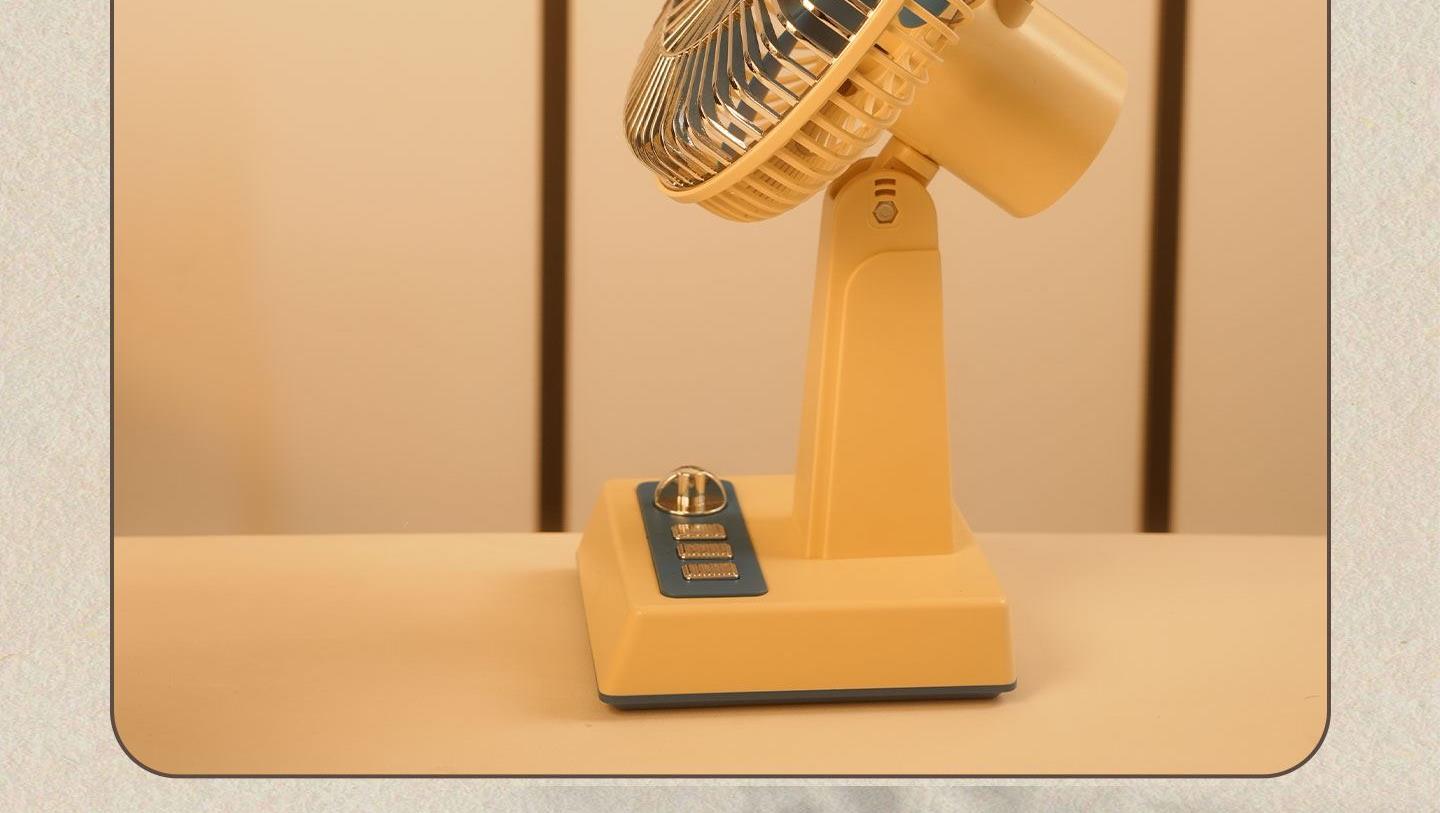 产品参数 额定功率:6W 包装尺寸:173*132*276mm 产品功能说明: 1、复古式风格设计 2、三挡风力调节 3、静音底噪运行 4、3600mah超大容量电池 5、3-12小时超长续航 6、左右、上下多方位调节 7、支持壁挂/桌面多场景灵活使用 8、USB 便捷充电接口