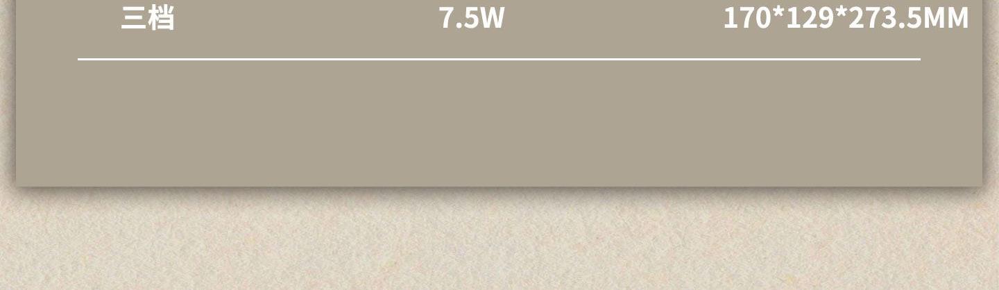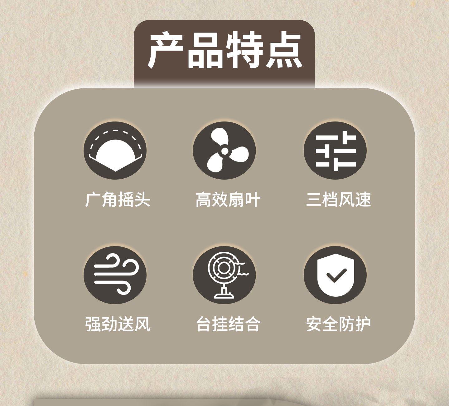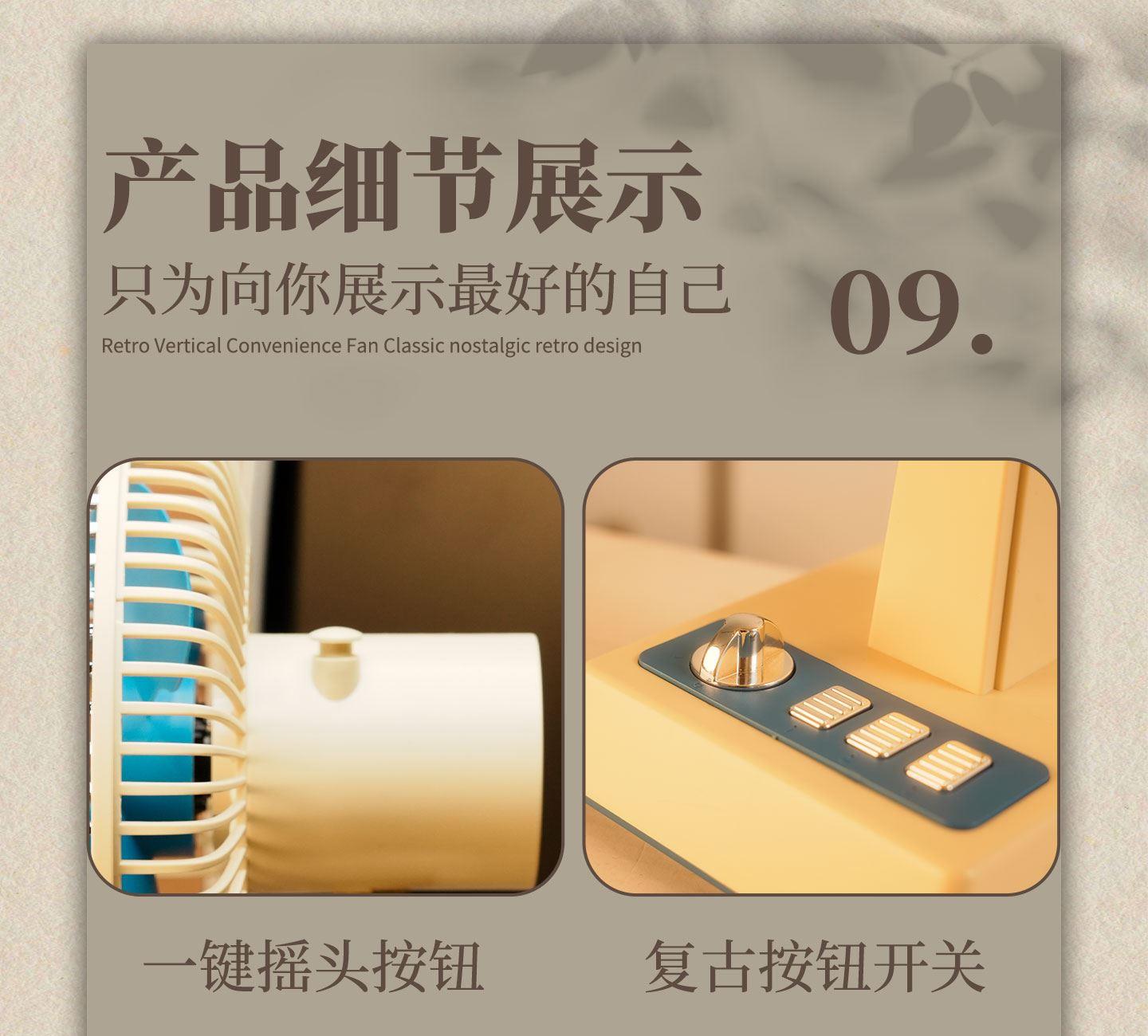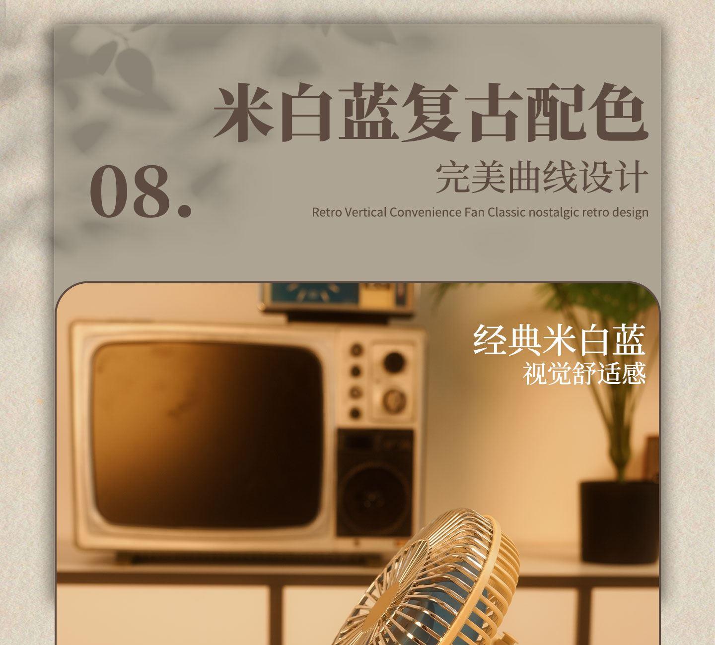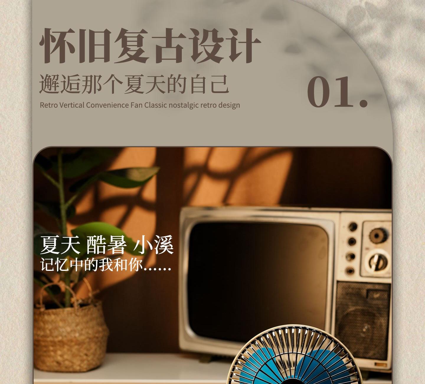 产品参数 额定功率:6W 包装尺寸:173*132*276mm 产品功能说明: 1、复古式风格设计 2、三挡风力调节 3、静音底噪运行 4、3600mah超大容量电池 5、3-12小时超长续航 6、左右、上下多方位调节 7、支持壁挂/桌面多场景灵活使用 8、USB 便捷充电接口