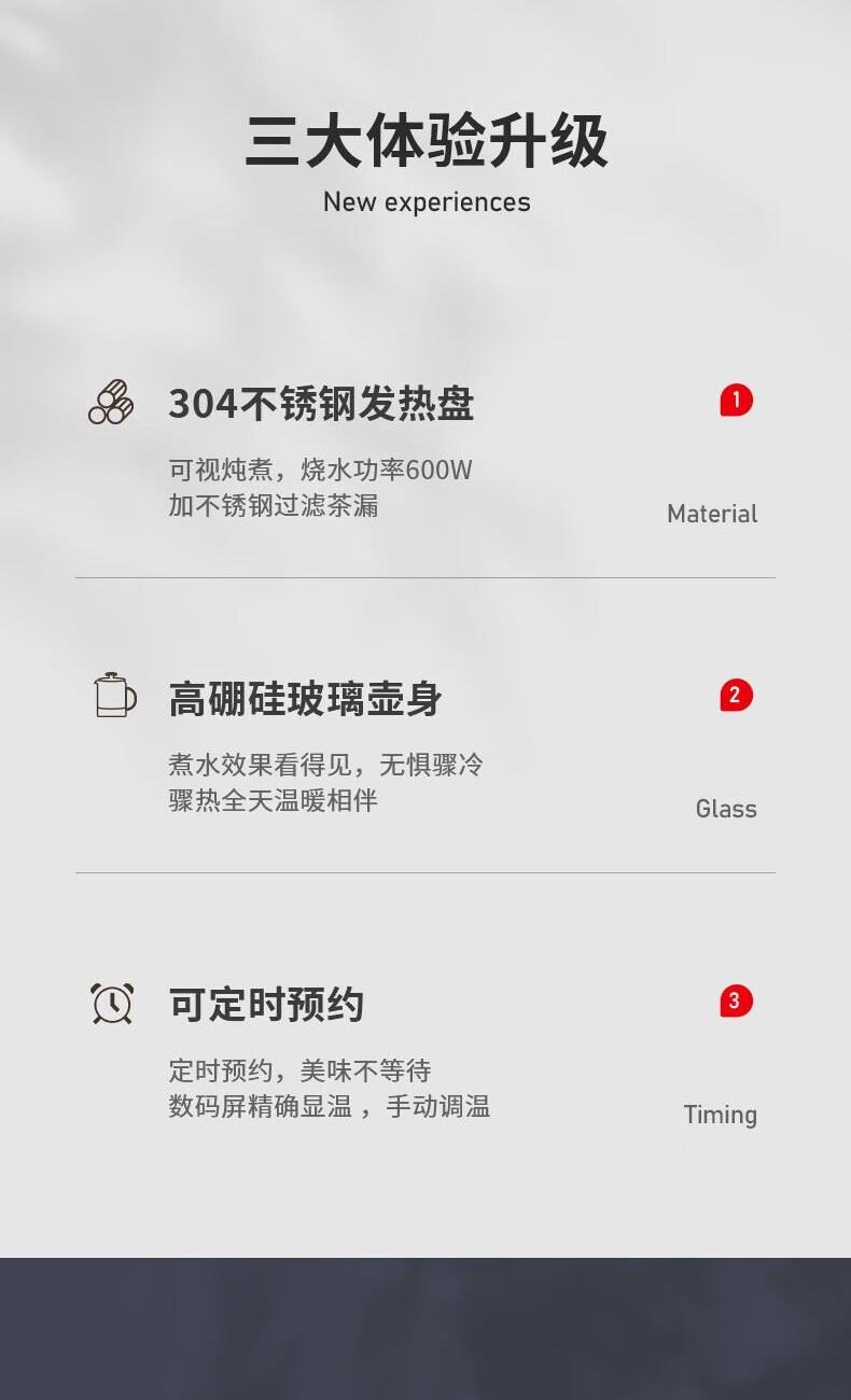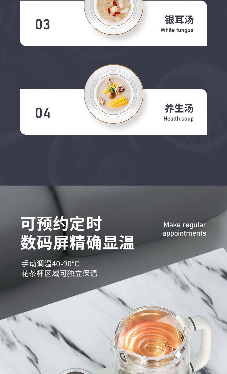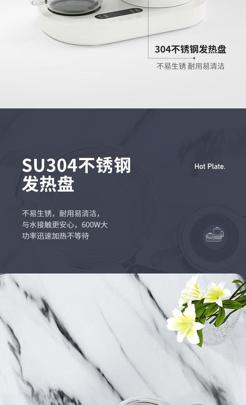 产品颜色:白色 产品材质:PP、高硼硅玻璃、304不锈钢 额定频率:50Hz 额定电压:220V~ 产品容量:800ml 加热功率:600W 保温功率:10W 总功率:610W 产品尺寸:210x195x310mm 产品净重:1.19KG 商品条形码:6971849440408 可视炖煮,烧水功率600W,加304不锈钢过滤茶漏。 高硼硅玻璃壶身,无惧骤冷、骤热全天温暖相伴。 可定时预约,数码屏实时显温,手动调温。 泡煮+暖饮,一杯一壶二合一。 内置智能芯片,根据菜单切换火力烹素。 SU304不锈钢发热盘,600W功率迅速加热不等待。