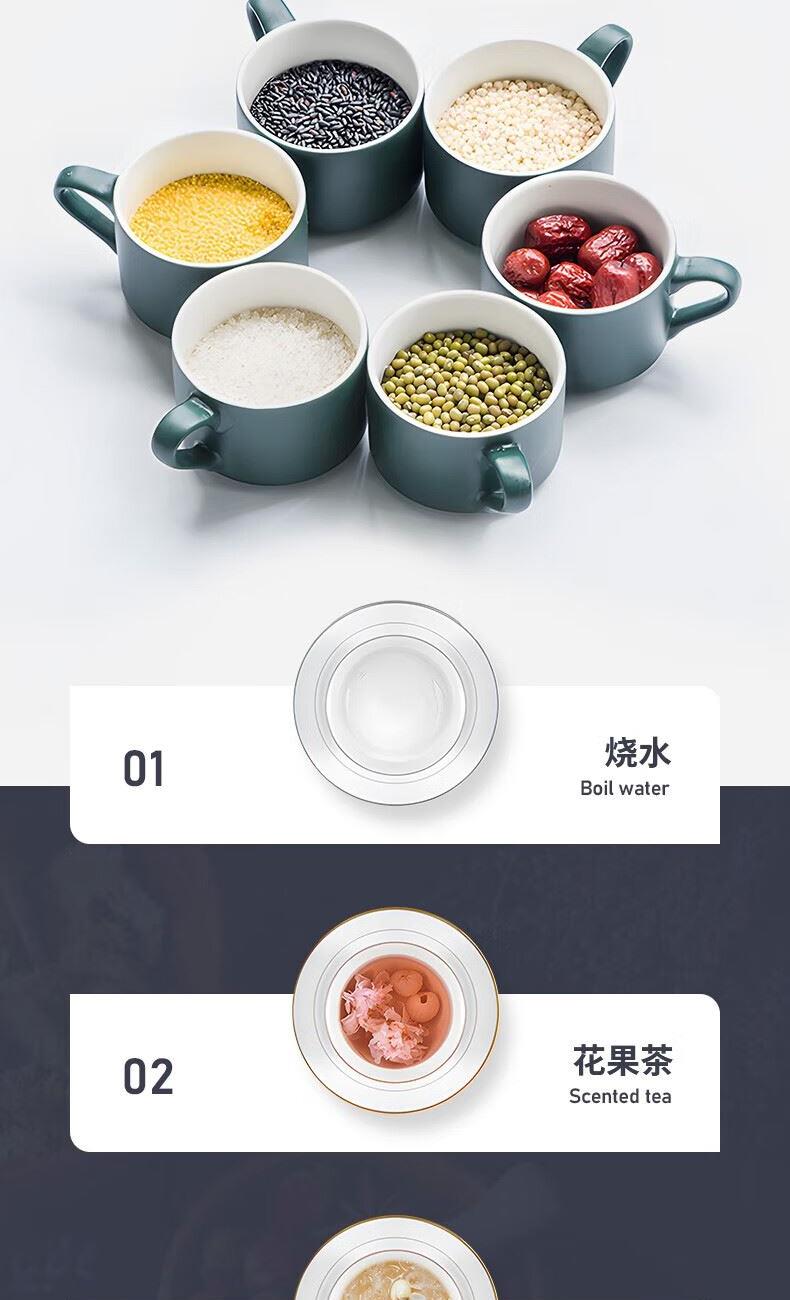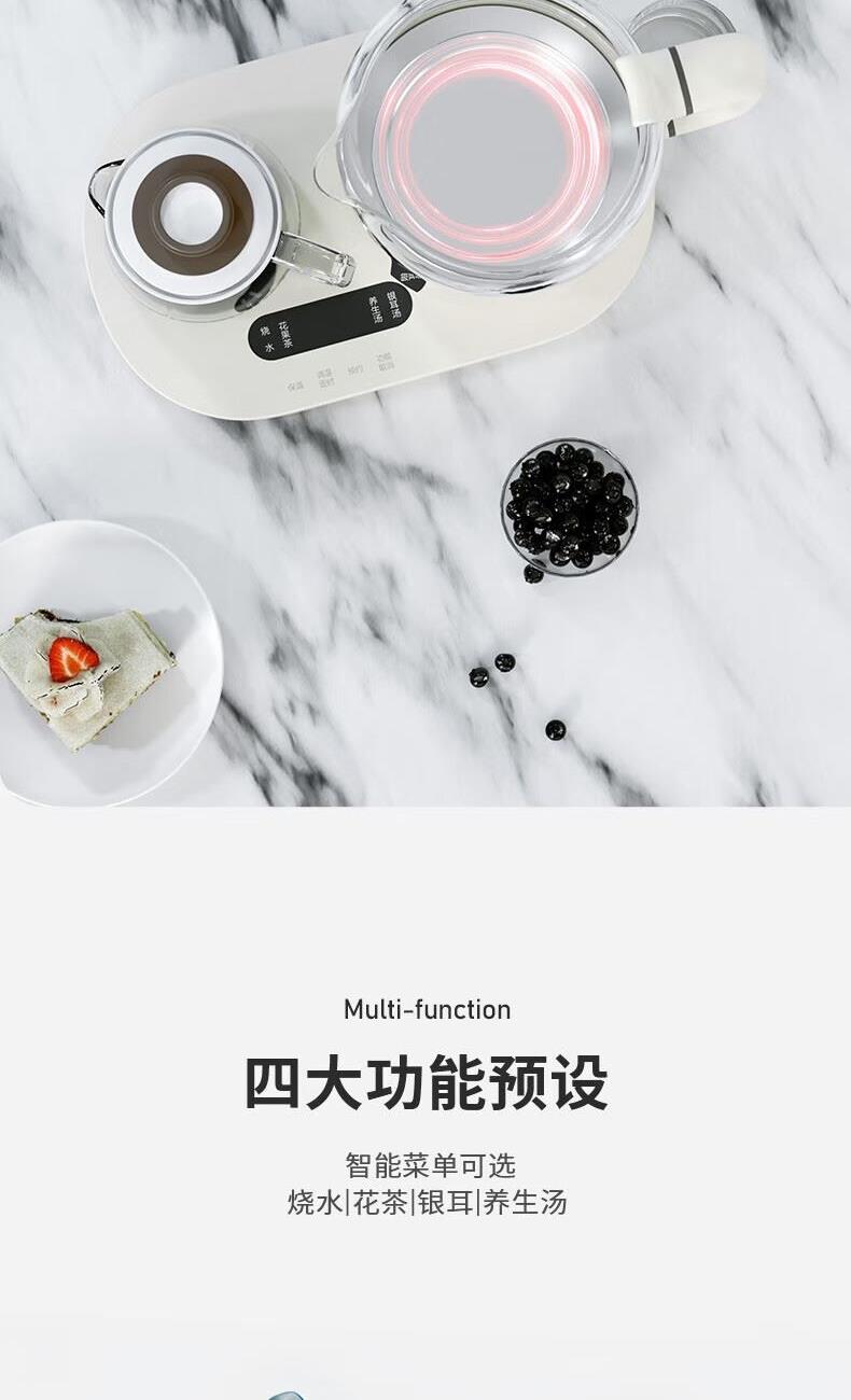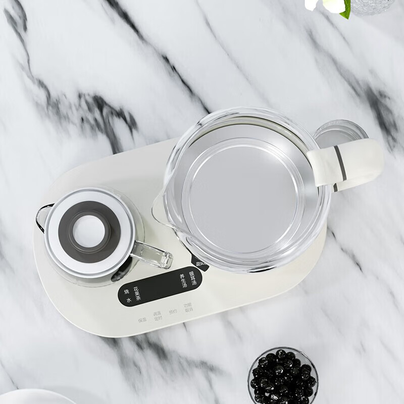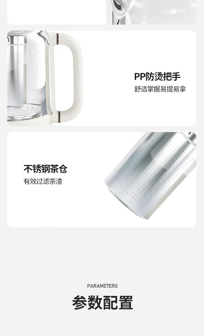 产品颜色:白色 产品材质:PP、高硼硅玻璃、304不锈钢 额定频率:50Hz 额定电压:220V~ 产品容量:800ml 加热功率:600W 保温功率:10W 总功率:610W 产品尺寸:210x195x310mm 产品净重:1.19KG 商品条形码:6971849440408 可视炖煮,烧水功率600W,加304不锈钢过滤茶漏。 高硼硅玻璃壶身,无惧骤冷、骤热全天温暖相伴。 可定时预约,数码屏实时显温,手动调温。 泡煮+暖饮,一杯一壶二合一。 内置智能芯片,根据菜单切换火力烹素。 SU304不锈钢发热盘,600W功率迅速加热不等待。
