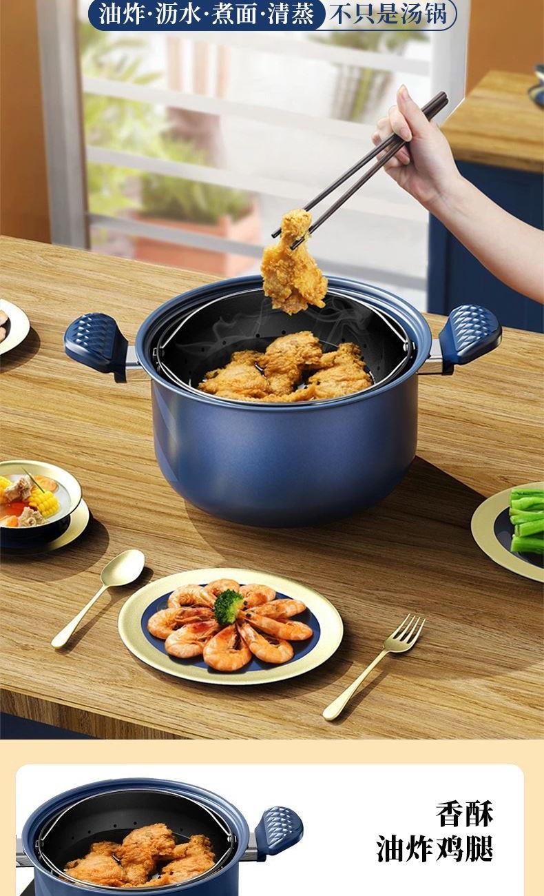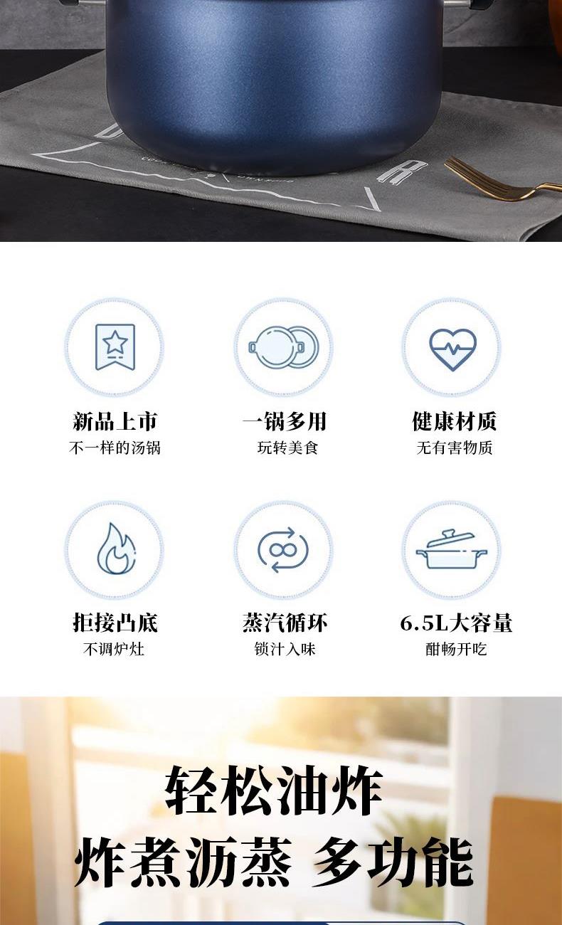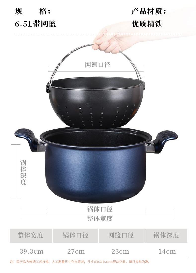 规 格:6.5L带网篮 材 质:优质精铁 彩盒尺寸:L41*W30*H16.5CM 1,精铁锅身,内置可旋转沥水篮 2,钻石纹胶木侧耳、盖珠,喷软漆。(另加不锈钢提手) 3,水性黑色不沾,外彩色高温漆 4,锅耳及盖珠采用砖石切割设计美观实用