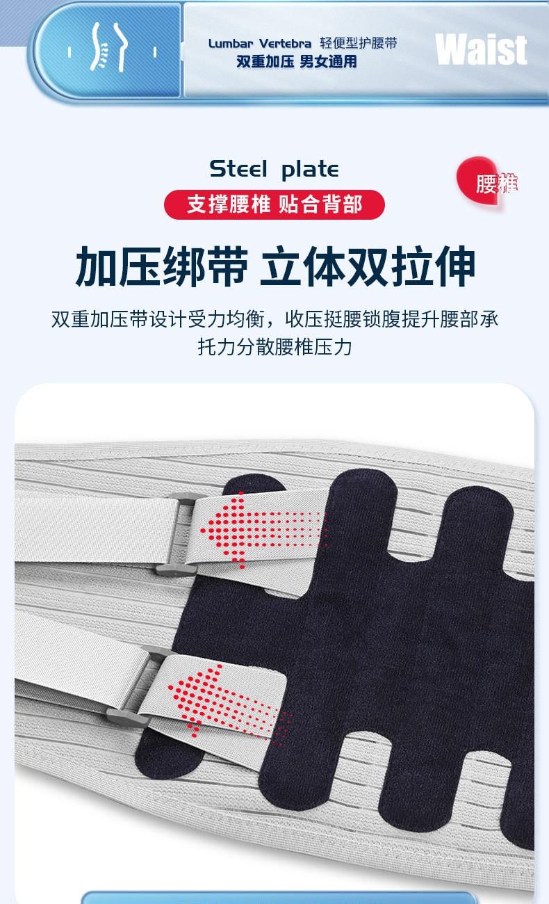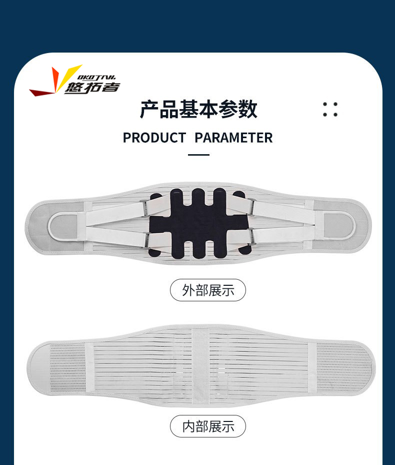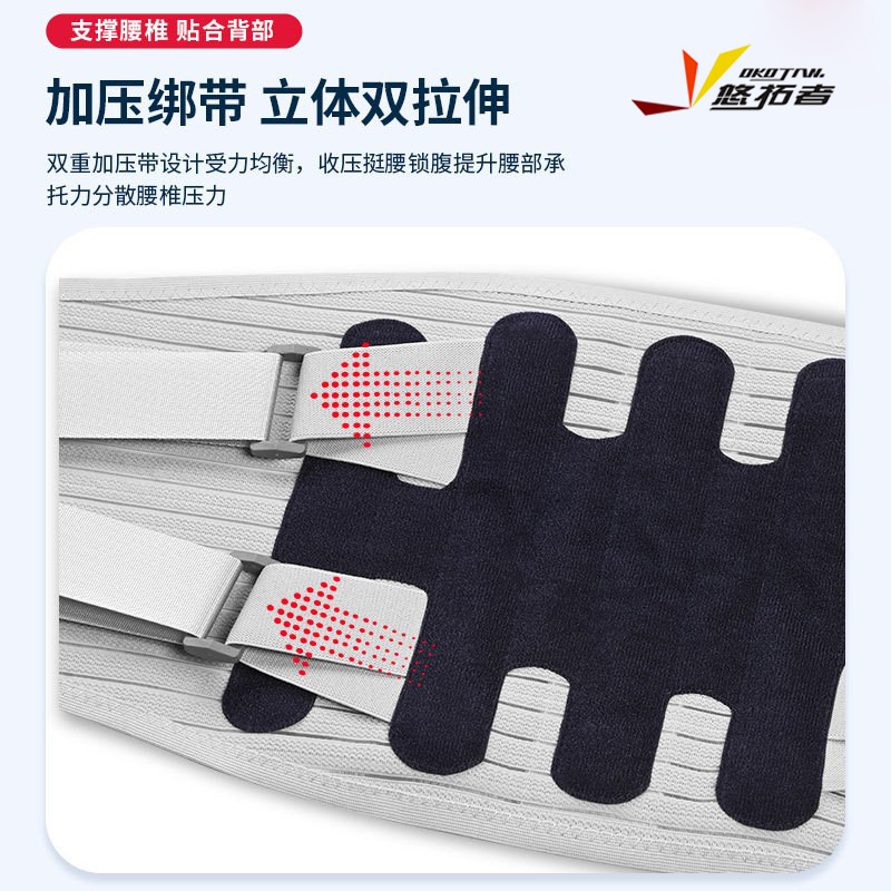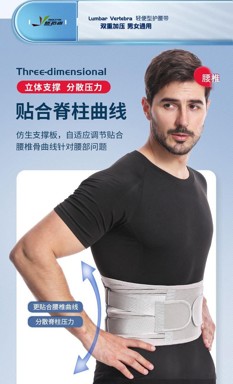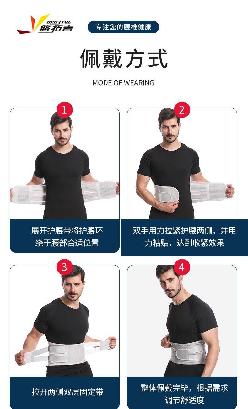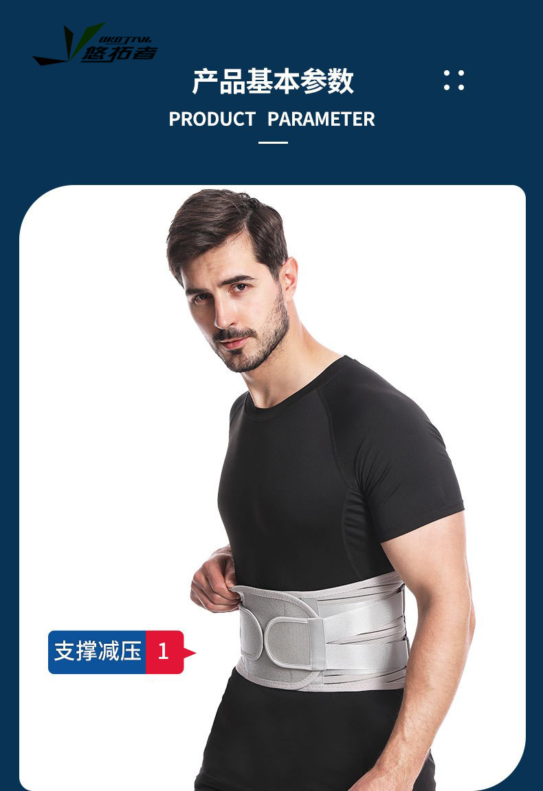 货号:YT-JK006 配置:护腰X1+垫片X3 规格:M/L/XL/XXL 材质:牛津布、松紧螺纹、钢板 颜色:图片色 产品描述: 1.透气网面,舒适不闷热 2.腰部支撑,保护腰椎 3.弹力织带,支撑钢板,双重固定防护 4.适用人群:久坐、腰椎不适、运动防护、产后塑性等人群