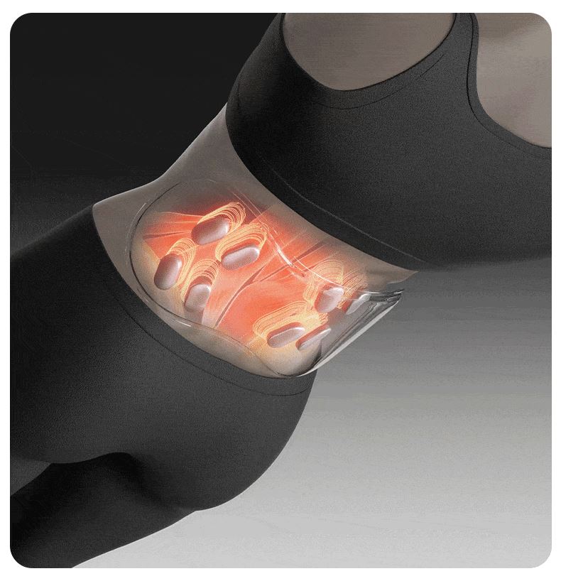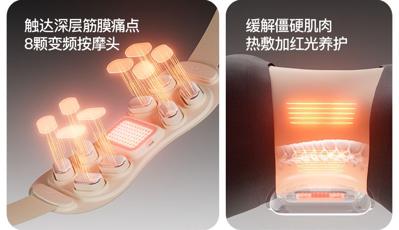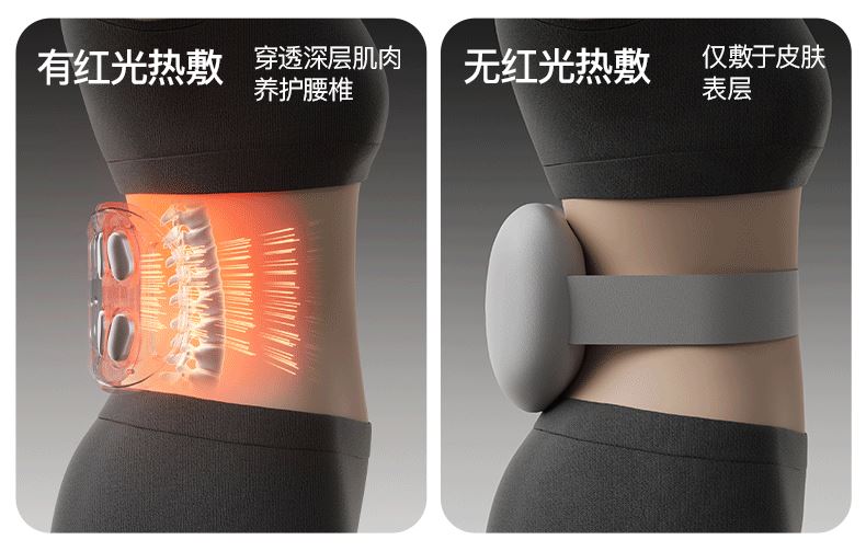 ●按摩头有热敷,亦有红光热敷,深入腰椎舒缓疲劳,按摩时打开红光+热敷模式,释放660nm波长红光可穿透肌肉表层,增强养护力