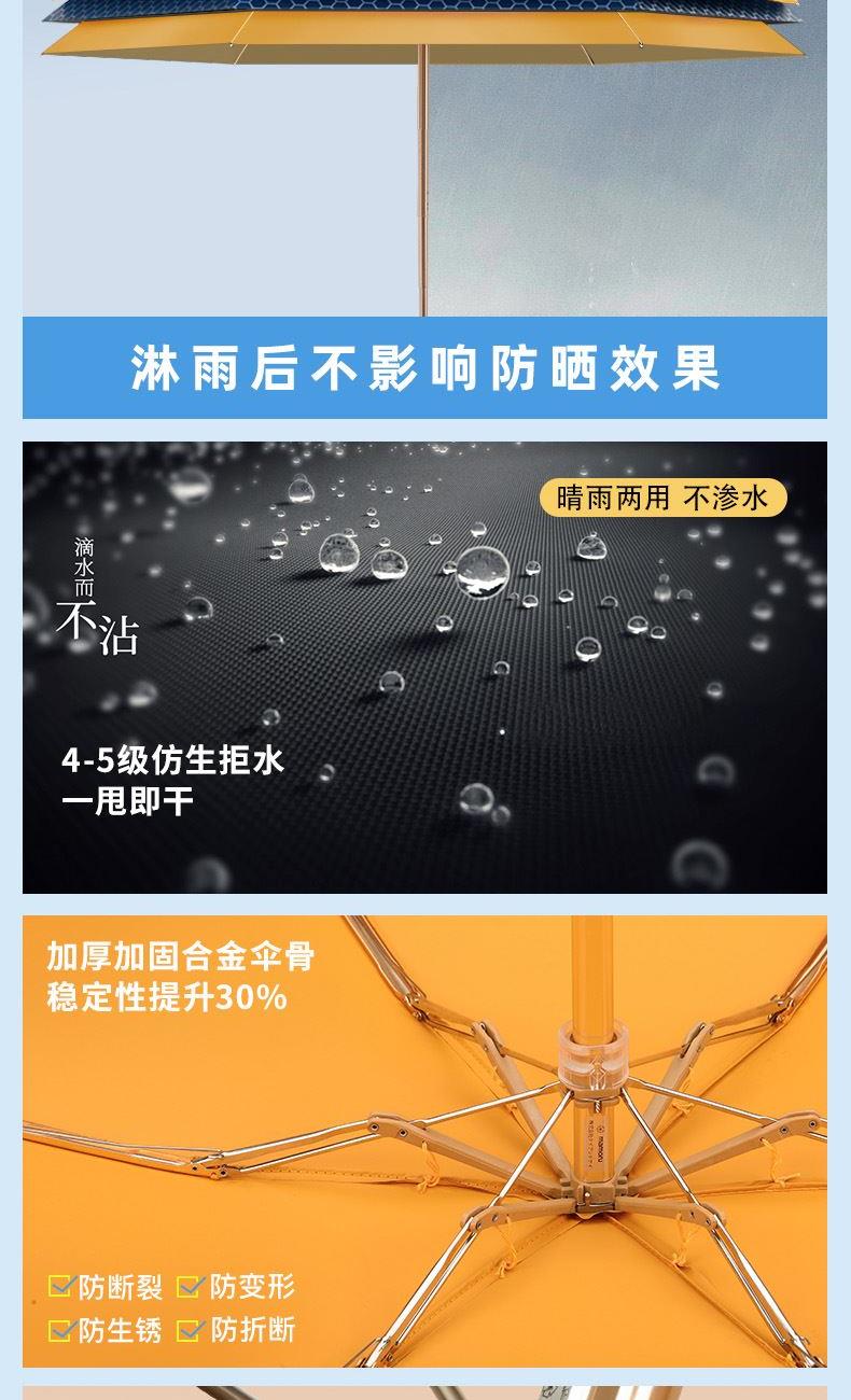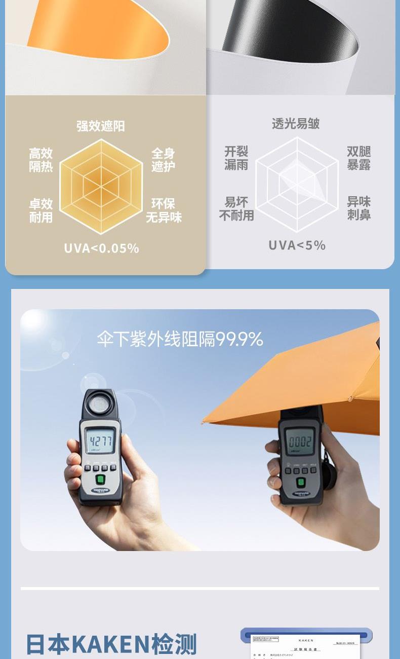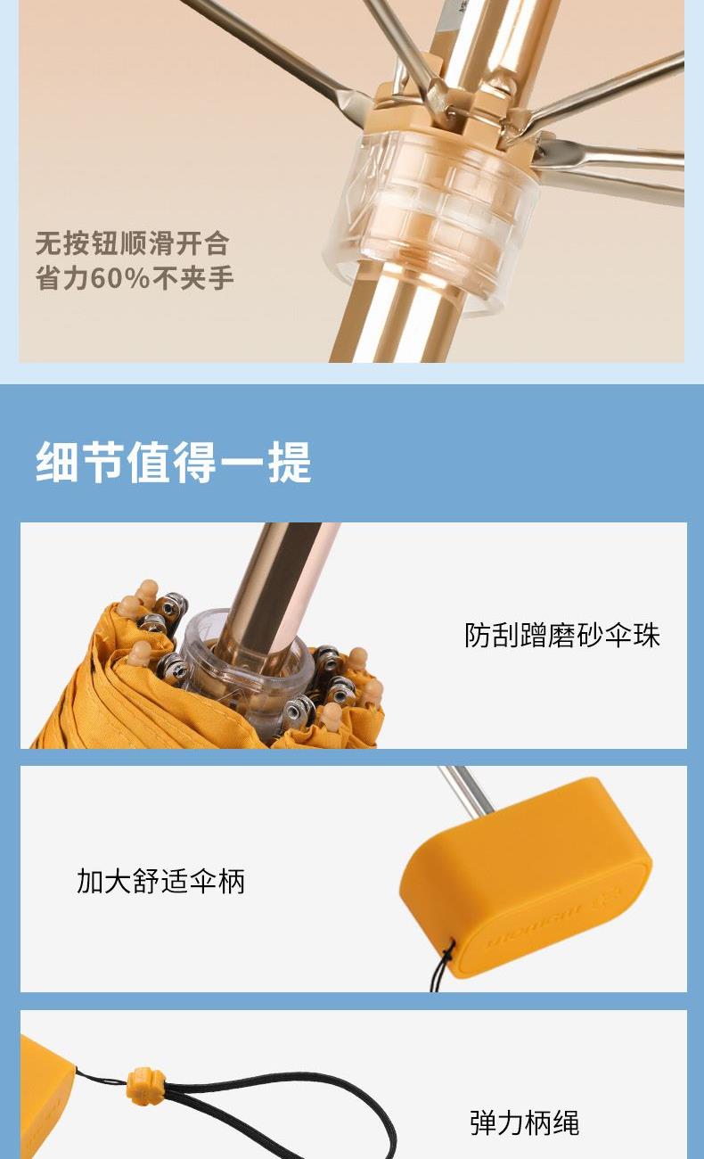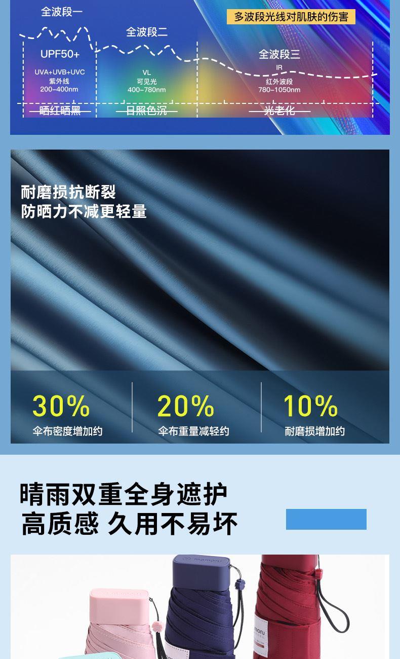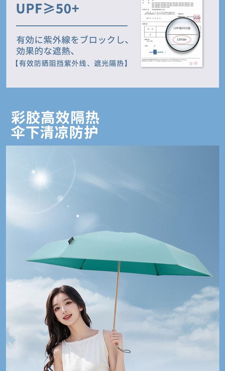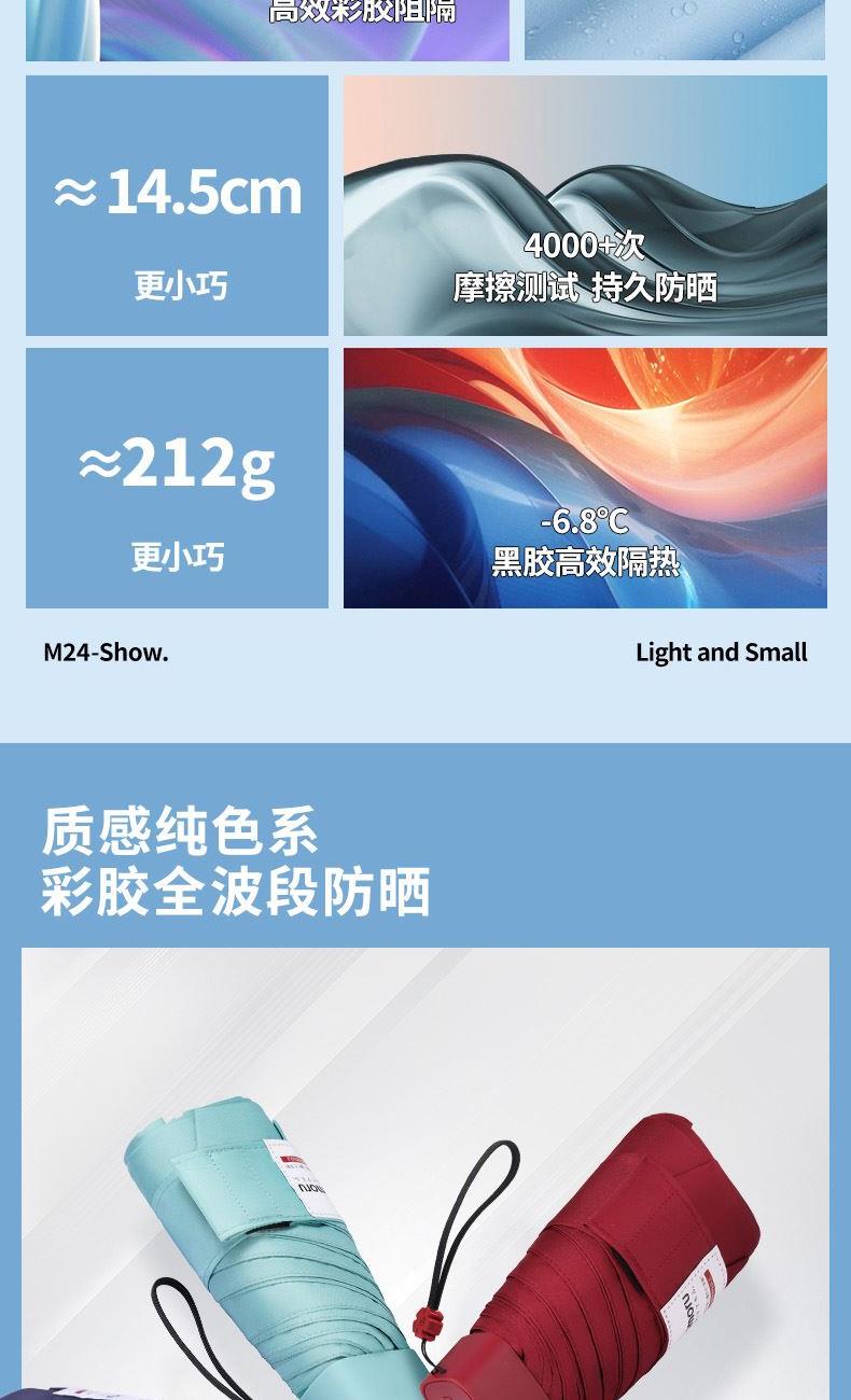 1、小巧便携,收起长度14.5CM,重量230g 2、采用30D彩胶贴合面料,比普通黑胶大大提高了伞的整体颜值,手感好,遮光99.99%,防晒UPF50+,伞下体感降温超过10°以上 3、便携式手袋设计,高颜值高品质体现 颜色分类: (六折)防晒伞手袋版酒红 (六折)防晒伞手袋版橘色 (六折)防晒伞手袋版湖蓝色 (六折)防晒伞手袋版浅绿色 (六折)防晒伞手袋版粉色