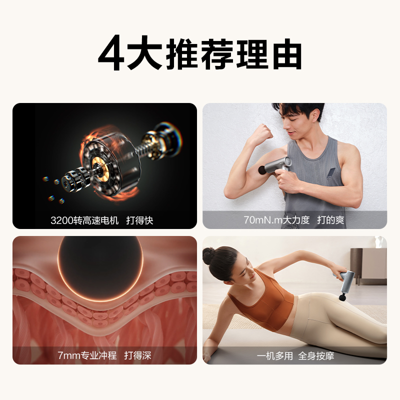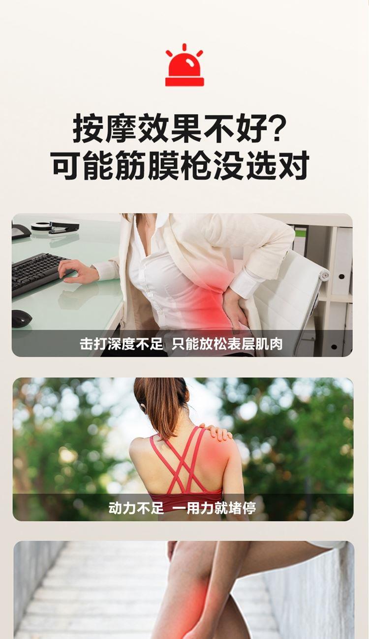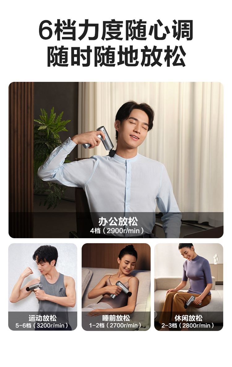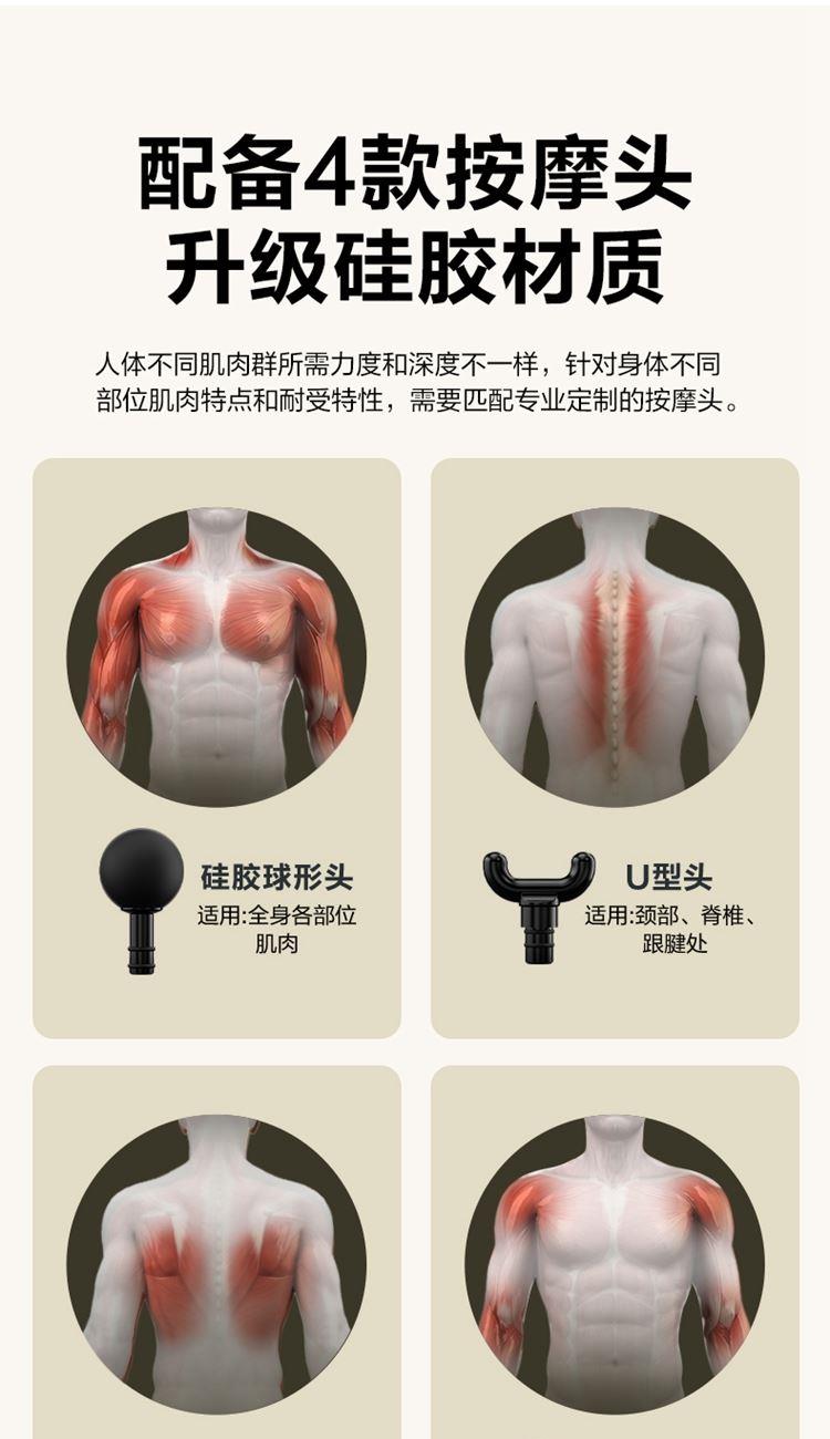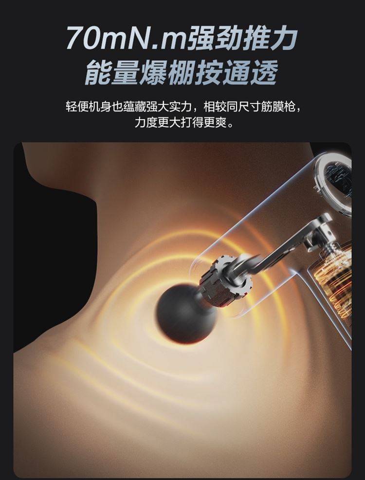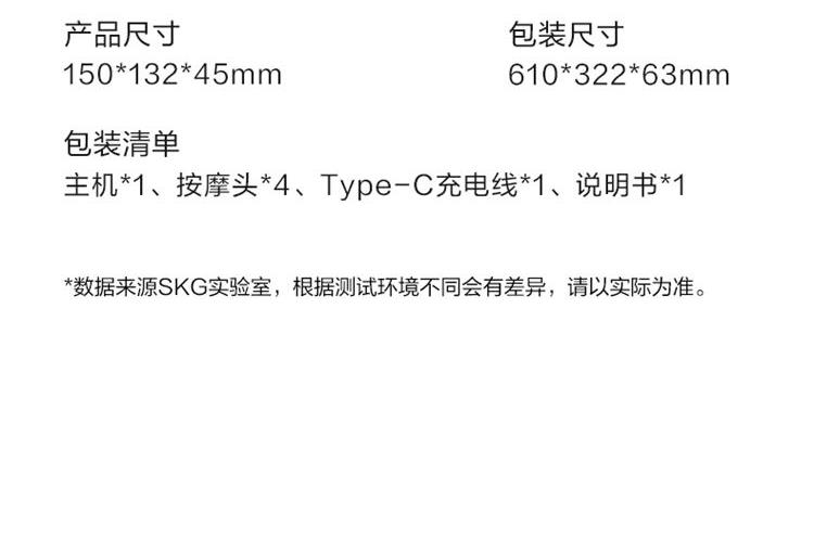 产品描述: 3200rpm高转速电机 7mm冲程 7kgf推力 70mN.m大扭矩电机 2600~3200rpm精细6档变速 动平衡减震降噪 按摩头:球形/平型/子弹/U型 产品参数: 机身材质:ABS/硅胶 电源电压:5V/10W 充电接口:Type-C 控制方式:机身按键 语音播报:无 电池容量:1800mAh锂电池 续航时间:4小时 按摩时间:15分钟 按摩模式:6档力度 热敷档位:无 温度挡位:/°C 单台毛重/净重:0.652/0.461kg 中箱尺寸:229*186*63mm