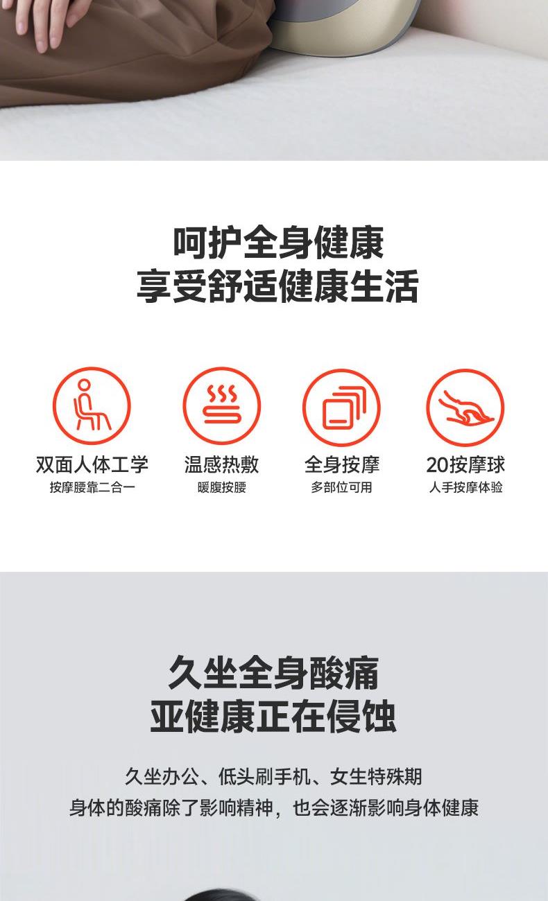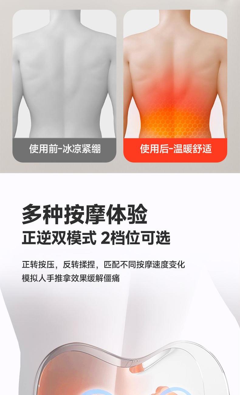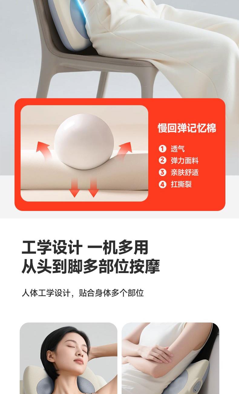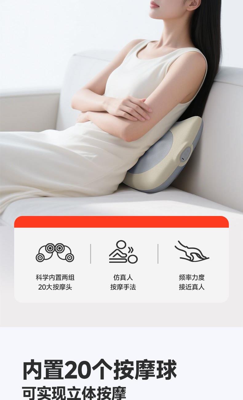 按摩腰靠2合一、全身多部位按摩 揉捏热敷,真人手法按摩、舒缓强劲双模式切换 每头十球,一共20个按摩球,立体按摩 慢回弹记忆棉、热敷按键,一键开关 额定功率:9W 净重/毛重:1.63g; 充电方式:Type-C, 包装尺寸:390*250*150mm 包装方式:彩邮外